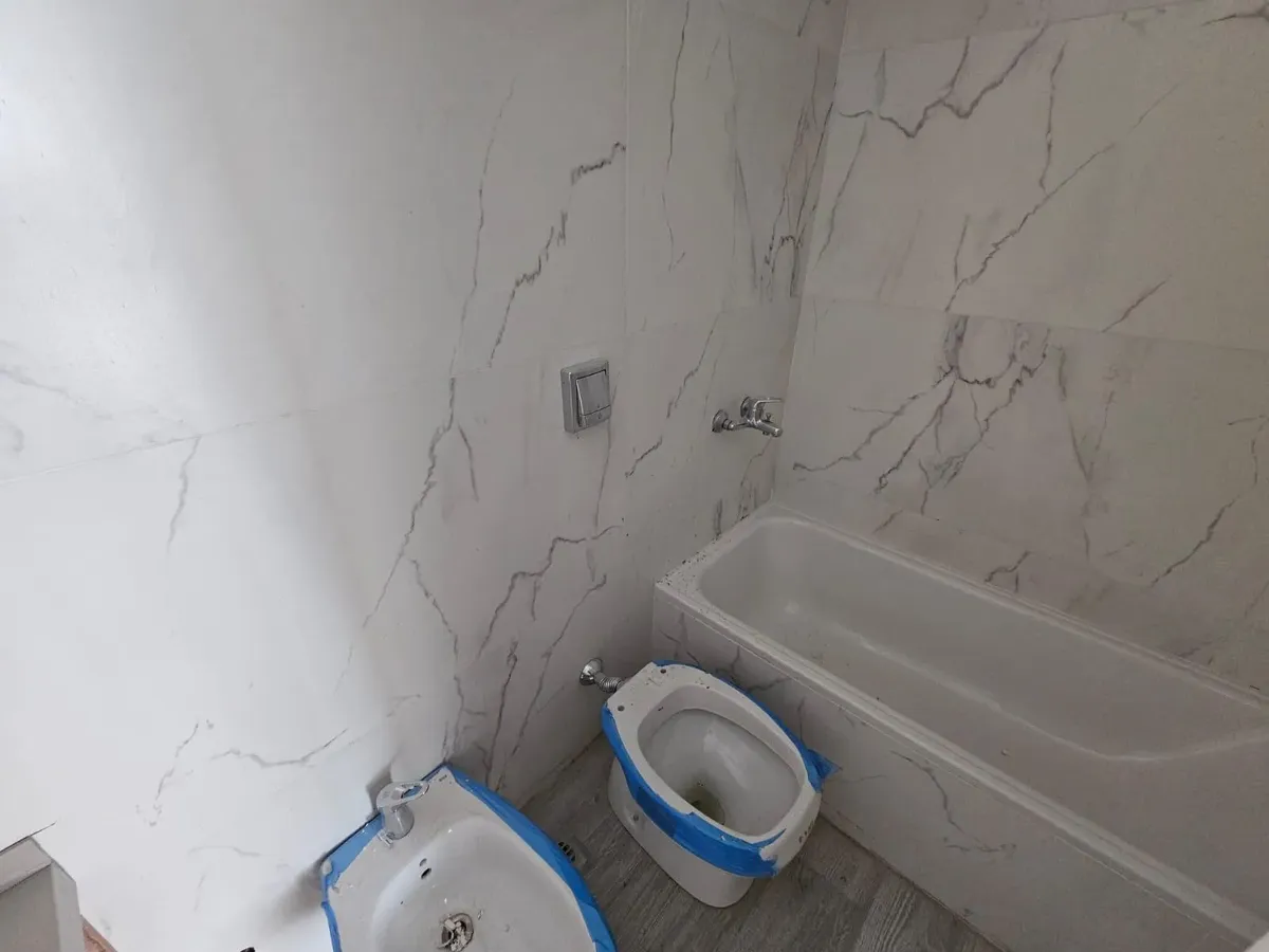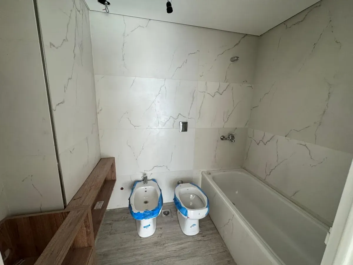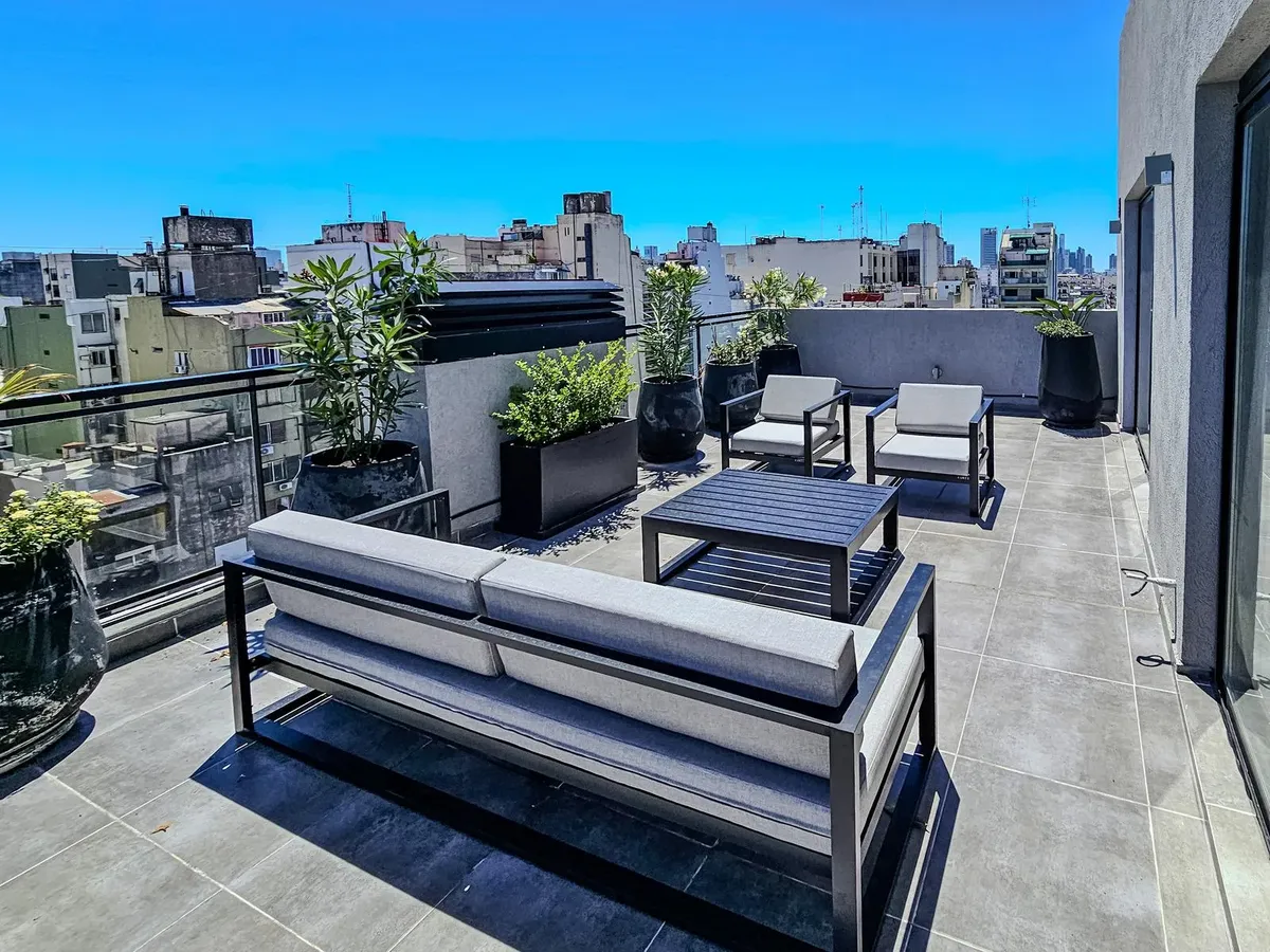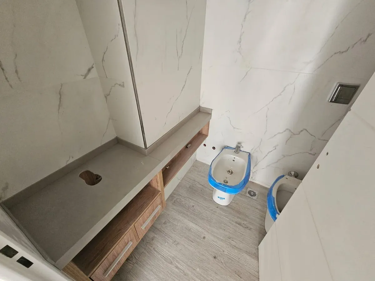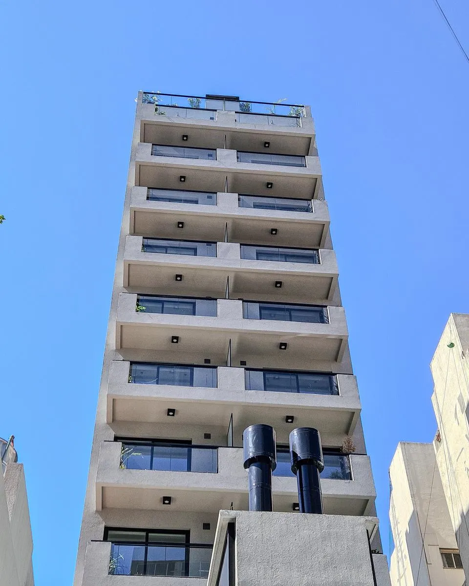 Квартира-студия в WeLive Venezuela в Monserrat. Окна на фасад, предусмотрены балконы и приватные террасы. Установлена кухонная столешница из purastone blanco nube, мойка из нержавеющей стали; нижние шкафы и навесные шкафы из меламина texturada; электрическая плита с 4 конфорками и электрическая духовка. Пол в зоне Estar - Comedor - Dormitorio — плавающий, под дерево; раздвижные фасады шкафов от пола до потолка с направляющими из алюминия; окна и балконные двери с алюминиевыми профилями чёрного ц
