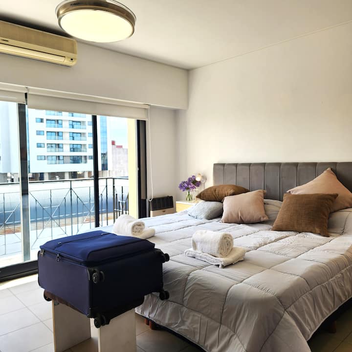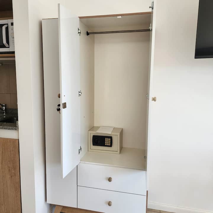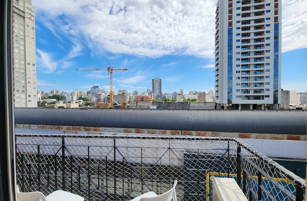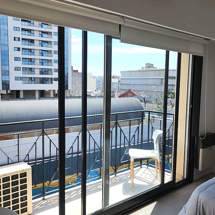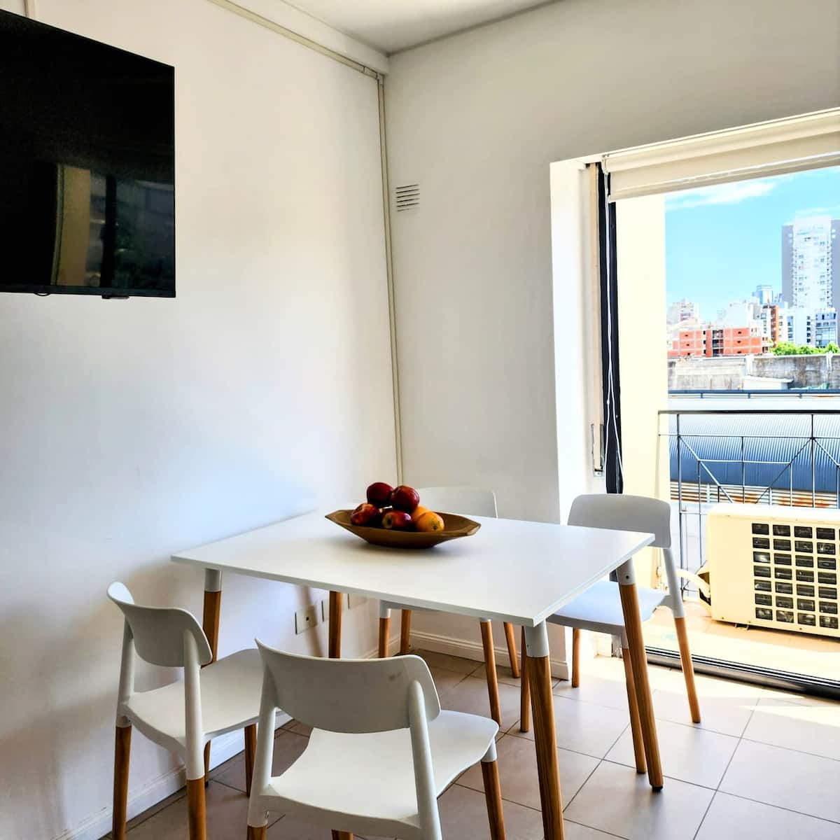 Квартира-студия с мебелью, 6-й этаж, окна с видом. В квартире установлены кровать king-size, входная дверь с защитой, цифровой сейф с кодом и видеонаблюдение в здании. Есть Wi-Fi и кабельное телевидение, потолочный вентилятор и кондиционер. Указаны: рядом Abasto Shopping, два квартала до станции Carlos Gardel на Av. Corrientes.