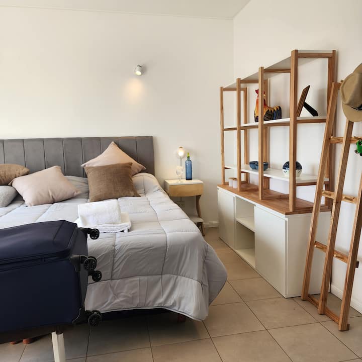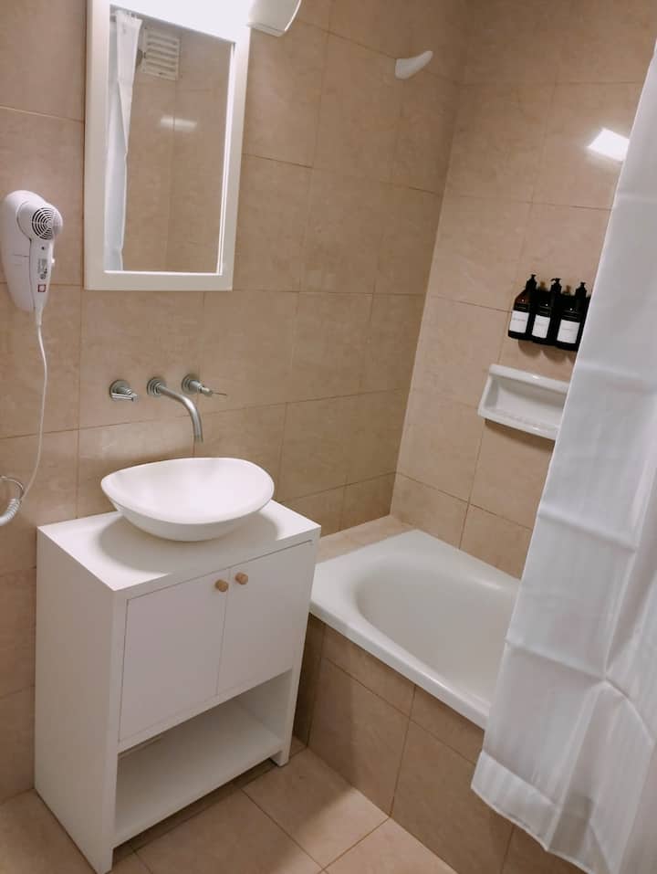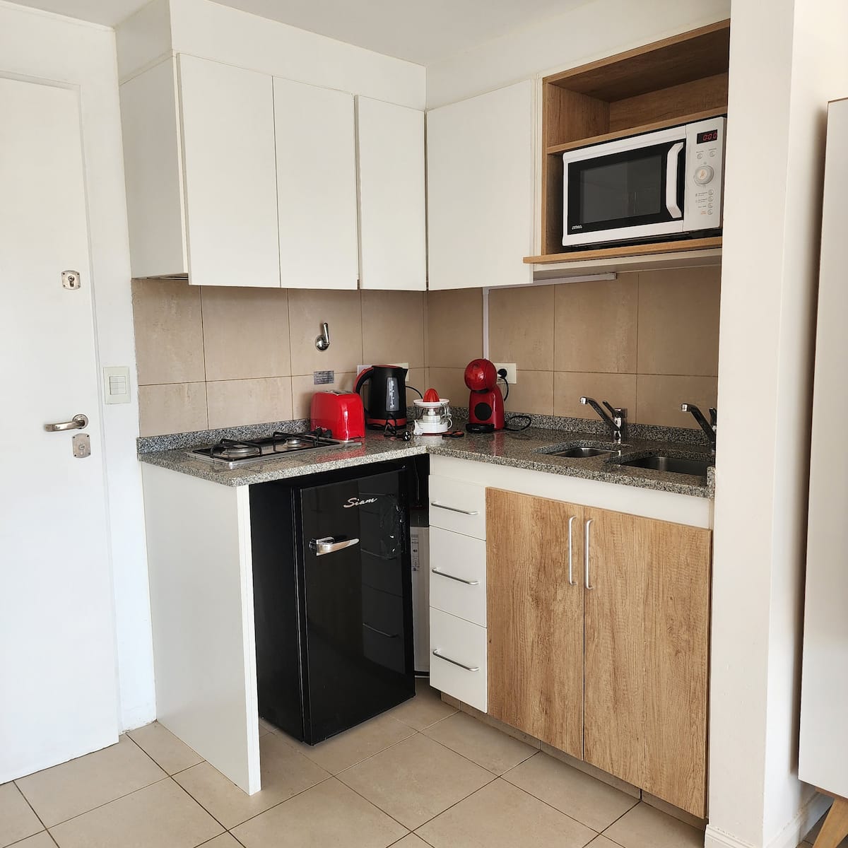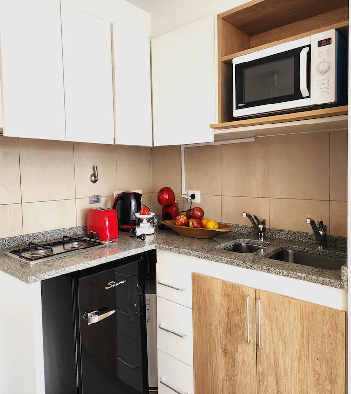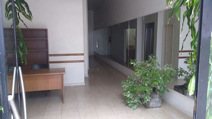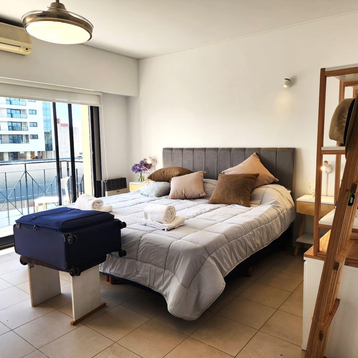 Квартира-студия с мебелью, 6-й этаж, окна с видом. В квартире установлены кровать king-size, входная дверь с защитой, цифровой сейф с кодом и видеонаблюдение в здании. Есть Wi-Fi и кабельное телевидение, потолочный вентилятор и кондиционер. Указаны: рядом Abasto Shopping, два квартала до станции Carlos Gardel на Av. Corrientes.
