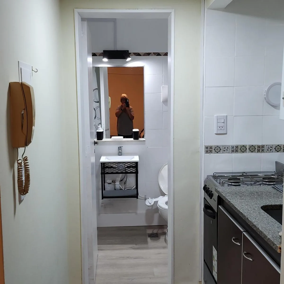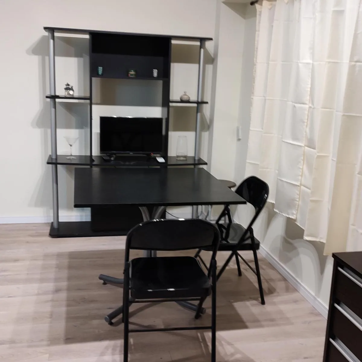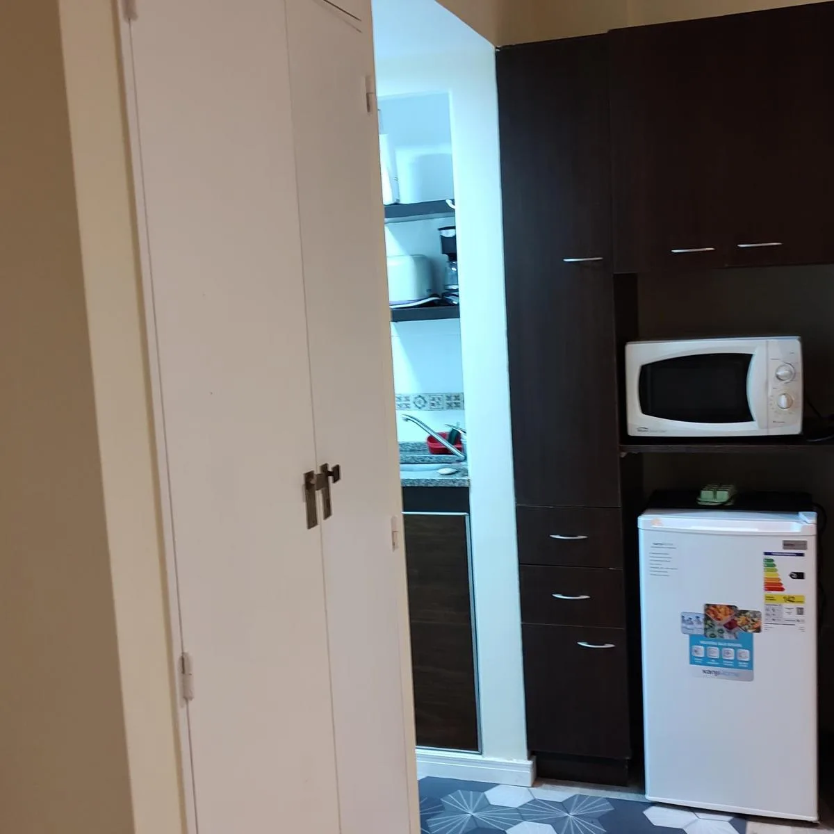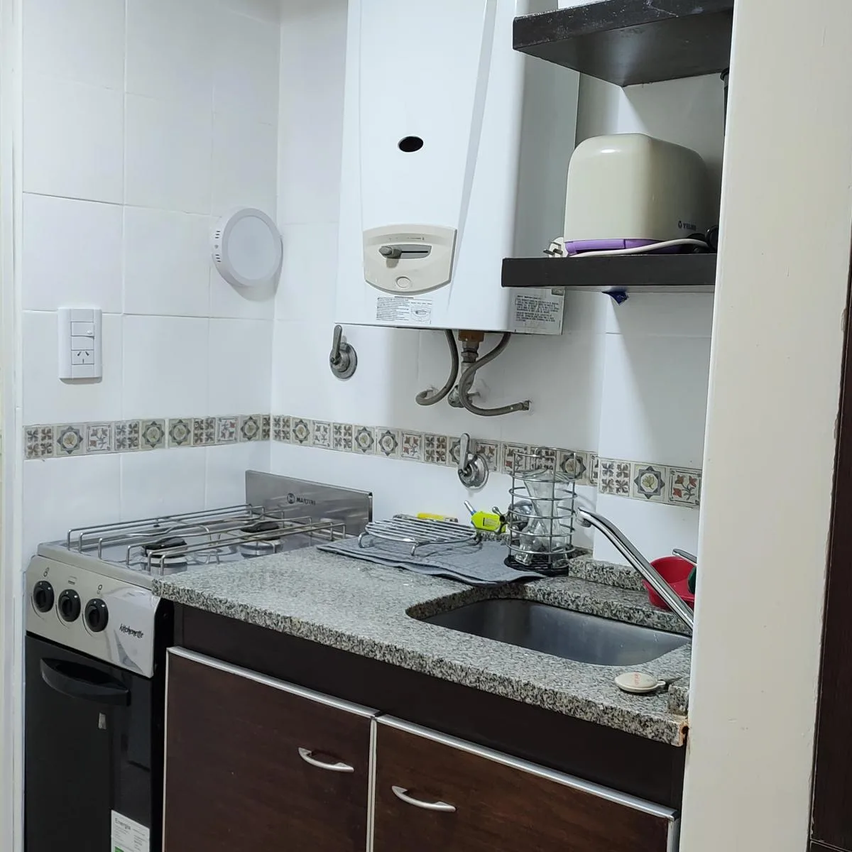 Квартира-студия в аренду с мебелью и оборудованием, с кондиционером «холод/тепло». В студии есть мини-кухня с газовой плитой (2 конфорки и духовка), навесной шкаф и нижние шкафы, бойлер, холодильник, платяной шкаф и ящики, телевизор LED 24 дюйма, стол и стулья. Также предусмотрены 2 односпальные кровати (по одной на 1 спальное место), душевая, bidematic, отдельная прачечная с раковиной и сушилкой. Временная аренда на 1–3 месяца: 800.000 $ в месяц; включены коммунальные платежи здания, ABL и AYSA