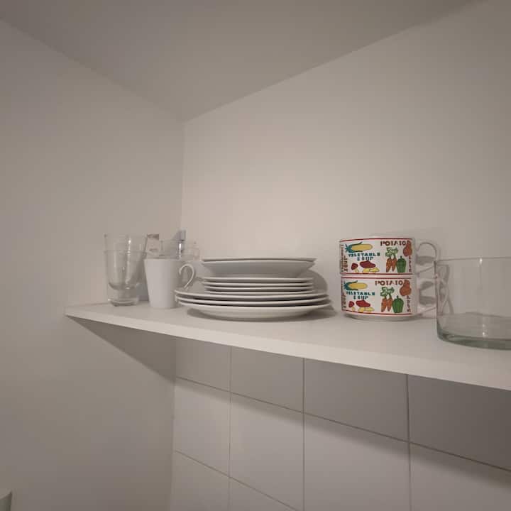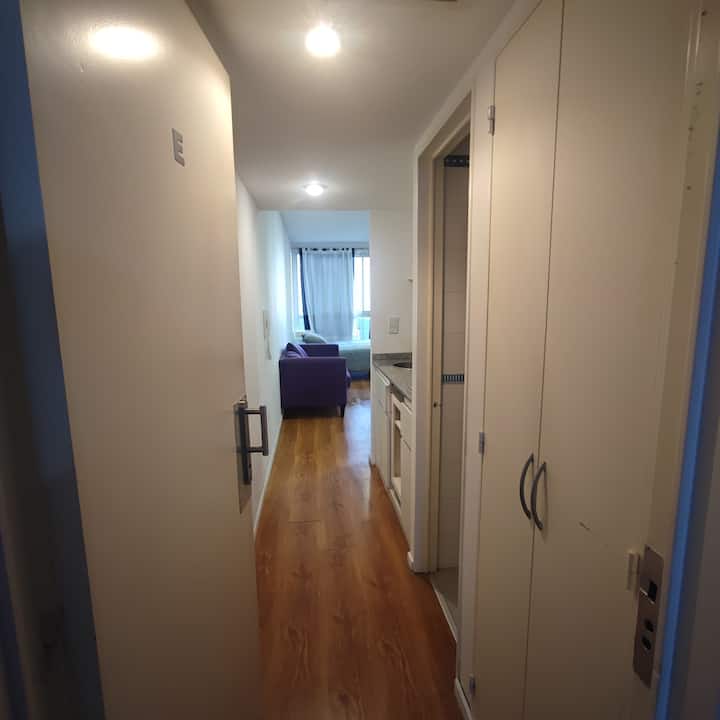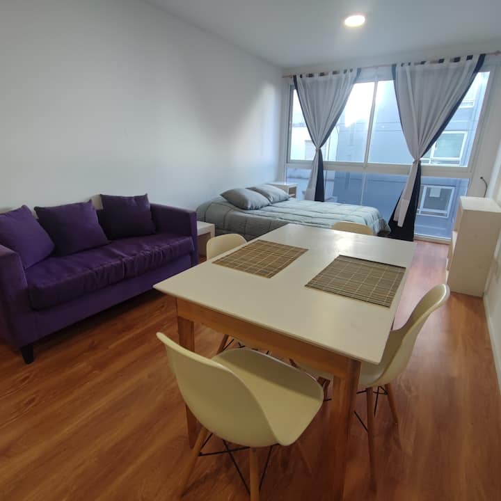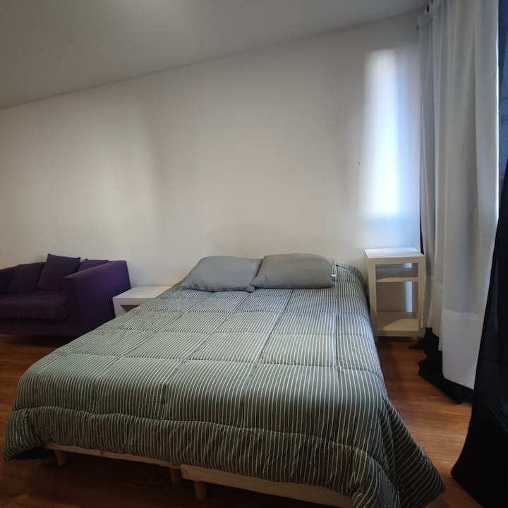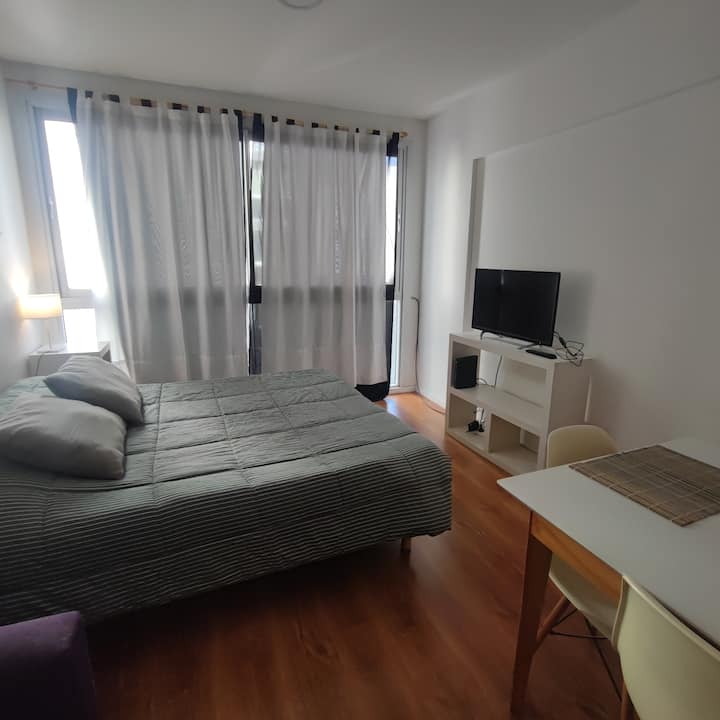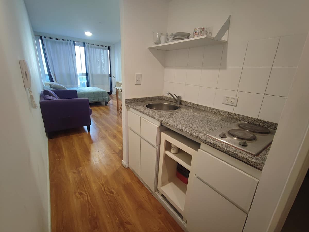 Квартира-студия в Balvanera. Кухня оборудована базовыми бытовыми принадлежностями, есть телевизор и Wi‑Fi. Расстояния в описании: 300 метров до станций метро линий A и B, 4 квартала до Congreso Nacional, 2 квартала до Avenida Callao, 1 квартал до Av. Rivadavia и 3 квартала до Av. Corrientes.