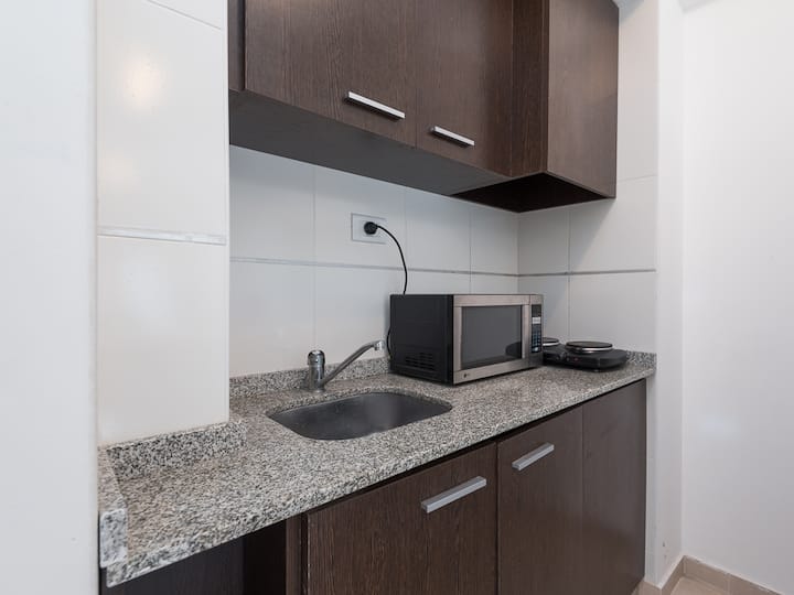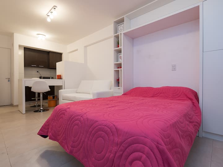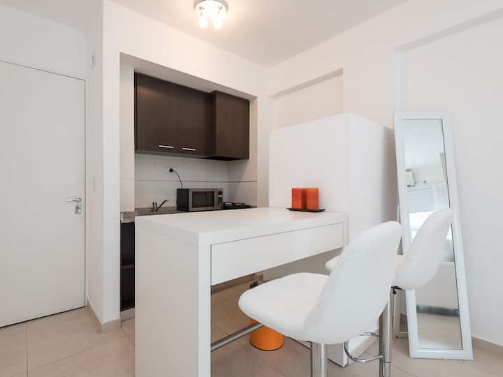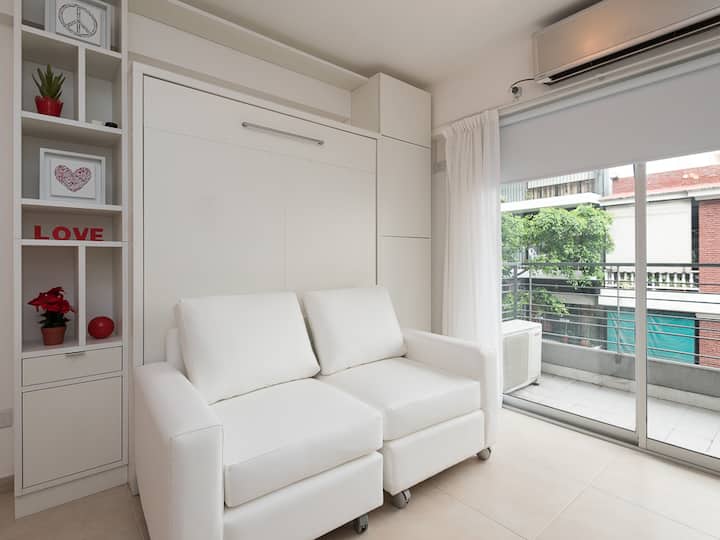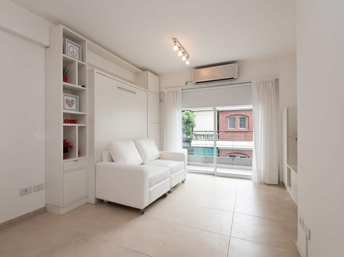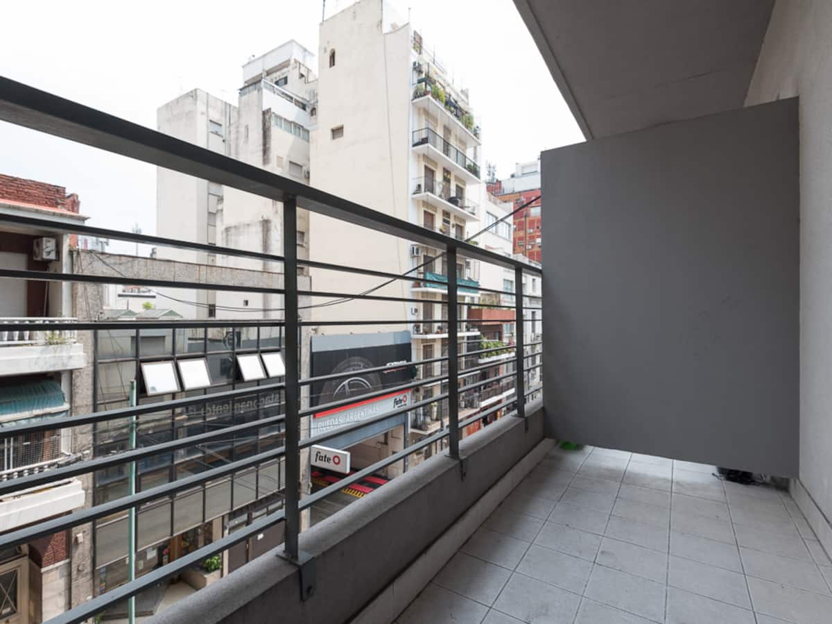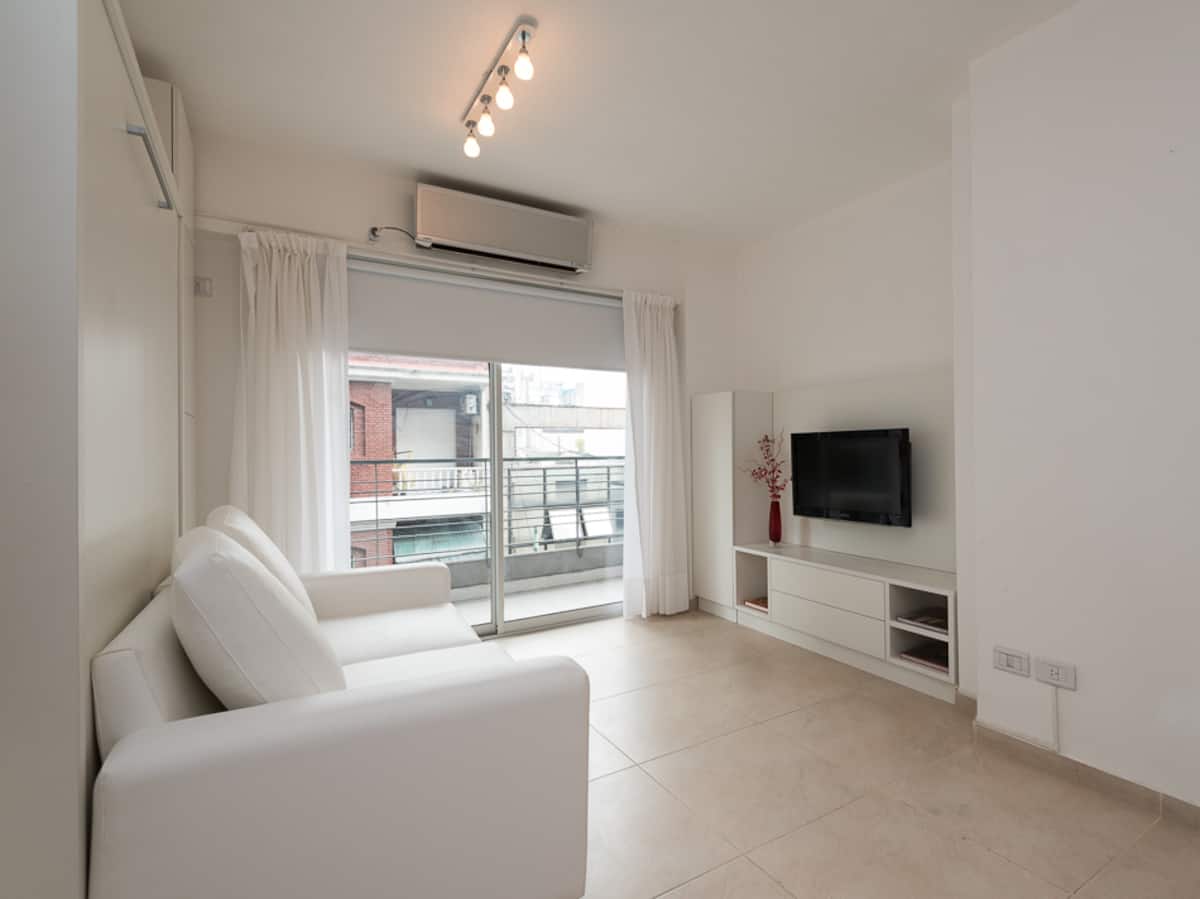 Квартира-студия площадью не указана, с мебелью, для временного проживания в Balvanera. В комнате стоят двуспальная раскладная кровать и диван. Есть 2 ванные комнаты с душем, кухня с электрической конфоркой и большая лоджия (балкон). В здании предусмотрены терраса, солярий и прачечная.