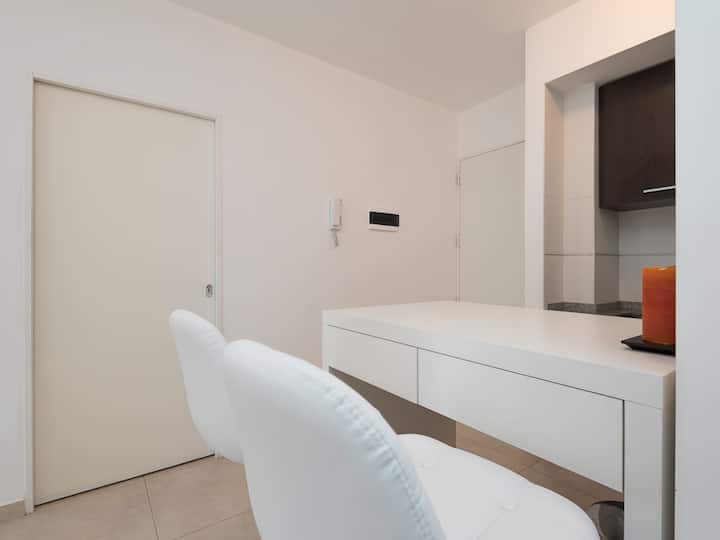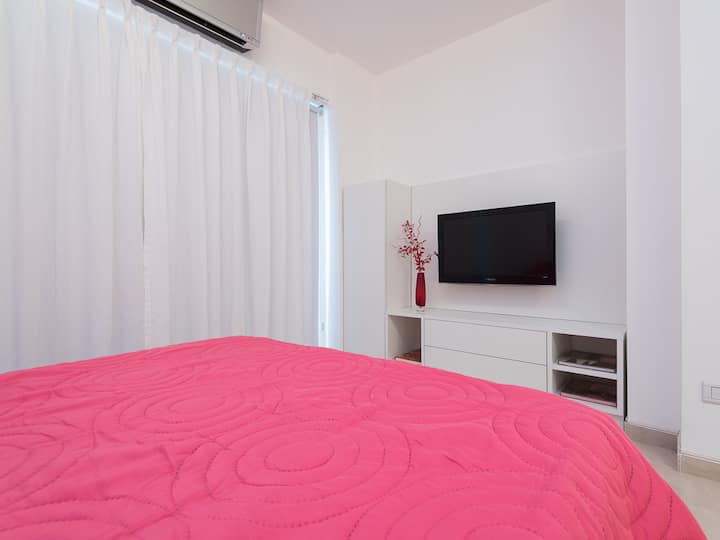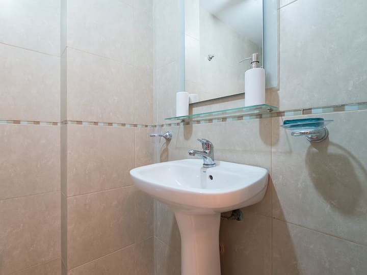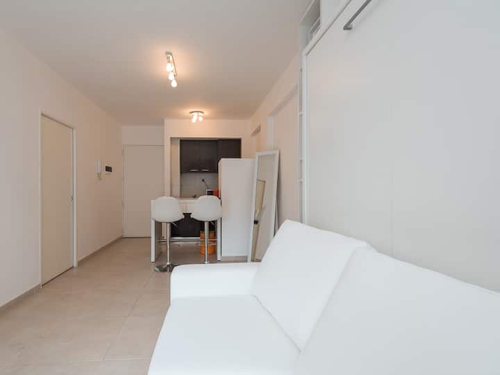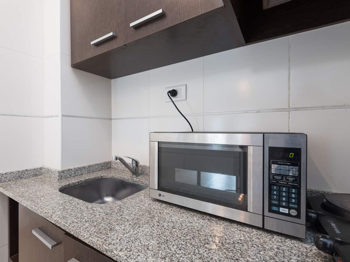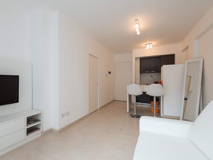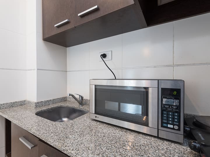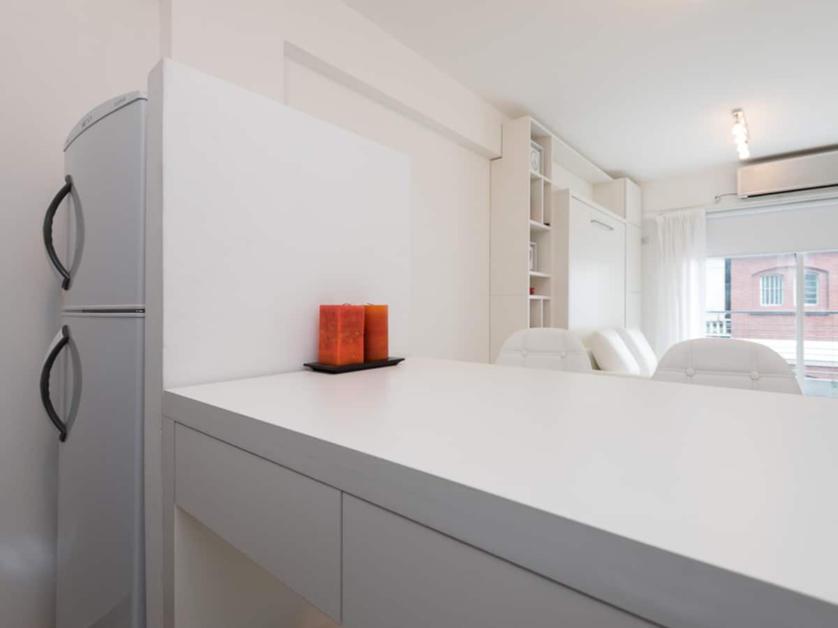Квартира-студия площадью не указана, с мебелью, для временного проживания в Balvanera. В комнате стоят двуспальная раскладная кровать и диван. Есть 2 ванные комнаты с душем, кухня с электрической конфоркой и большая лоджия (балкон). В здании предусмотрены терраса, солярий и прачечная.