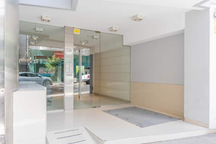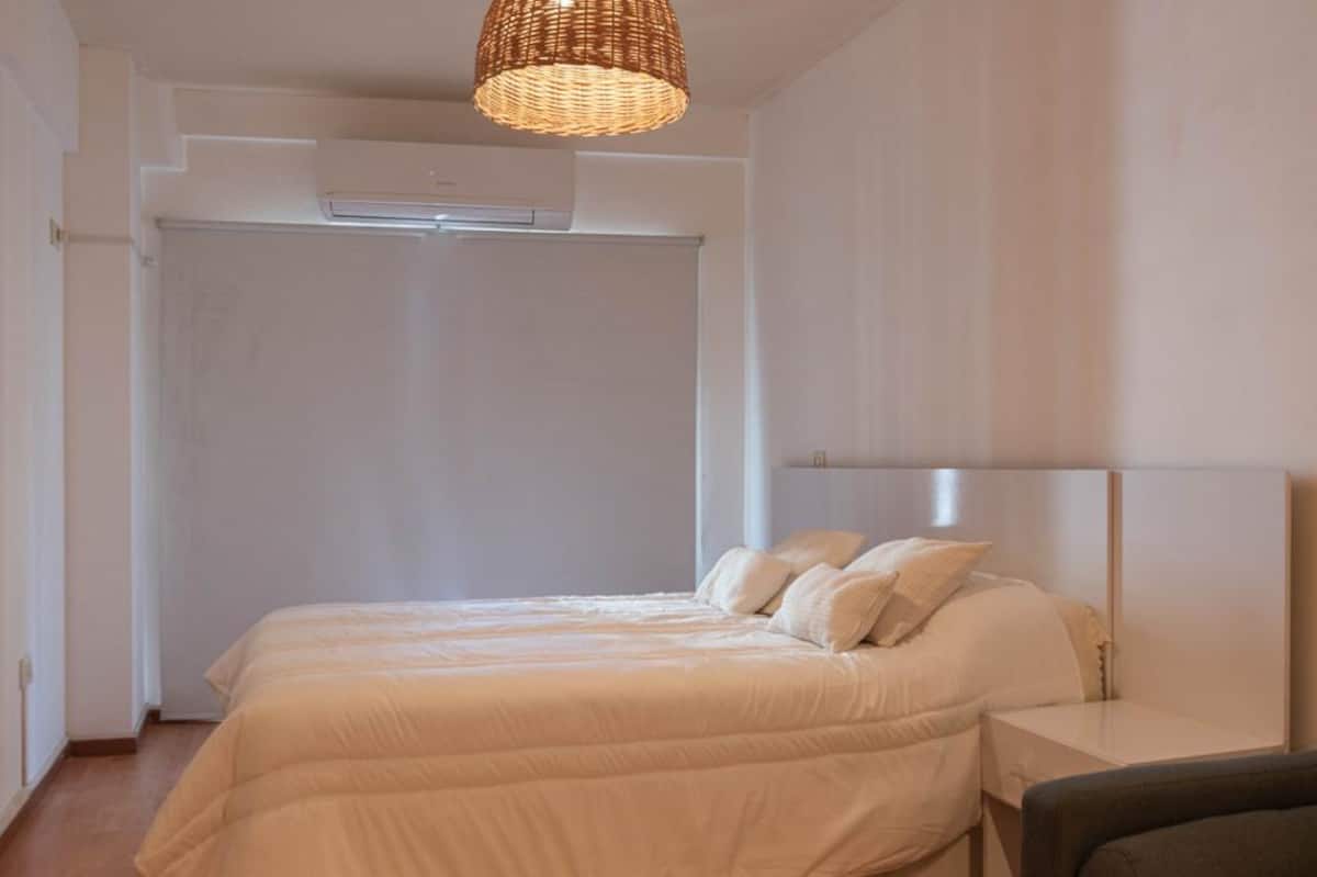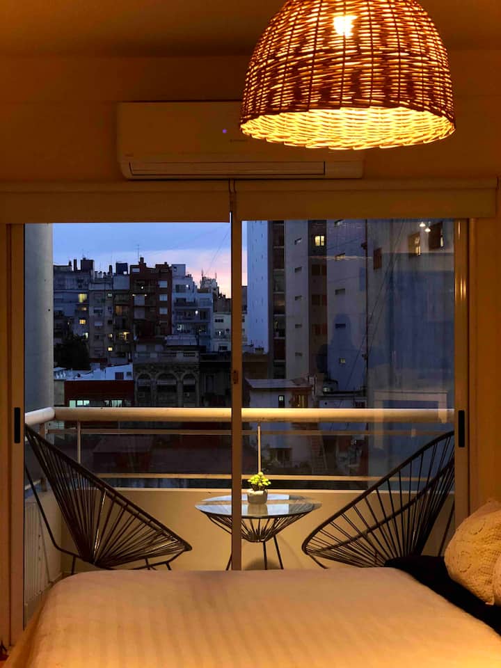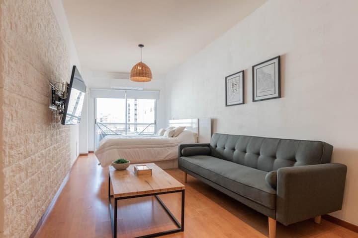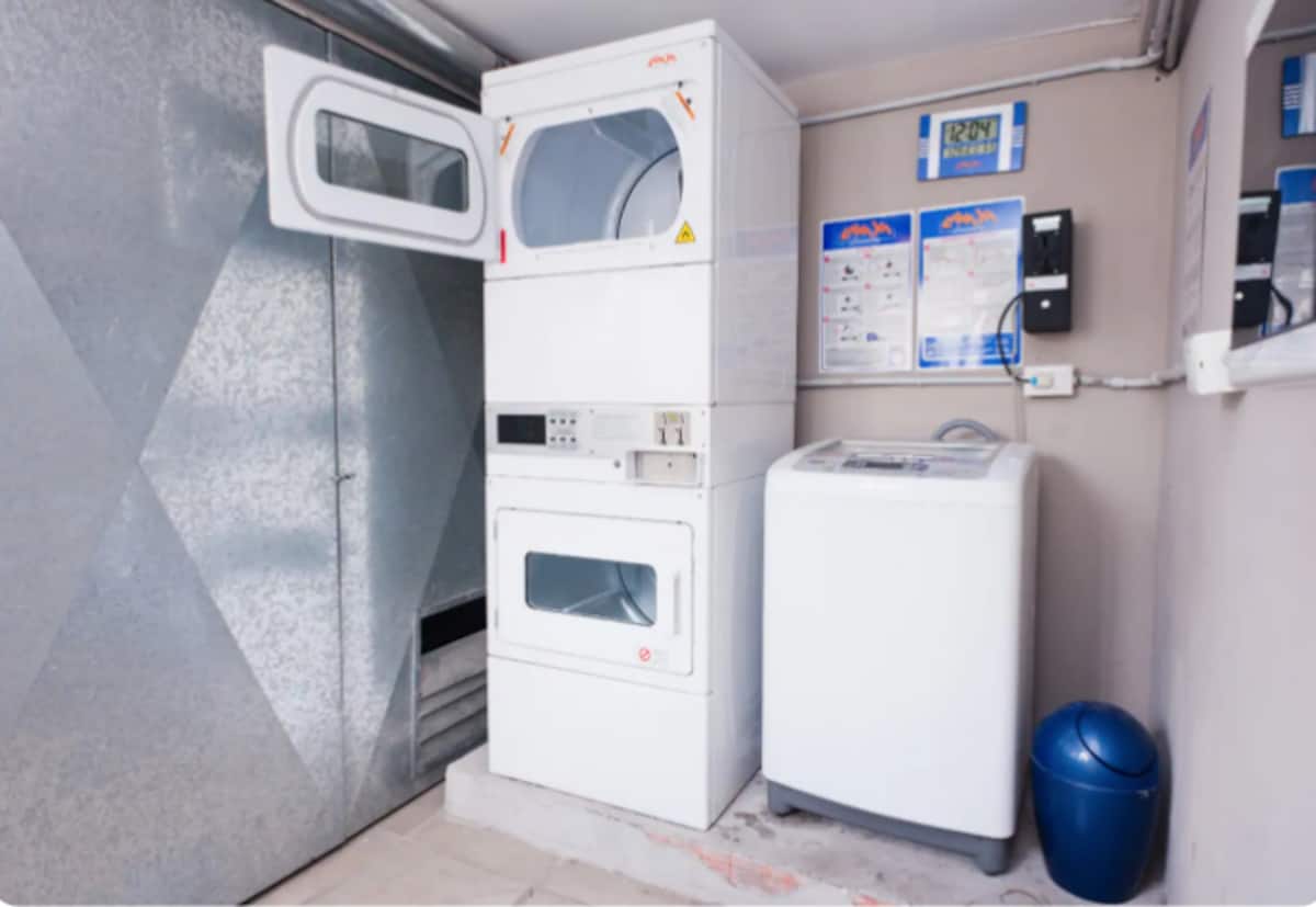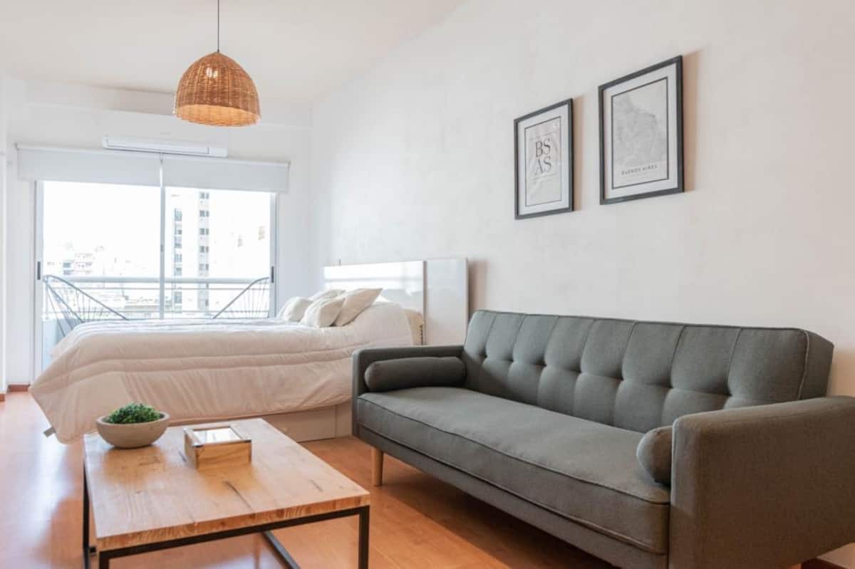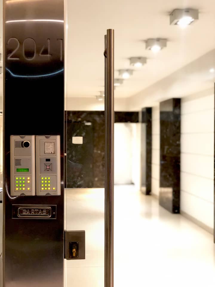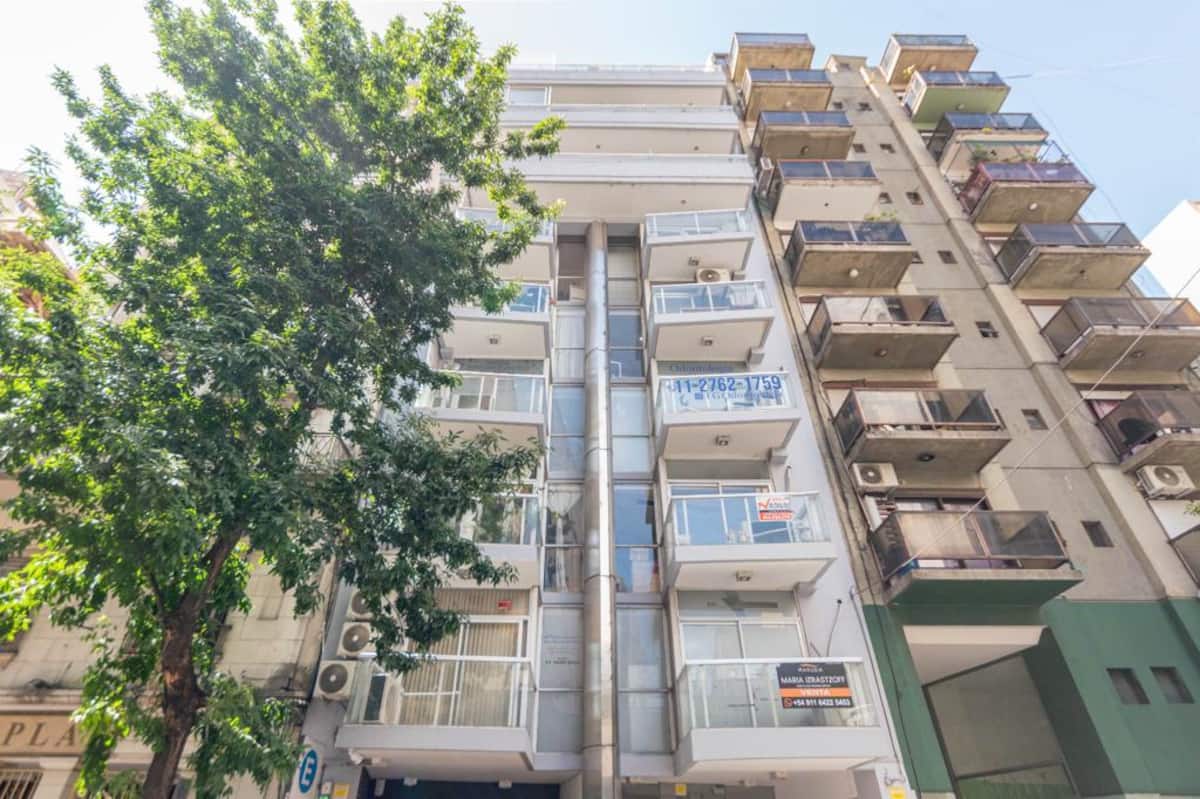 Квартира-студия с мебелью, с окном и балконом, выходящим на фасад здания и внутренний двор с зоной для гриля. В описании указано наличие новой бытовой техники. В общих зонах предусмотрены прачечные; вход в здание открыт для жильцов 24 часа. Упоминается электропроводка во всех квартирах и общих помещениях для повышения безопасности.