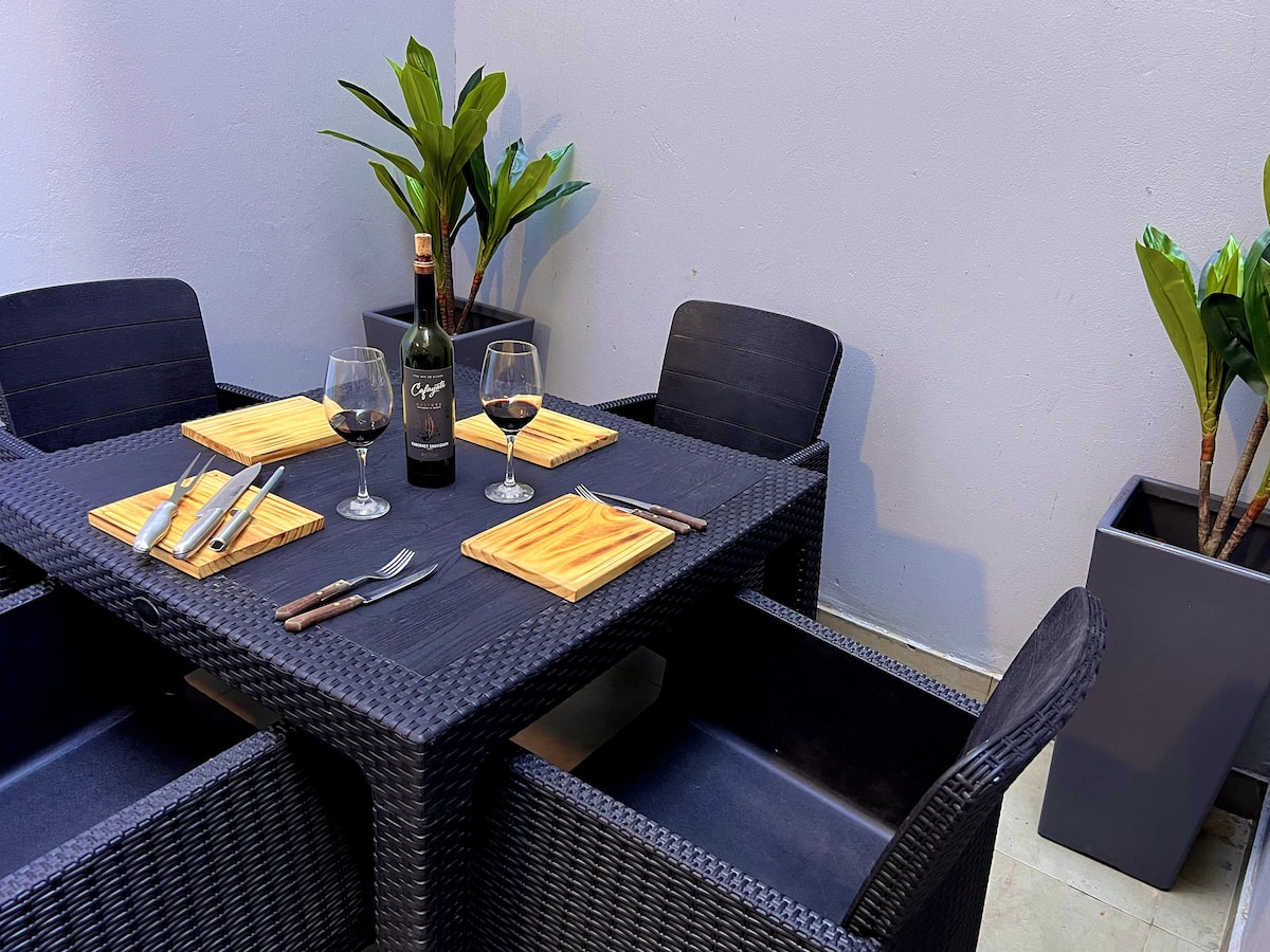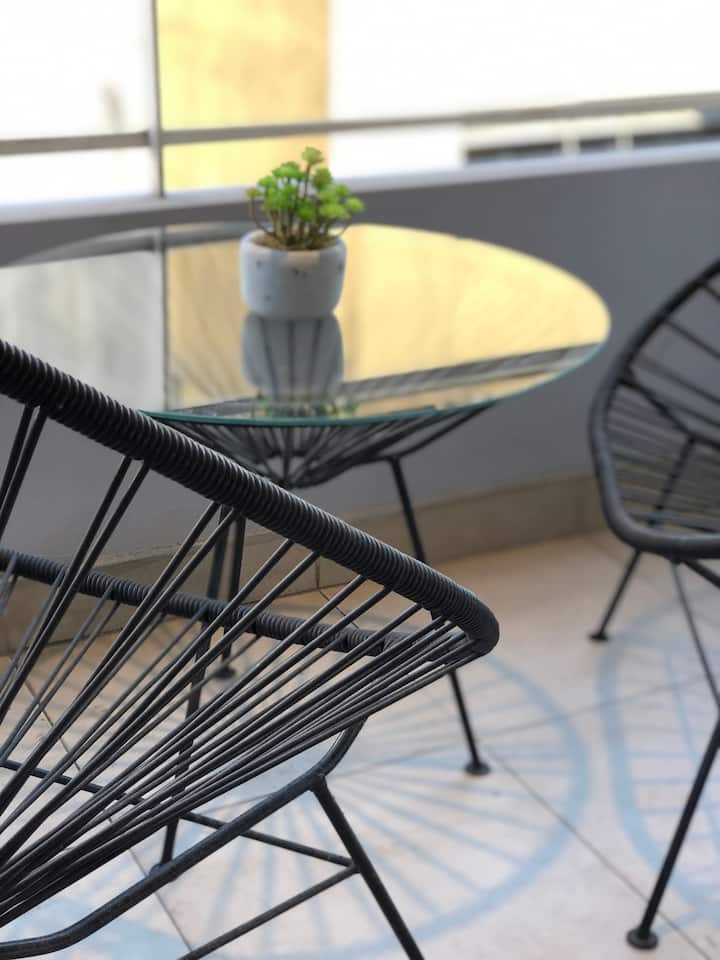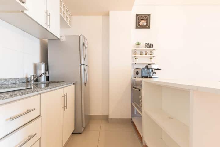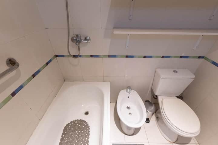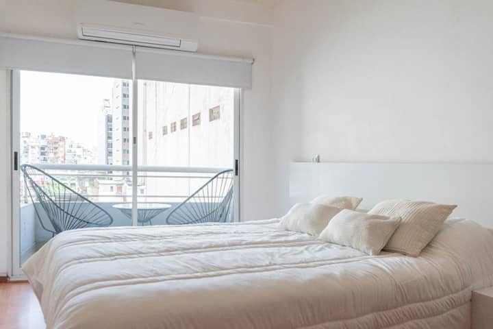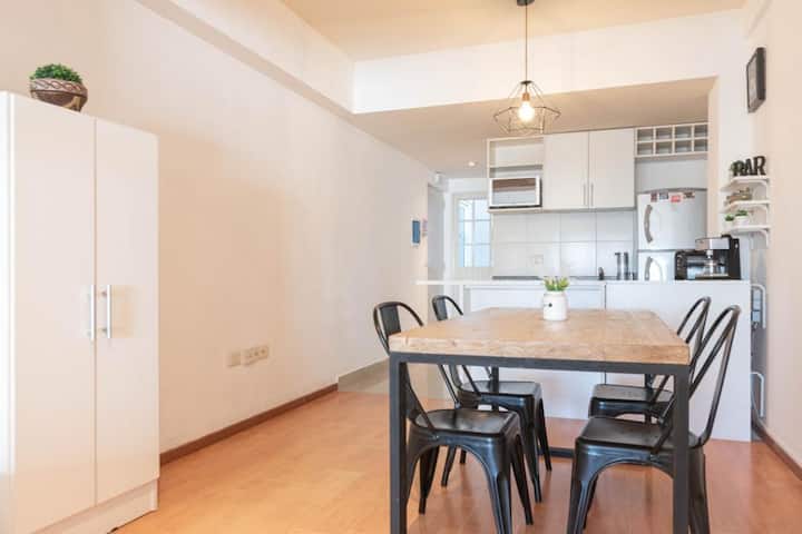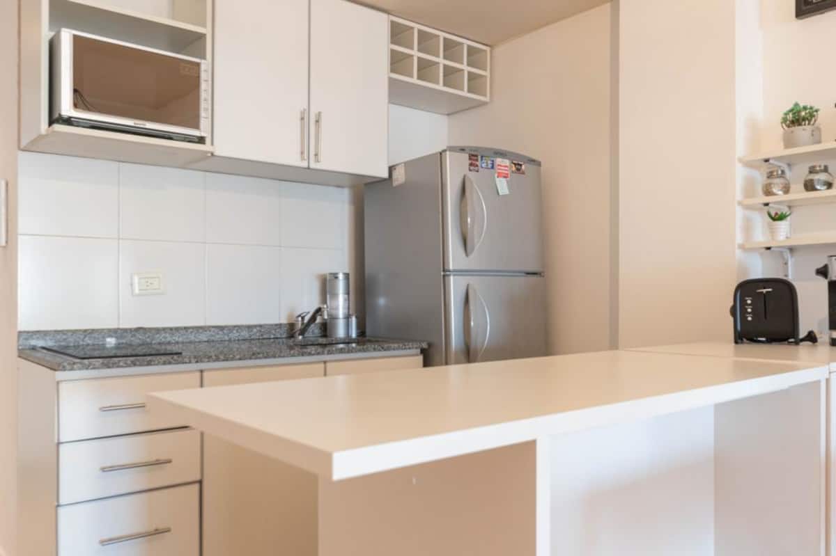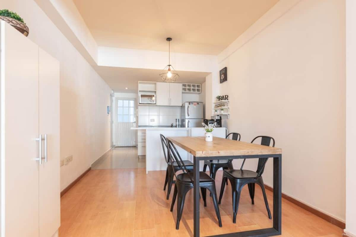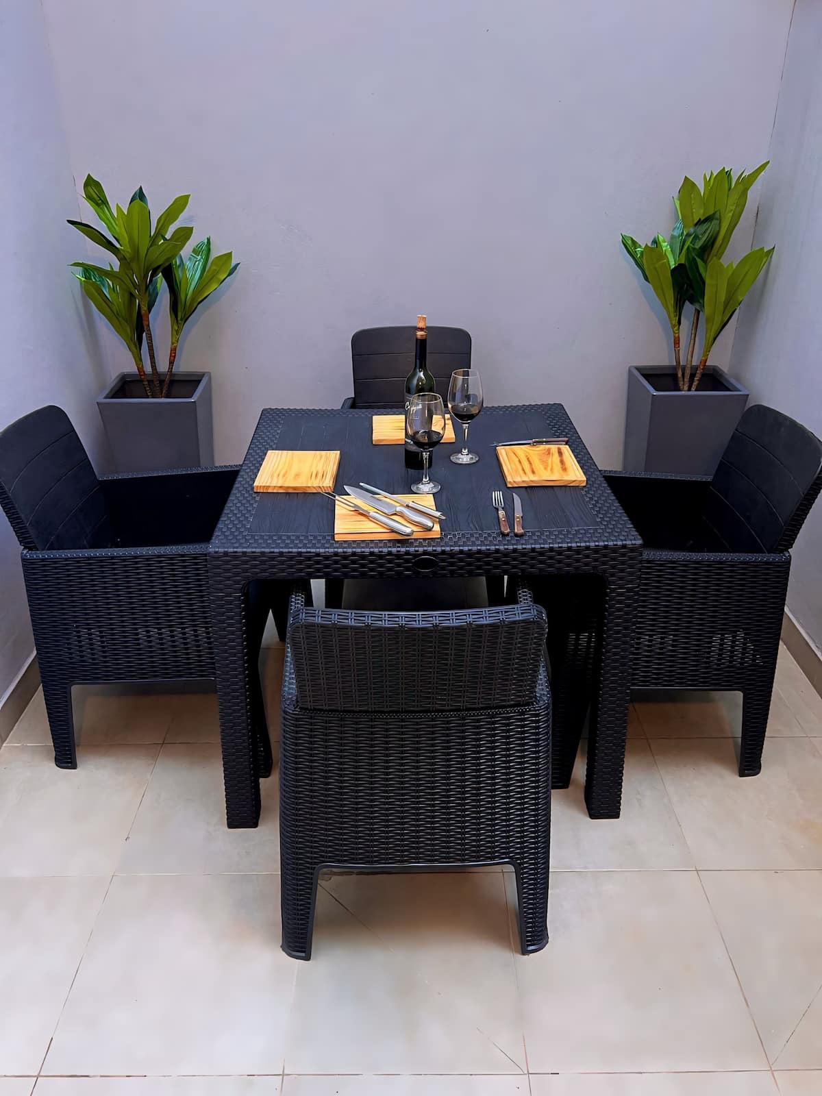 Квартира-студия с мебелью, с окном и балконом, выходящим на фасад здания и внутренний двор с зоной для гриля. В описании указано наличие новой бытовой техники. В общих зонах предусмотрены прачечные; вход в здание открыт для жильцов 24 часа. Упоминается электропроводка во всех квартирах и общих помещениях для повышения безопасности.