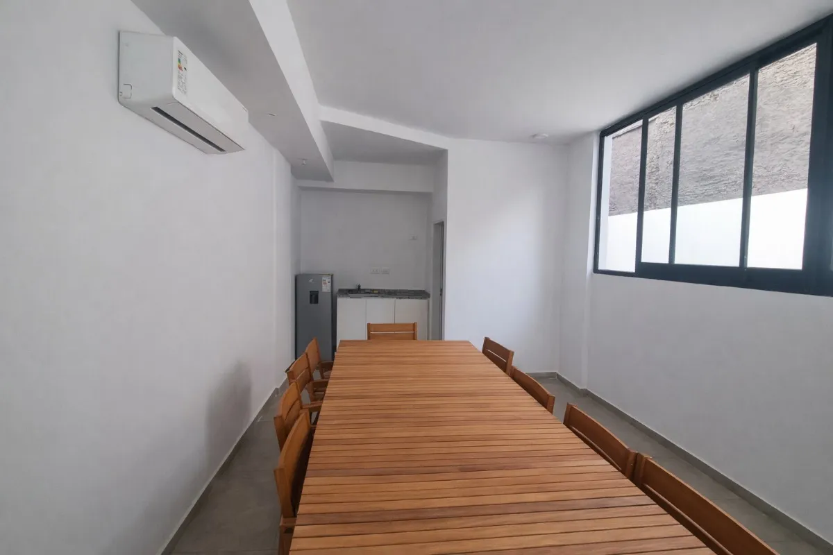 Квартира-студия в Balvanera, новая (никто не жил), на 2-м этаже, окна на улицу; может быть частично зонирована. 38 m² крытых и 42 m² общих. В помещении гостиная-столовая с интегрированной кухней, полноценная ванная комната и балкон площадью 2,90 x 1,40 m². Кондиционер (холод/тепло), центральное горячее водоснабжение, встроенный шкаф до потолка. В кухне варочная панель с 2 конфорками. В здании 9 этажей, 6 квартир на этаже, есть лифт, обслуживающий персонал, laundry, зона гриля, бассейн, quincho,