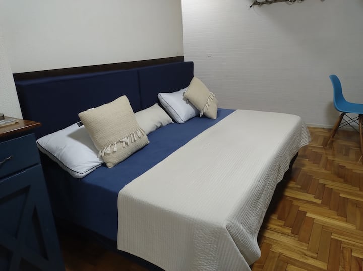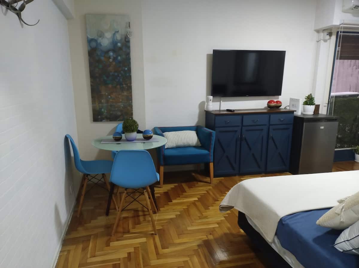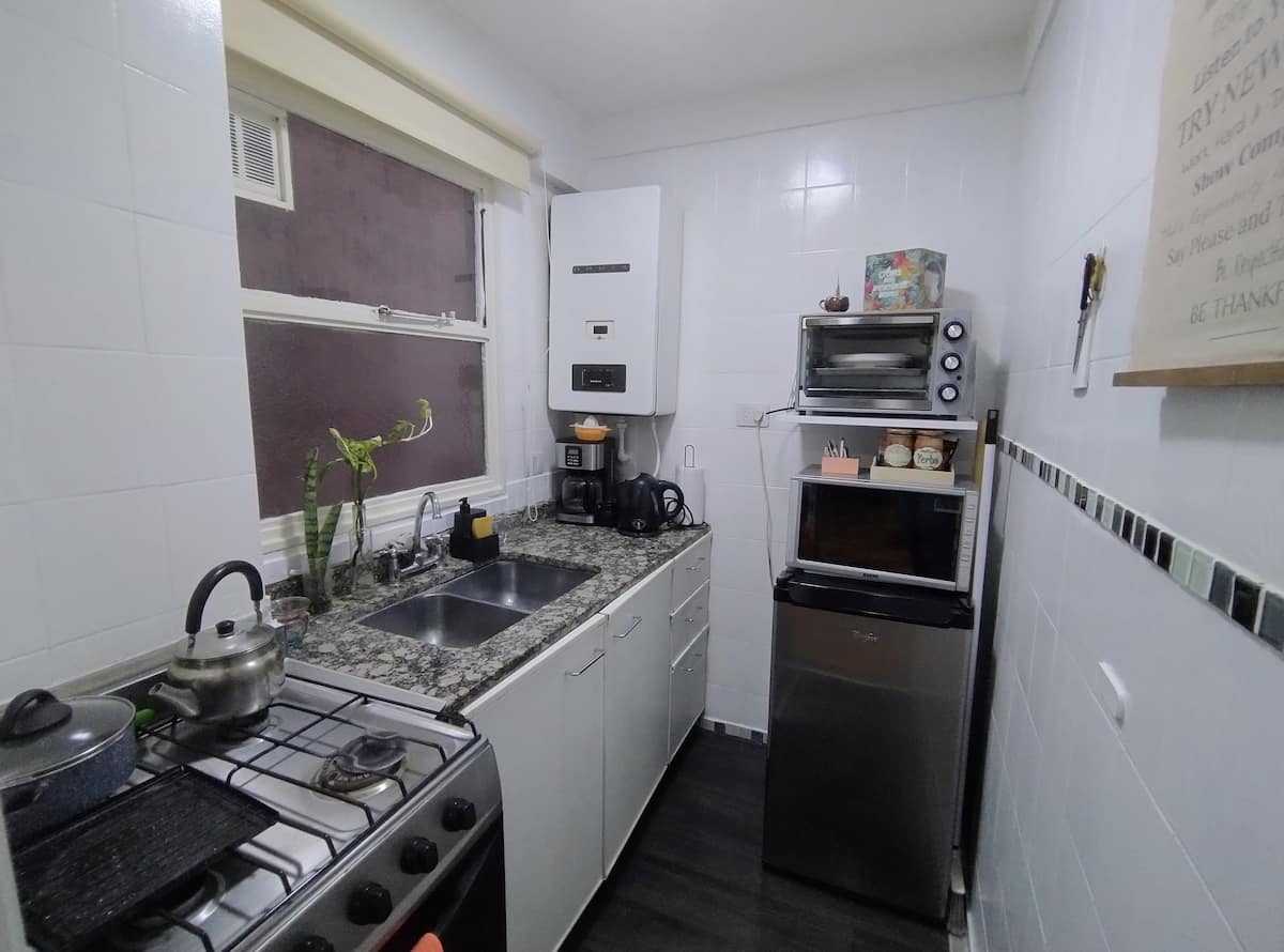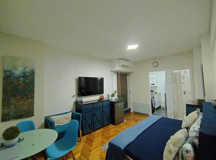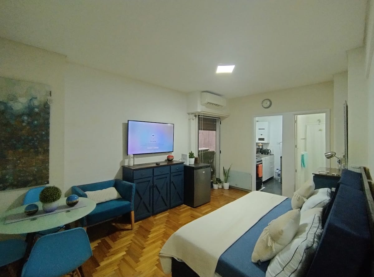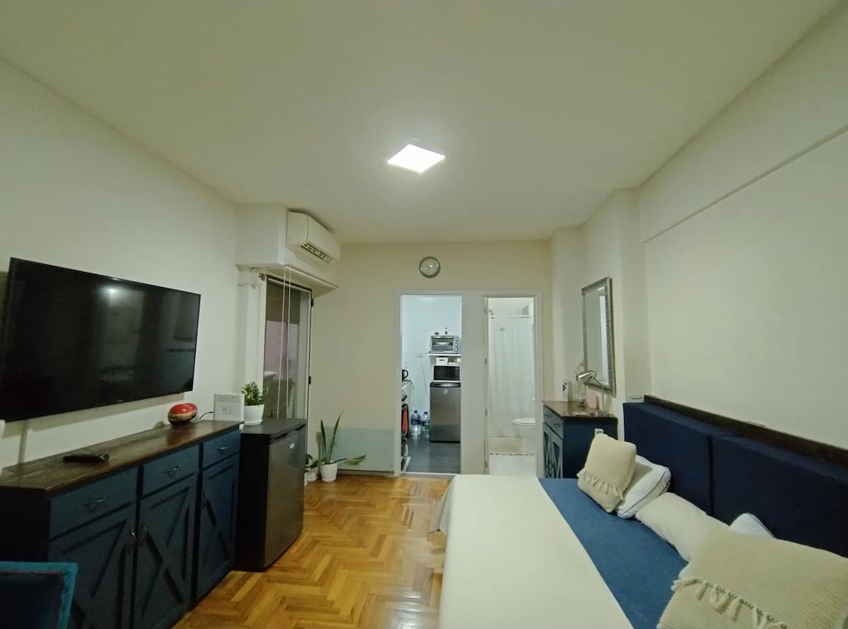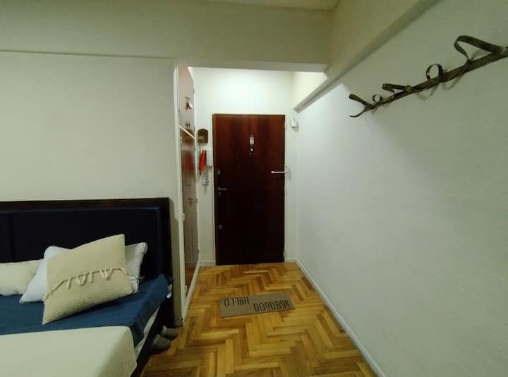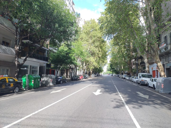 Квартира-студия площадью 30 m² в Balvanera, на оживлённой магистрали, с отдельной кухней. Помещение оборудовано бытовой техникой, есть микроволновая печь, электрическая духовка, холодильник и морозильная камера, телевизор, кондиционер и отопление, доступ в интернет. В ванной комнате предусмотрены горячая вода, в квартире также есть места для хранения. Заезд и выезд согласуются по времени, ключ передаётся лично, ночью передать ключ нельзя.