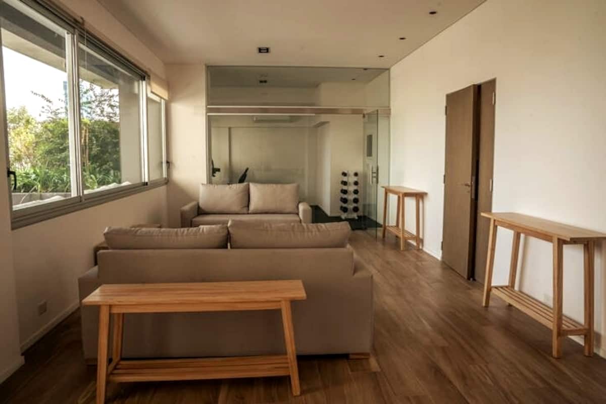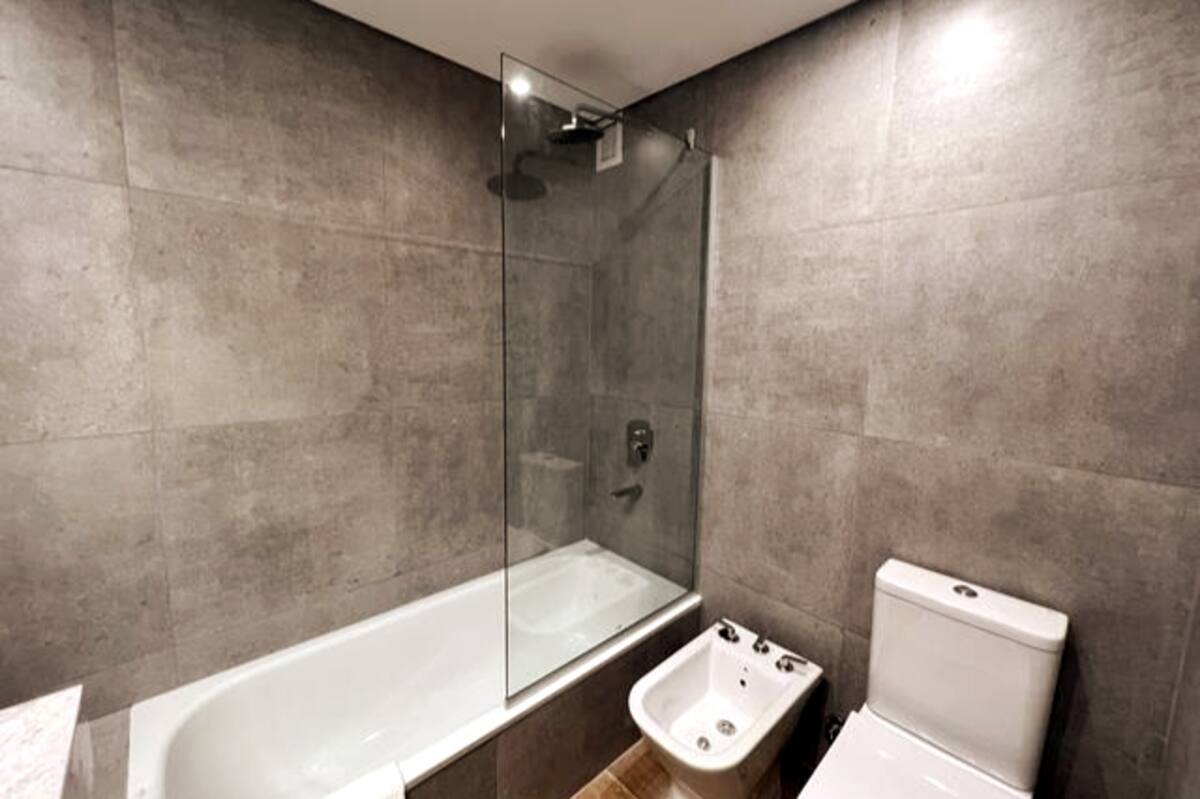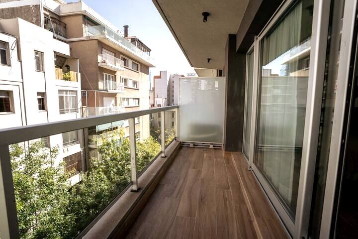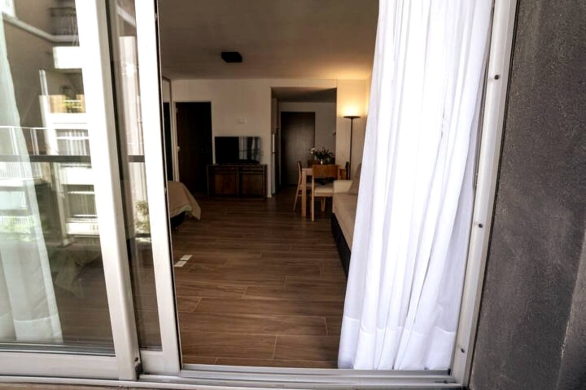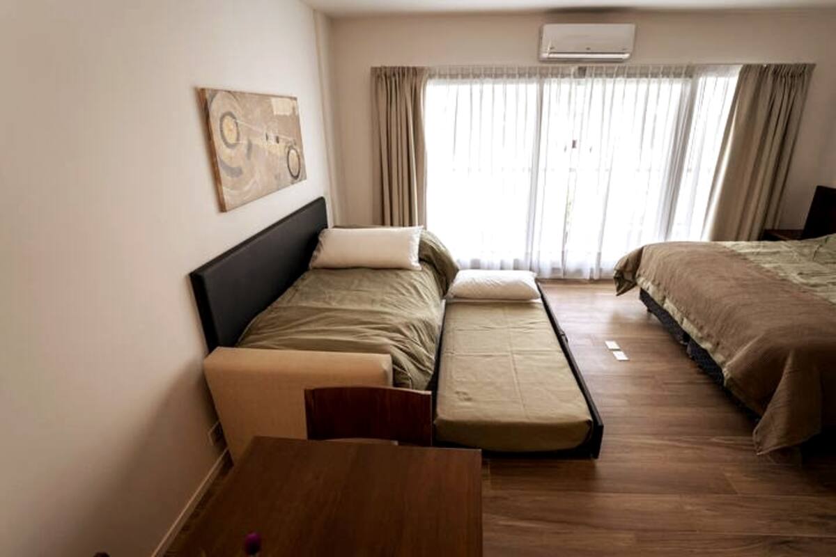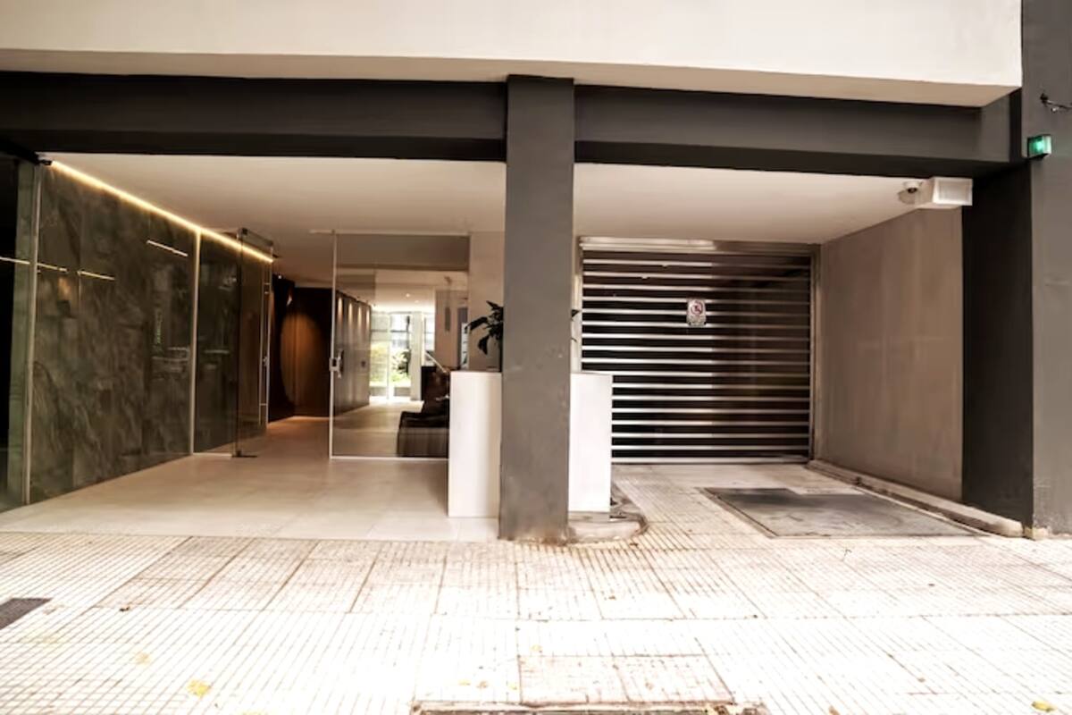 Квартира-студия в Belgrano, новая, с мебелью. Есть зона сна с двуспальной кроватью и диваном-кроватью, полностью оборудованная кухня, отдельная ванная комната и балкон с окнами во внутренний двор квартала. Кондиционер с режимами охлаждения и обогрева. В описании указаны (по запросу) частная парковка и тренажёрный зал на террасе с видом, а также долгосрочная скидка. Дополнительно для иностранных гостей старше 12 лет, не являющихся резидентами Аргентины, предусмотрен городской налог USD 1.50 с чел