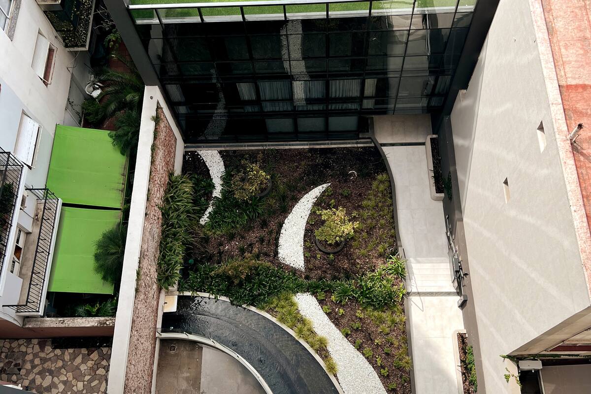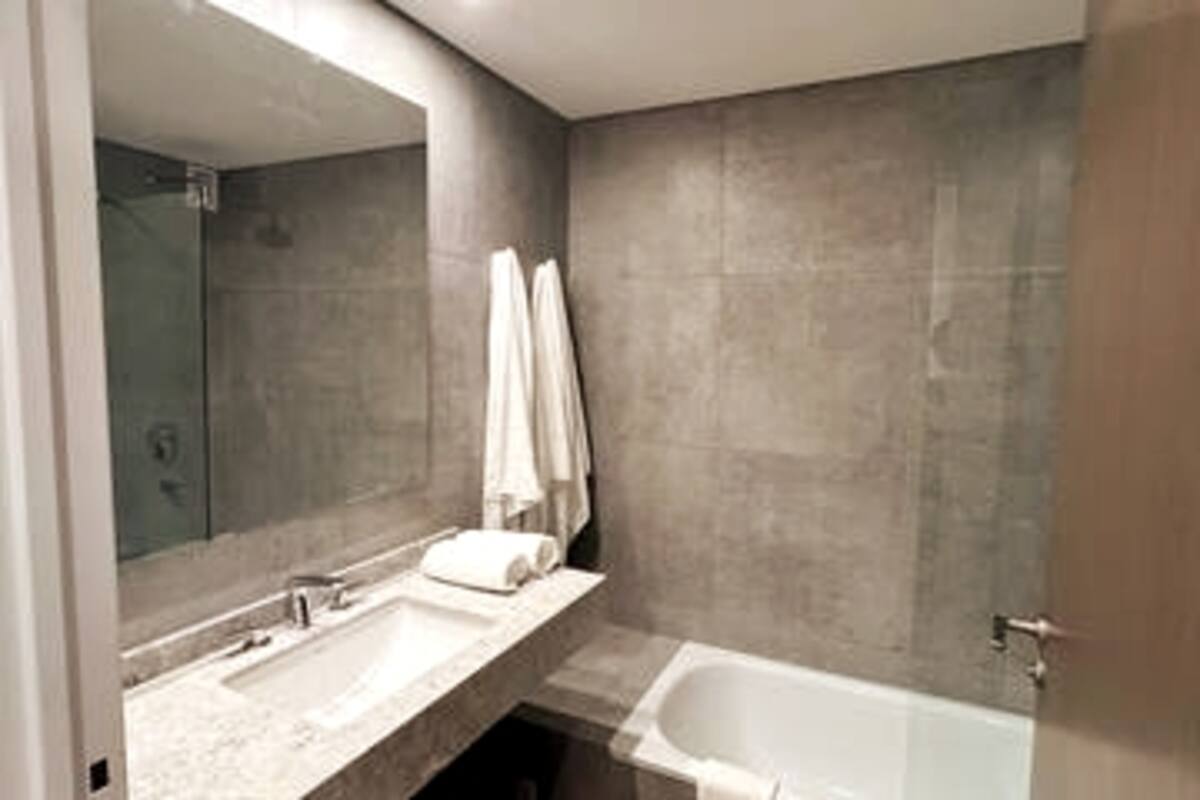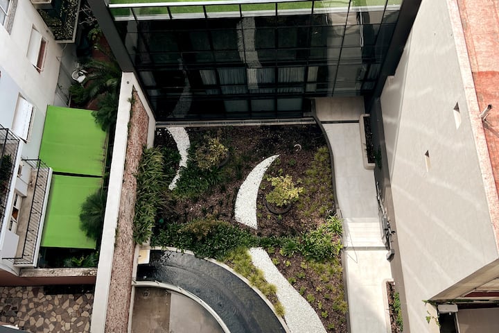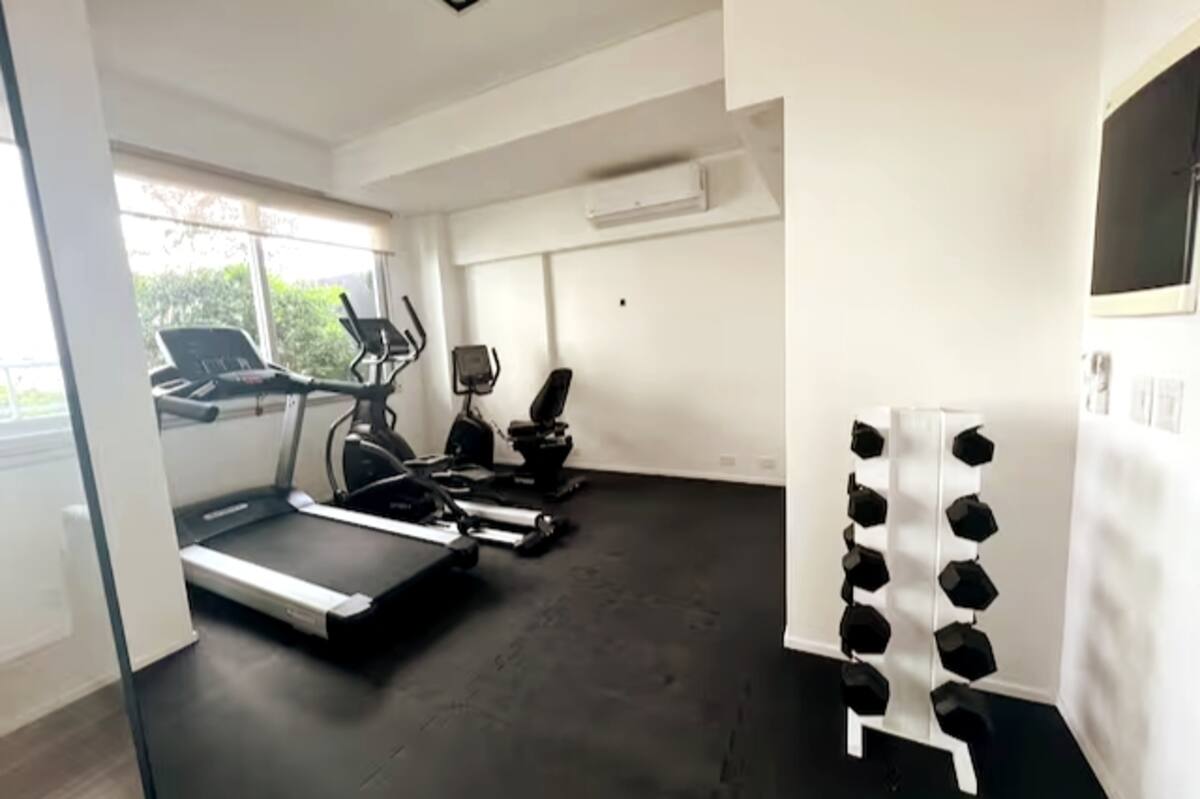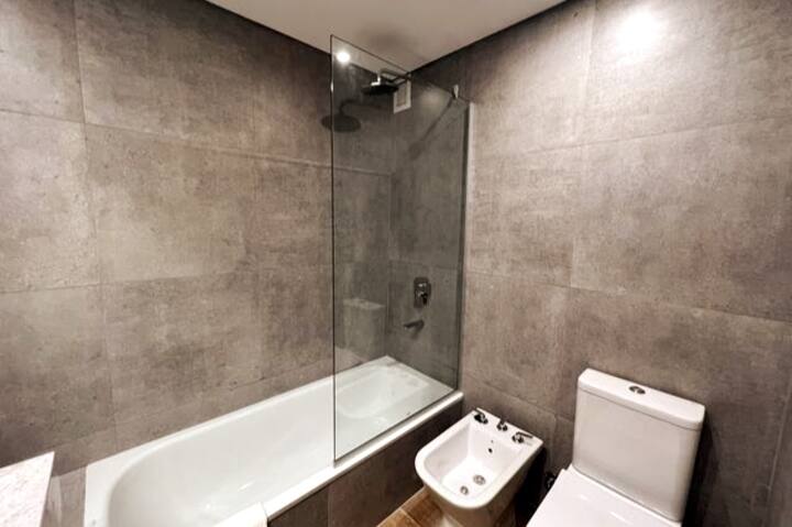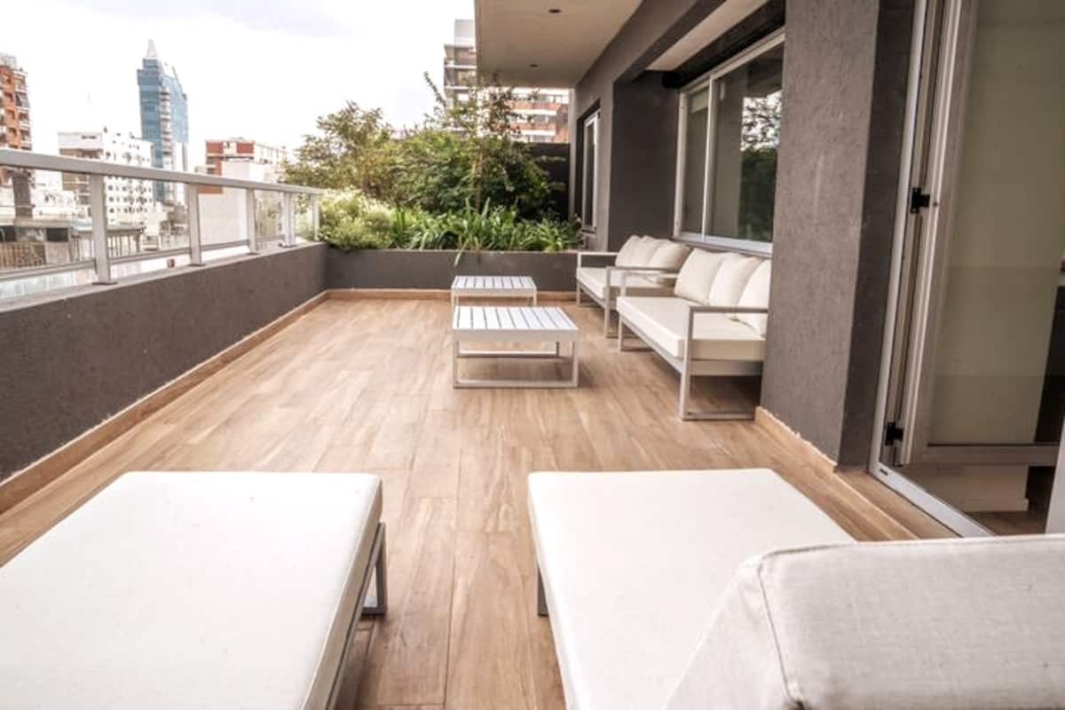 Квартира-студия в Belgrano, новая, с мебелью. Есть зона сна с двуспальной кроватью и диваном-кроватью, полностью оборудованная кухня, отдельная ванная комната и балкон с окнами во внутренний двор квартала. Кондиционер с режимами охлаждения и обогрева. В описании указаны (по запросу) частная парковка и тренажёрный зал на террасе с видом, а также долгосрочная скидка. Дополнительно для иностранных гостей старше 12 лет, не являющихся резидентами Аргентины, предусмотрен городской налог USD 1.50 с чел