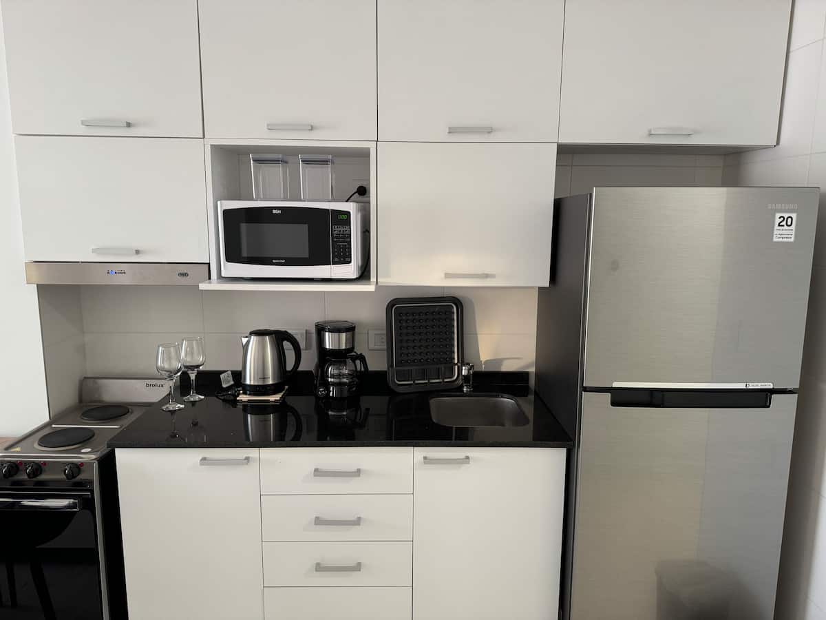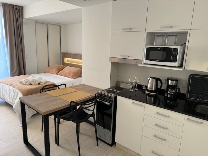 Новая квартира-студия в Boedo. Площадь и этаж не указаны. В студии двуспальная кровать, полностью оборудованная мини-кухня и ванная комната. Предусмотрены места для работы и прачечная.