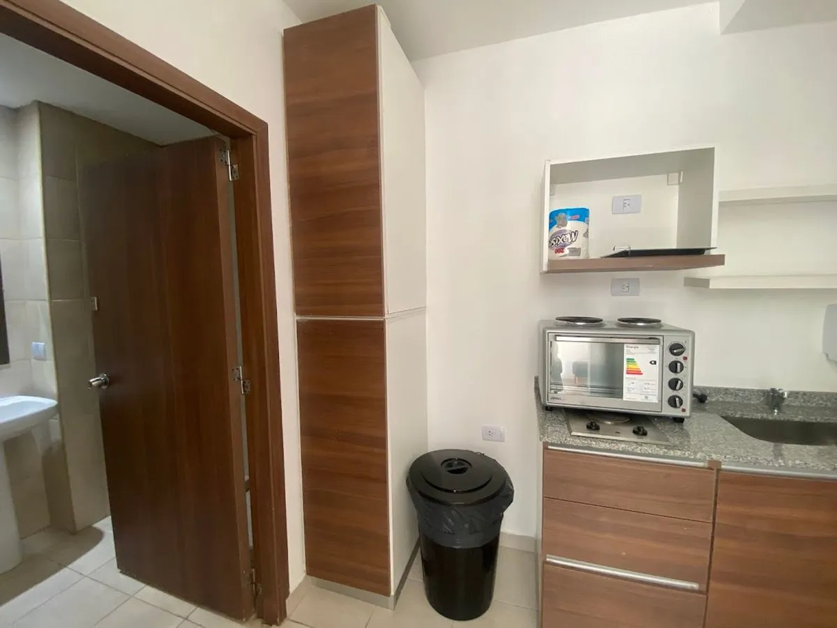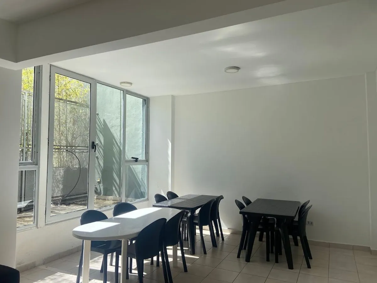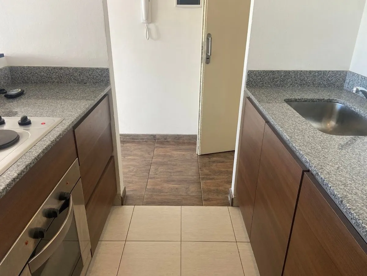 Квартира-студия в 5-м этаже с балконом, окна на улицу. Площадь и отделка в объявлении не указаны; полы из керамического/фарфорового покрытия (porcelanato), оконные рамы из алюминия. Кухня с полузакрытой компоновкой с гранитной столешницей, мойкой из нержавеющей стали, смесителем с одним рычагом, электрической плитой и духовкой; предусмотрено место для холодильника и электрического бойлера. В комнате установлен сплит-кондиционер «холод/тепло», есть шкаф во всю высоту и полностью оборудованная ван