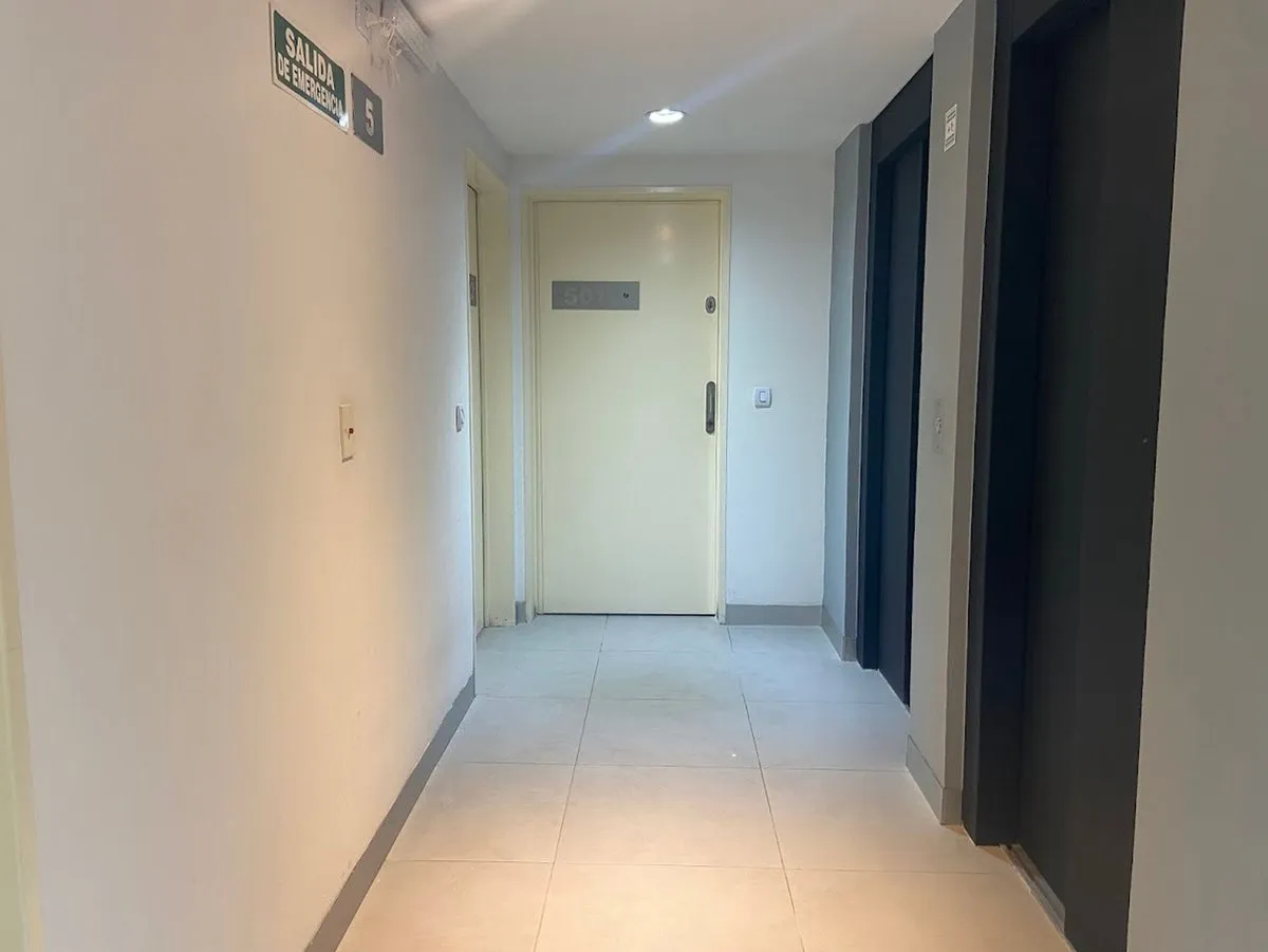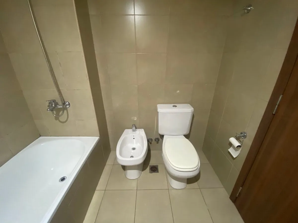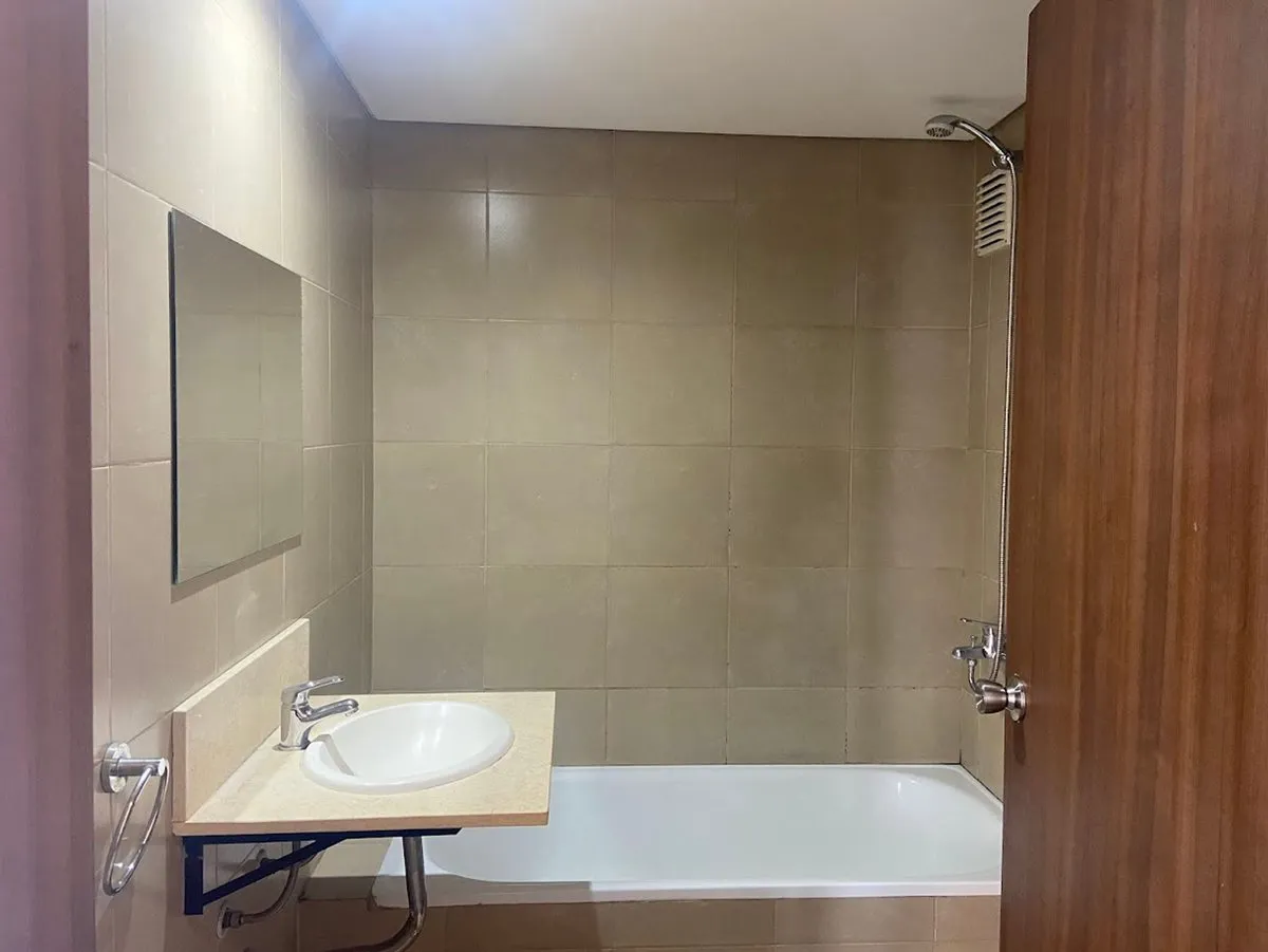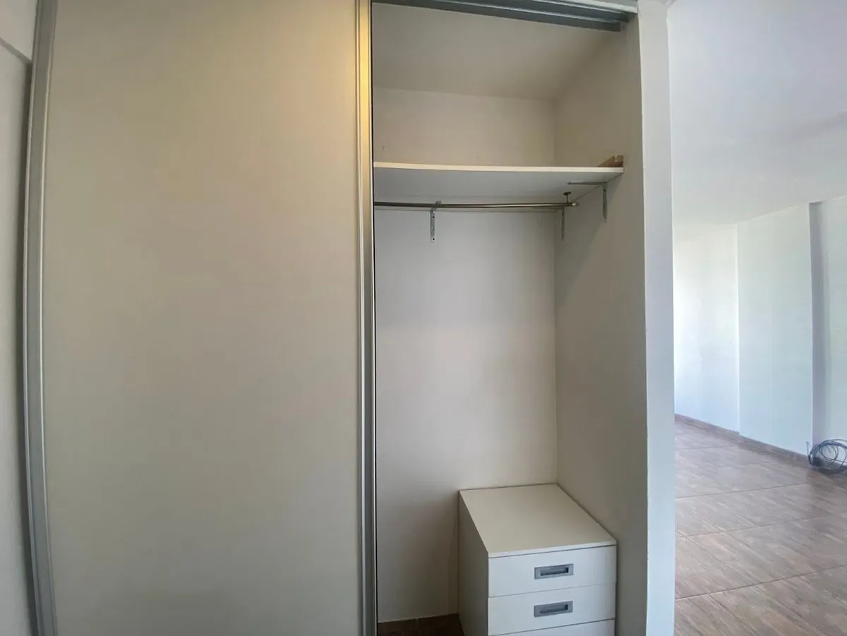 Квартира-студия в 5-м этаже с балконом, окна на улицу. Площадь и отделка в объявлении не указаны; полы из керамического/фарфорового покрытия (porcelanato), оконные рамы из алюминия. Кухня с полузакрытой компоновкой с гранитной столешницей, мойкой из нержавеющей стали, смесителем с одним рычагом, электрической плитой и духовкой; предусмотрено место для холодильника и электрического бойлера. В комнате установлен сплит-кондиционер «холод/тепло», есть шкаф во всю высоту и полностью оборудованная ван