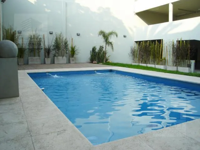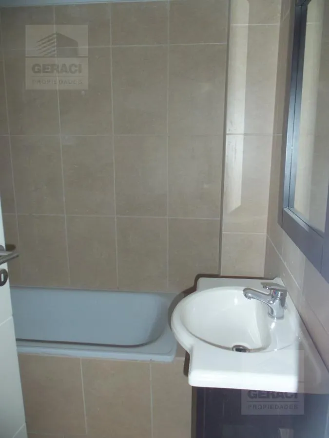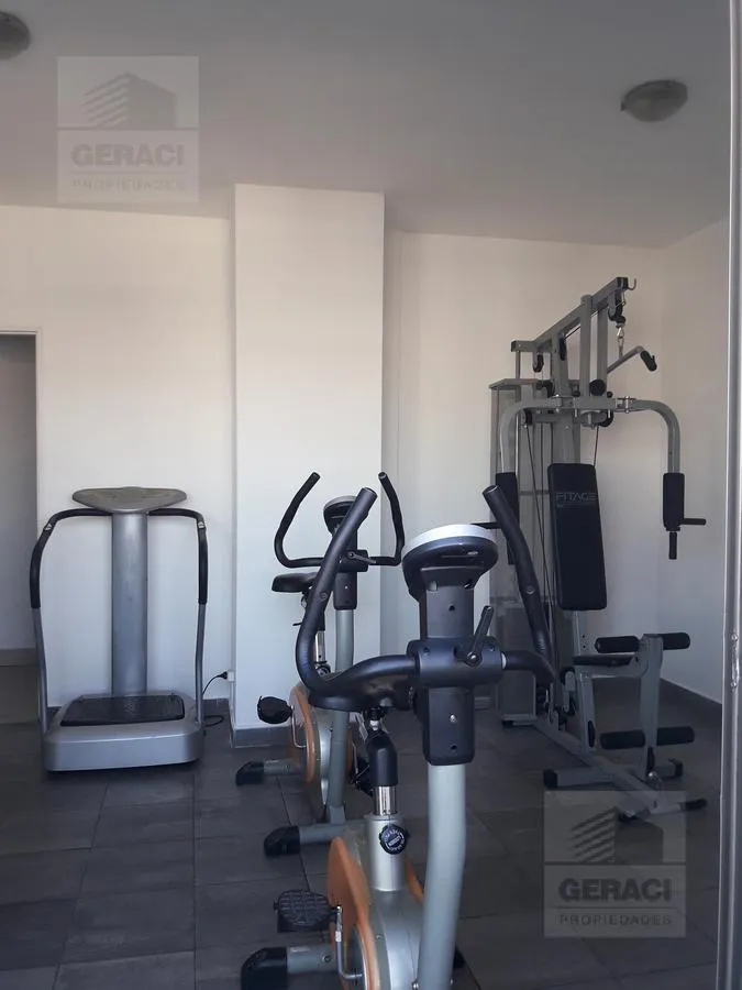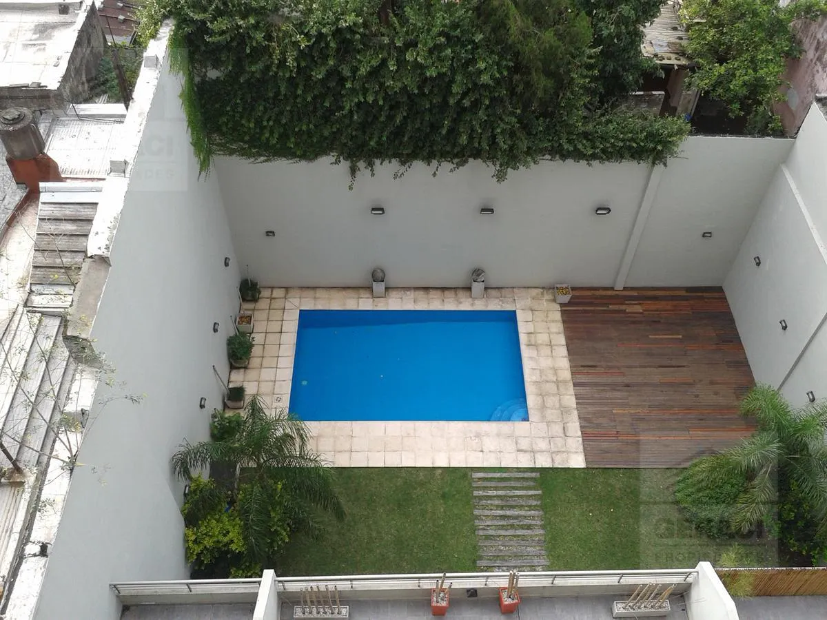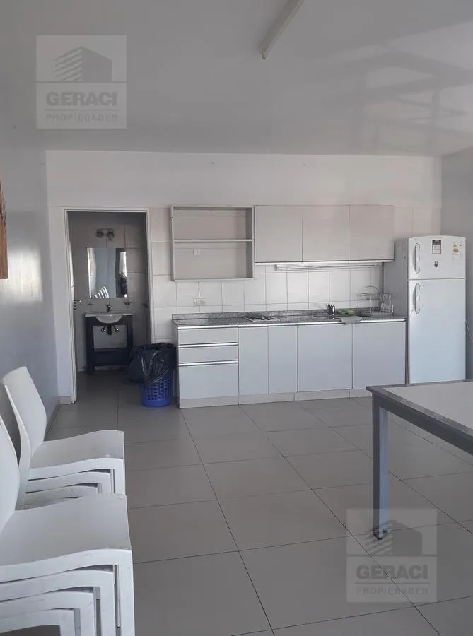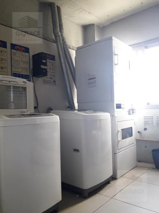 Квартира-студия с паркетом/ламинатными покрытиями (piso flotante). Полная кухня с электрической варочной панелью (anafe eléctrico) и отдельной ванной комнатой с ванной. Встроенный шкаф с внутренним наполнением. В здании: общая гостиная для жильцов (SUM), тренажёрный зал, прачечная, зона гриля, бассейн с солярием и деревянный настил (deck). Коммунальные и управляющие платежи не указаны.