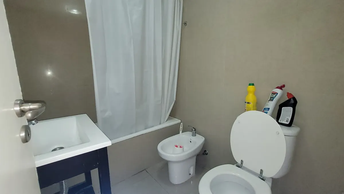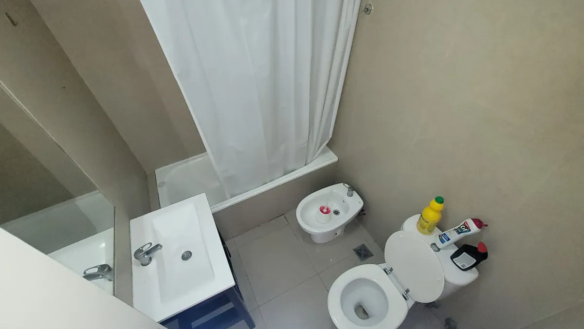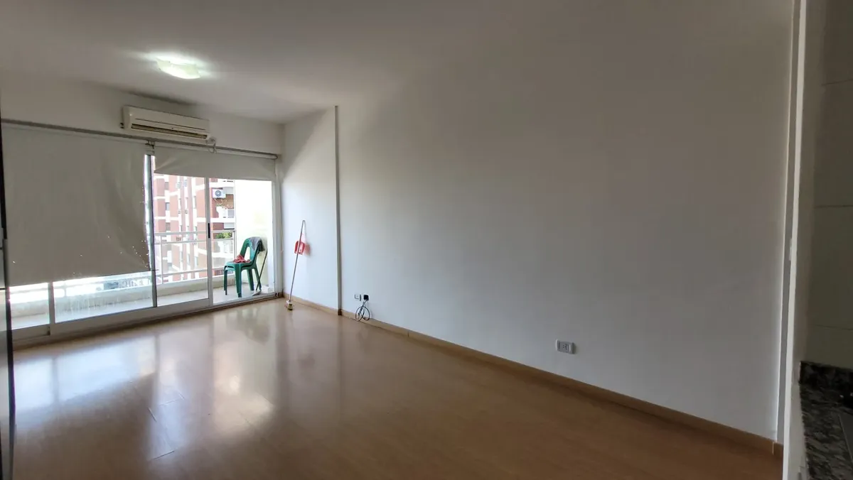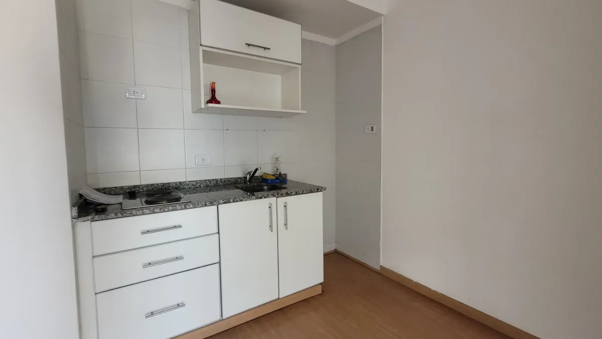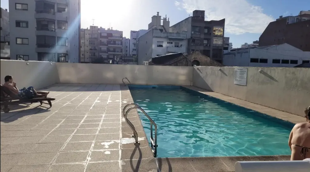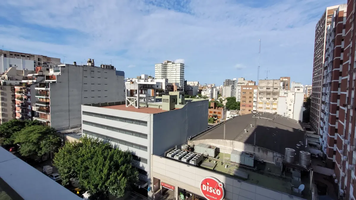 Квартира-студия в Caballito, окно на улицу, 8-й этаж. Площадь в объявлении не указана. Кухня объединена с гостиной, есть совмещённый санузел; напольное покрытие — керамическая плитка. Установлен кондиционер типа split (холод/тепло), горячая вода — центральная. Имеется балкон. В здании есть большой бассейн и солярий, общая гостиная для жильцов, прачечная; в объявлении также упомянут солярий. До Disco (напротив), до Av. Juan B. Alberdi — в нескольких минутах пешком; до estación ACOYTE Subte Línea