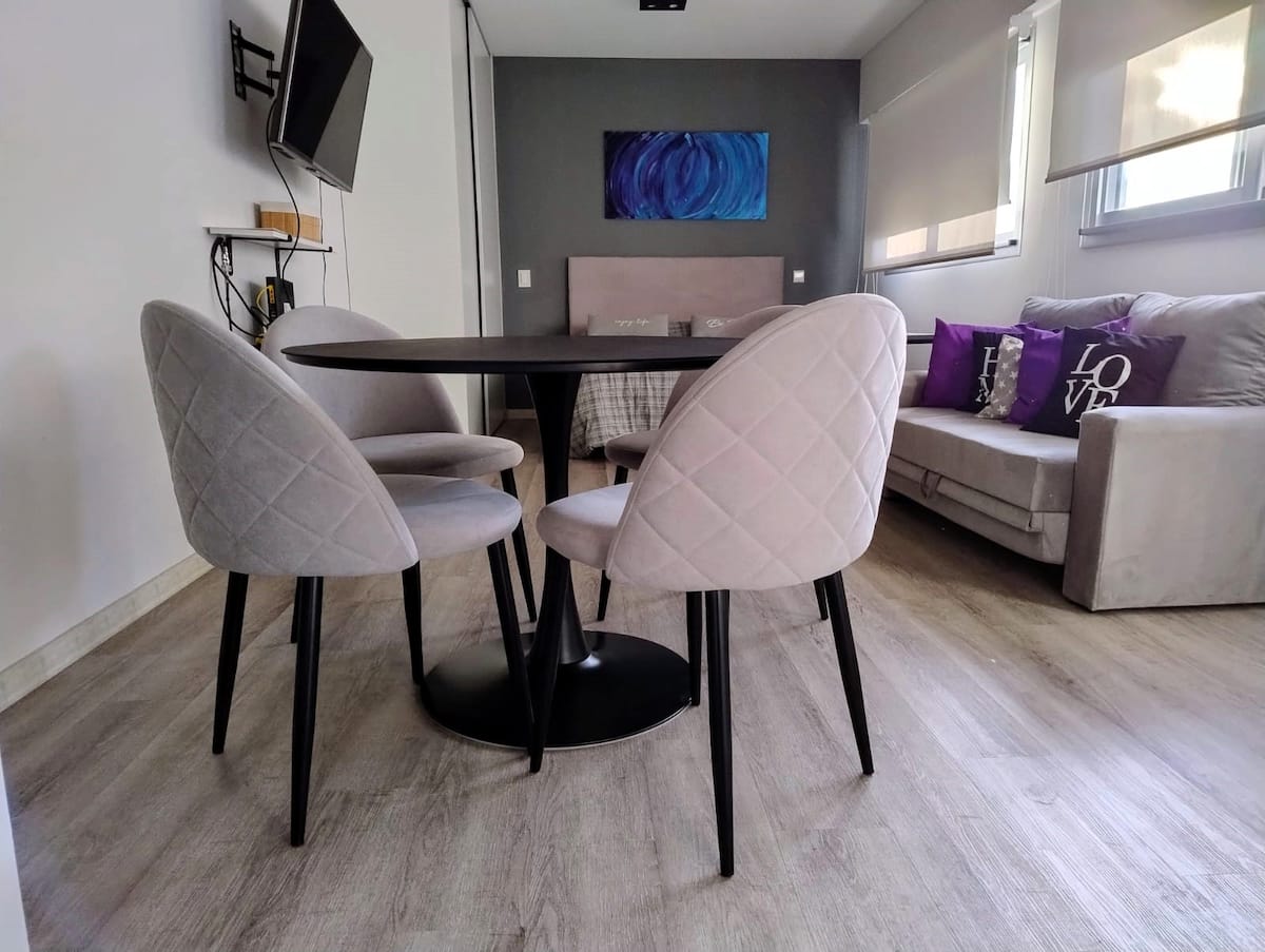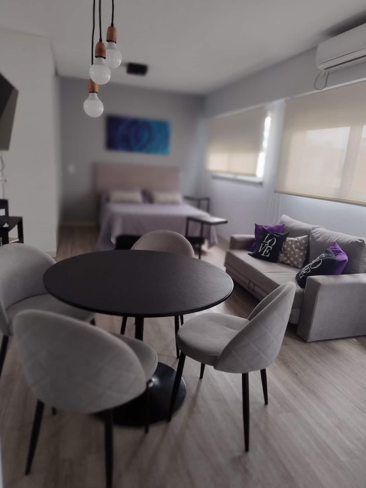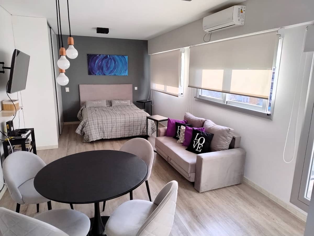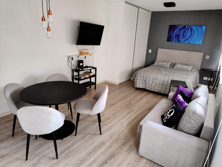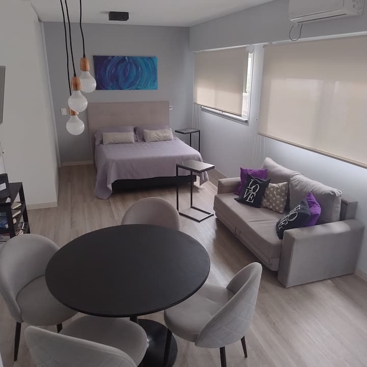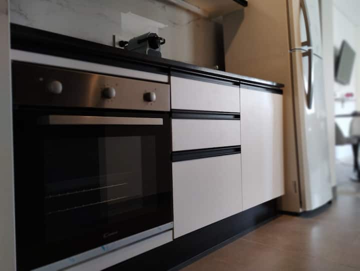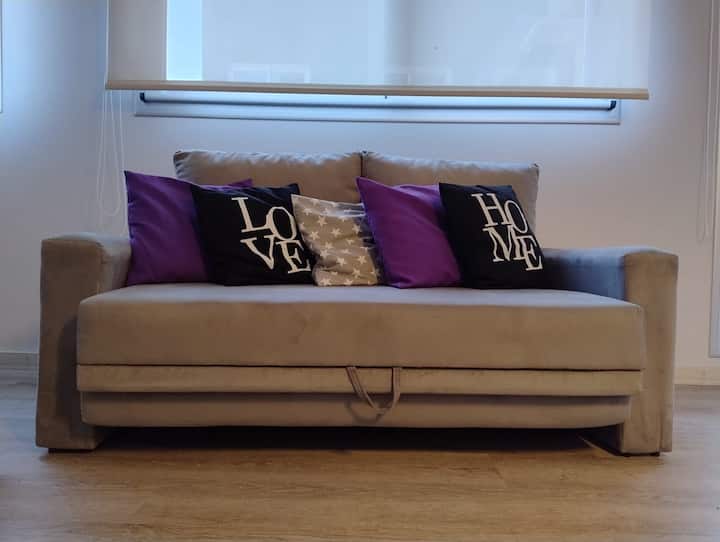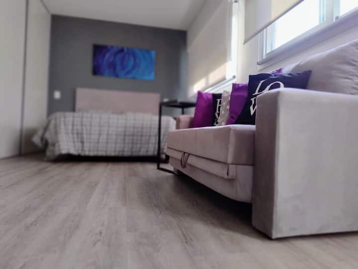 Новая квартира-студия в комплексе Alma DVZ, окна на две стороны: окна на улицу и на двор, с большим балконом. В интерьере предусмотрены кровать queen-size и двухместный диван-кровать; на окнах установлены затемняющие шторы и солнцезащита. Кухня оснащена духовкой, электрическими конфорками, холодильником с морозильной камерой, микроволновой печью, тостером, электрическим чайником и Nespresso. Отопление индивидуальное (радиантный пол), установлены инверторный кондиционер, высокоскоростной Wi‑Fi, 4