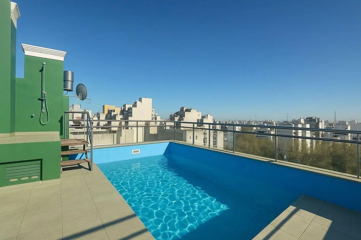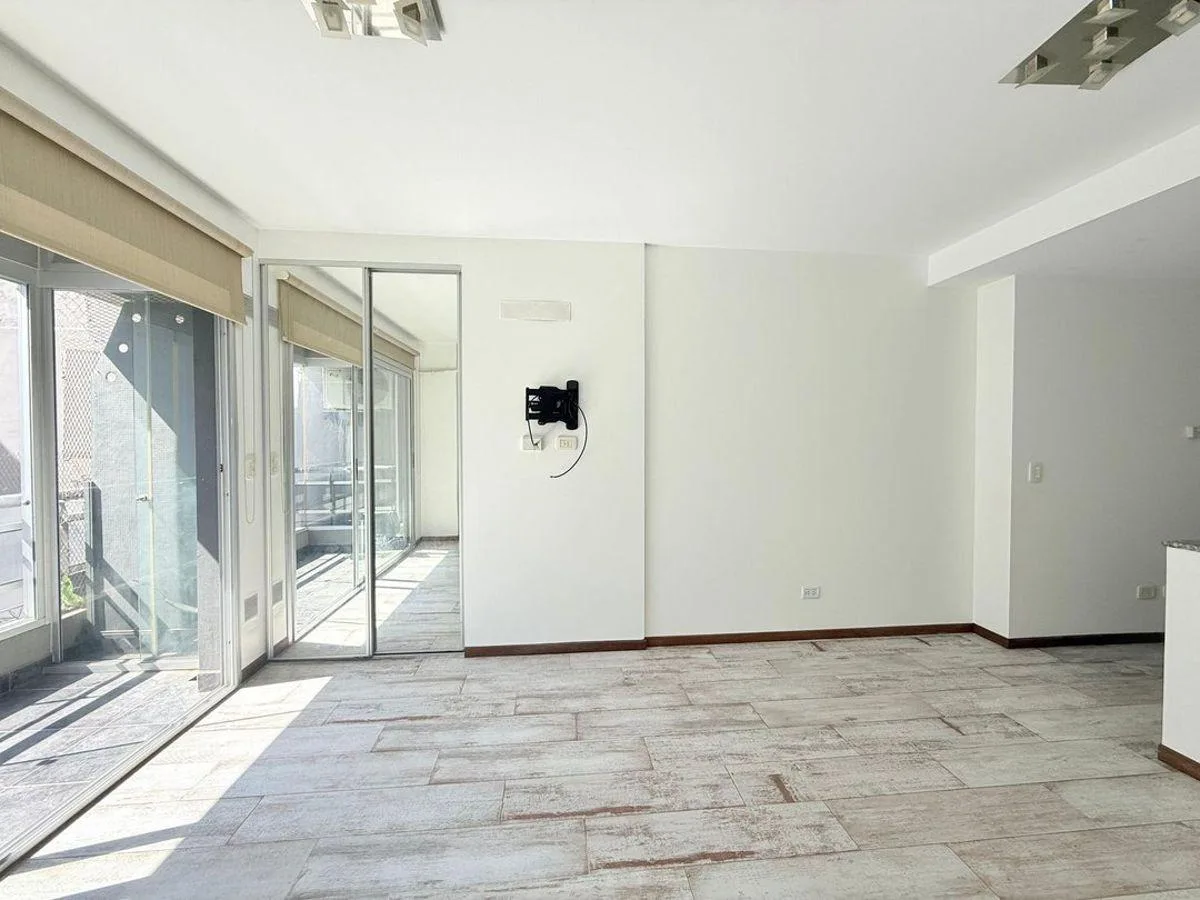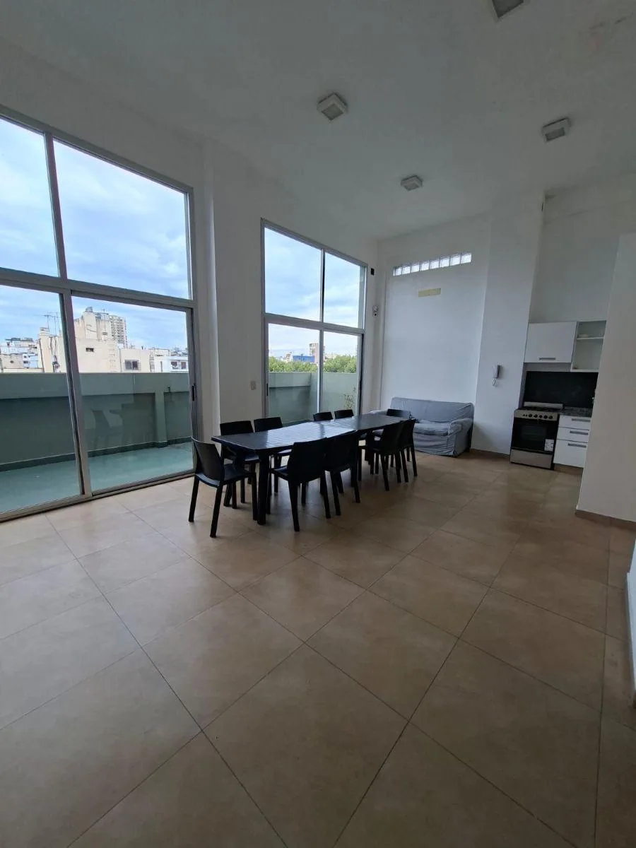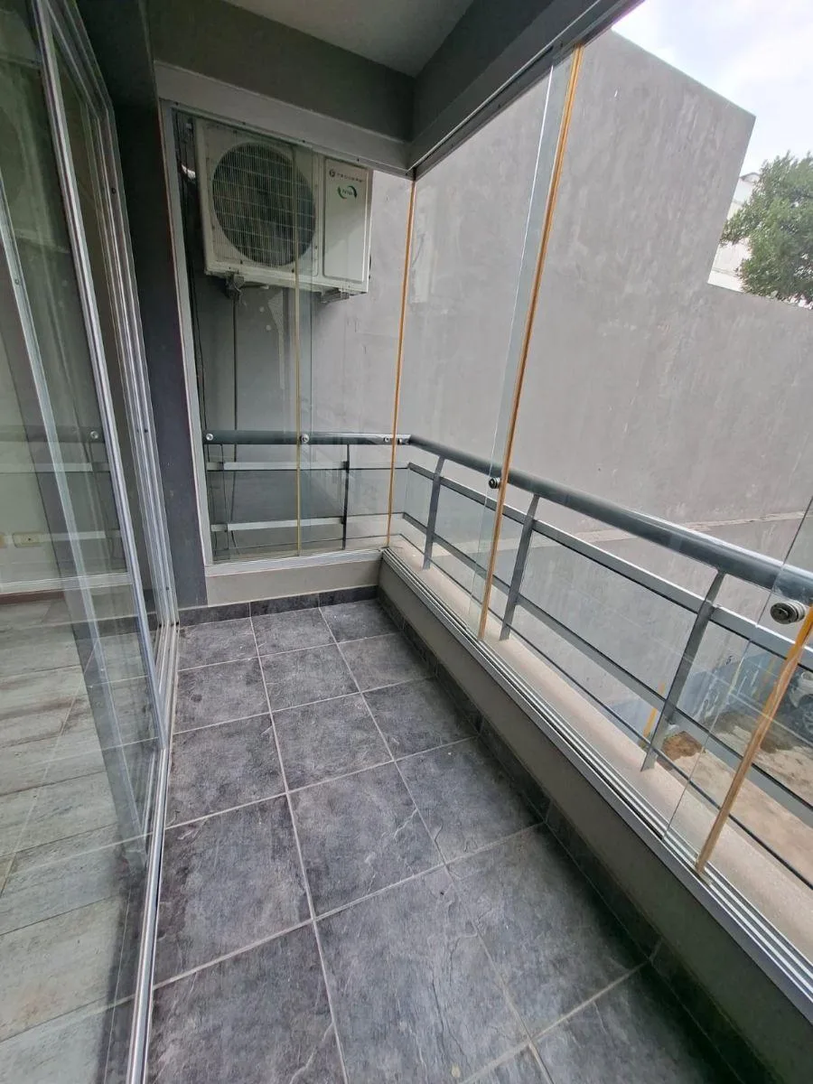 Квартира-студия площадью 32 m² в Caballito, кухня с интегрированной планировкой, с балконом на окна во двор. Балкон закрыт стеклянными раздвижными панелями и занимает 4 m², предусмотрена возможность использования как рабочее место или зимний сад. В квартире установлены вытяжка, кондиционер холод/только и центральное отопление с индивидуальной регулировкой, также указана возможность размещения стиральной машины или посудомоечной машины и холодильника. В здании есть большой SUM на верхнем этаже с
