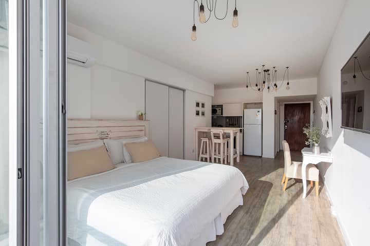 Квартира-студия в Chacarita на 9-м этаже в башне Mirador de Palermo, с панорамным видом на город. Есть частный балкон, кондиционер (холод/тепло), смарт-телевизор и высокоскоростной Wi‑Fi. Кухня оборудована, предусмотрены спальные места и смарт-замок с входом по коду; возможен вариант с 2 односпальными кроватями или 1 двуспальной кроватью. В здании предусмотрены круглосуточный ресепшн, бассейн на террасе и солярий; спортзал бесплатный. Парковка в частном гараже на 1-м цокольном этаже включена. На