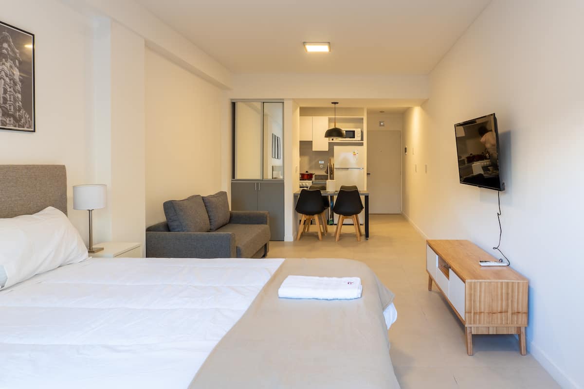 Квартира-студия с балконом в Coghlan, с двуспальной кроватью и двуспальным диваном-кроватью. На кухне установлены духовка, микроволновая печь и кофеварка. В квартире есть стиральная машина, смарт TV и бесплатный Wi‑Fi, установлен электронный замок. В здании предусмотрена общая гостиная для жильцов (SUM) с бассейном, столами для пинг-понга, настольным футболом, тренажёрами и зоной гриля. Доступ к SUM осуществляется по коду в часы с 11:00 до 18:00.