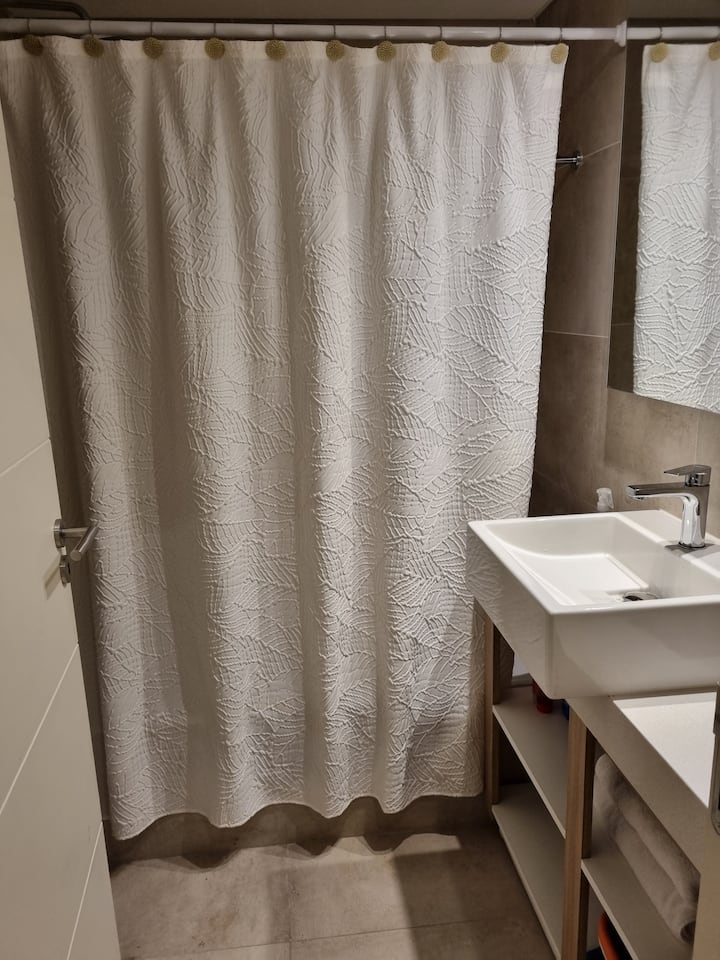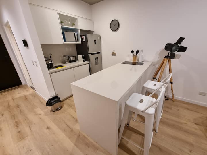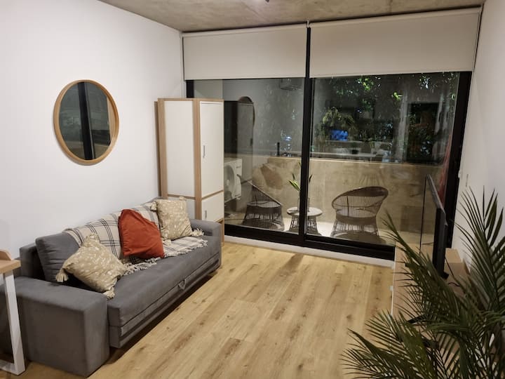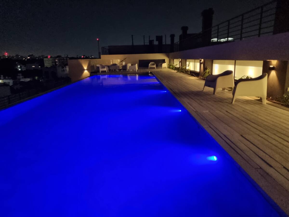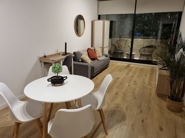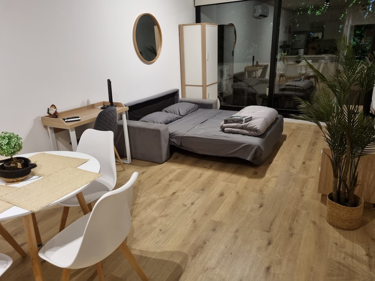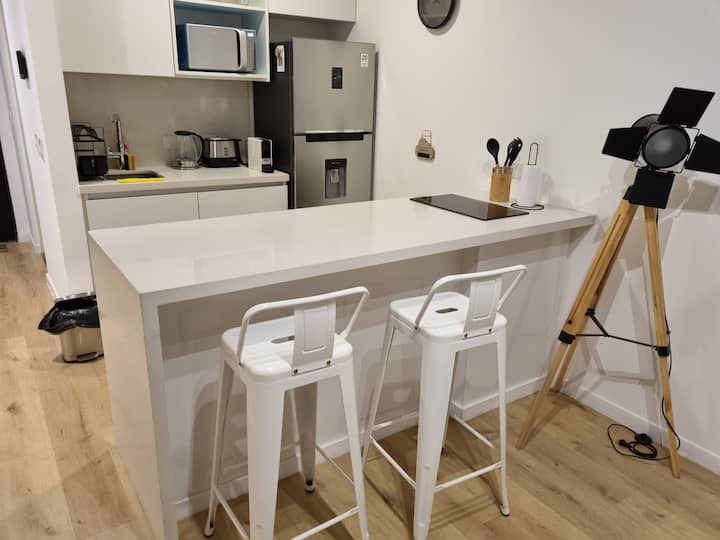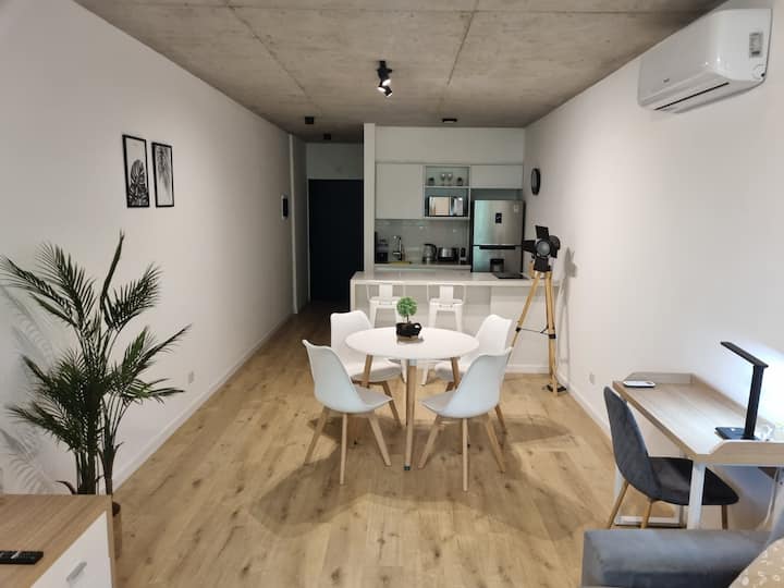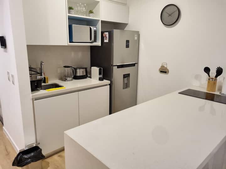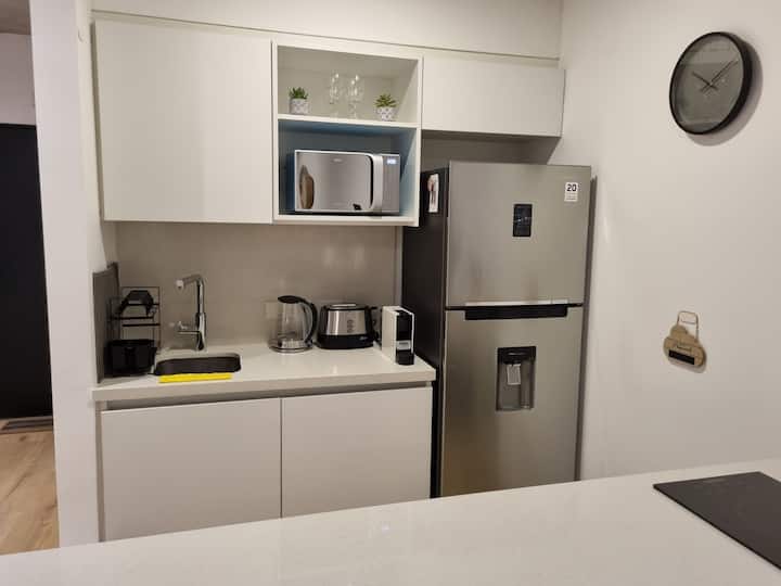 Квартира-студия площадью 43 m², новая. Большая гостиная с диваном-кроватью, балконом с деревянной отделкой и рабочим местом, быстрый WiFi. Кухня укомплектована, есть барная стойка для завтраков. В здании на крыше: бассейн, общая зона с солярием, прачечная; также есть тренажёрный зал. На первом этаже располагаются Lucciano's, Carrefour и кафе во внутреннем дворике. Территория с охраной и самостоятельное заселение.