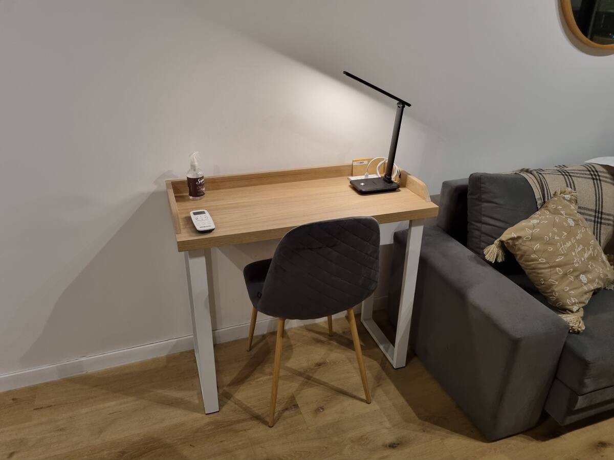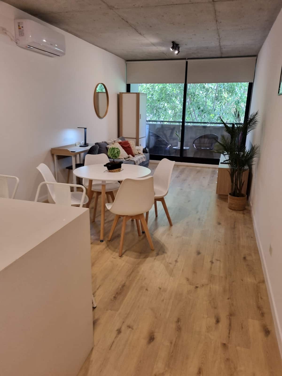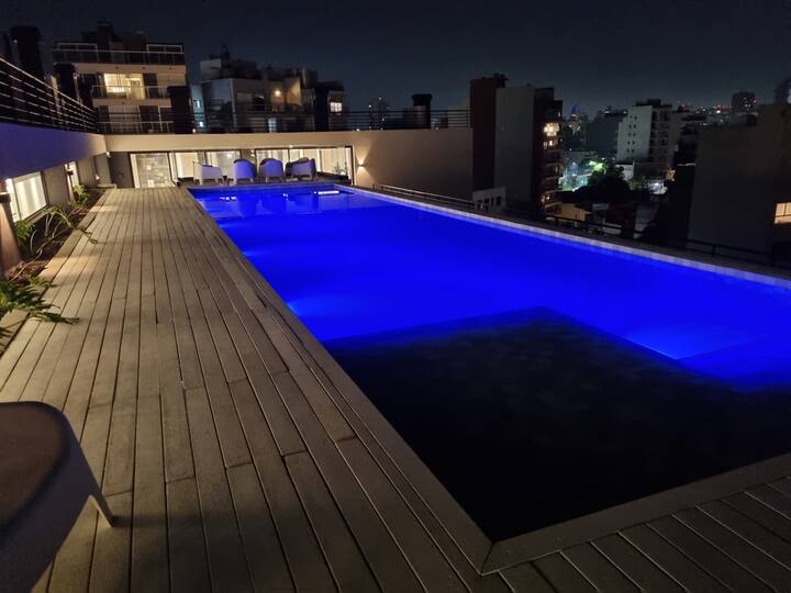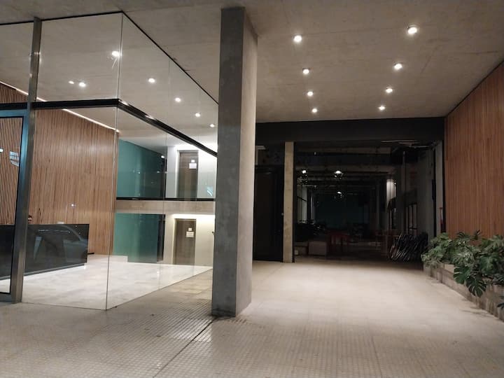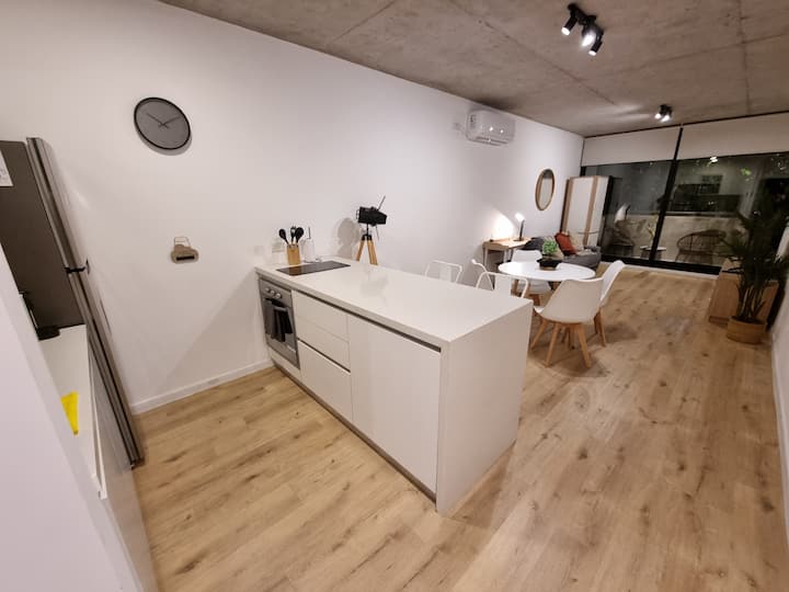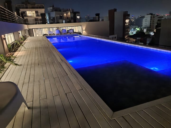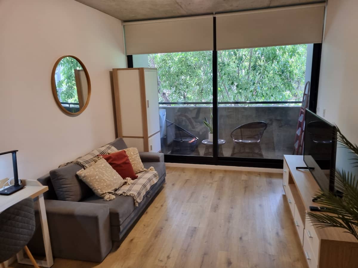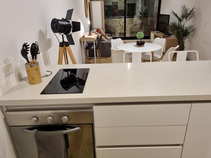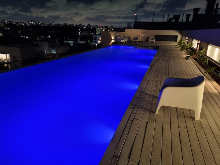 Квартира-студия площадью 43 m², новая. Большая гостиная с диваном-кроватью, балконом с деревянной отделкой и рабочим местом, быстрый WiFi. Кухня укомплектована, есть барная стойка для завтраков. В здании на крыше: бассейн, общая зона с солярием, прачечная; также есть тренажёрный зал. На первом этаже располагаются Lucciano's, Carrefour и кафе во внутреннем дворике. Территория с охраной и самостоятельное заселение.