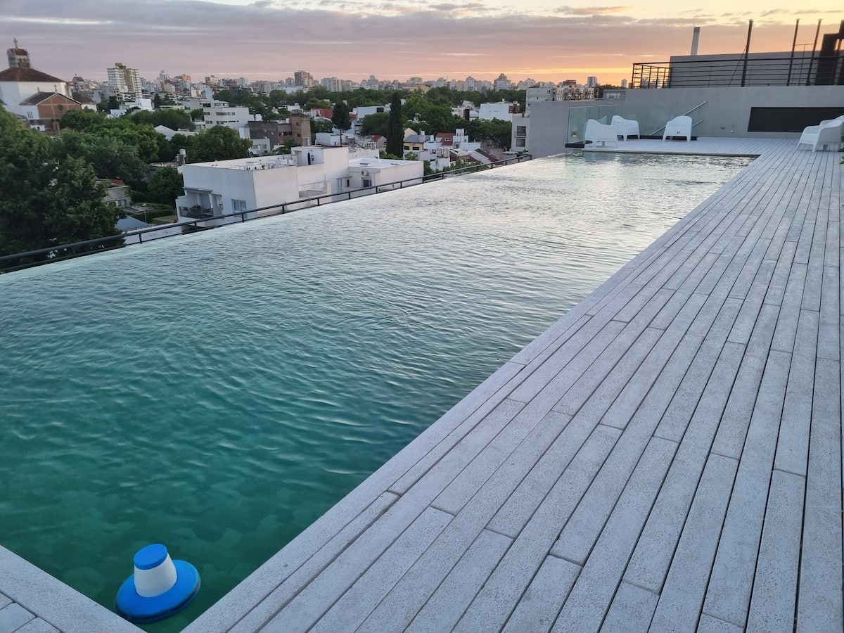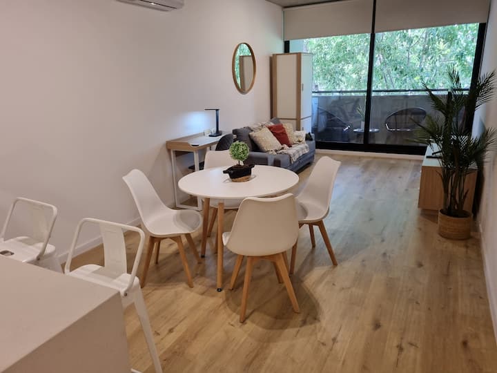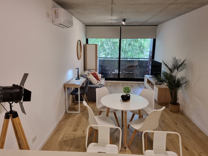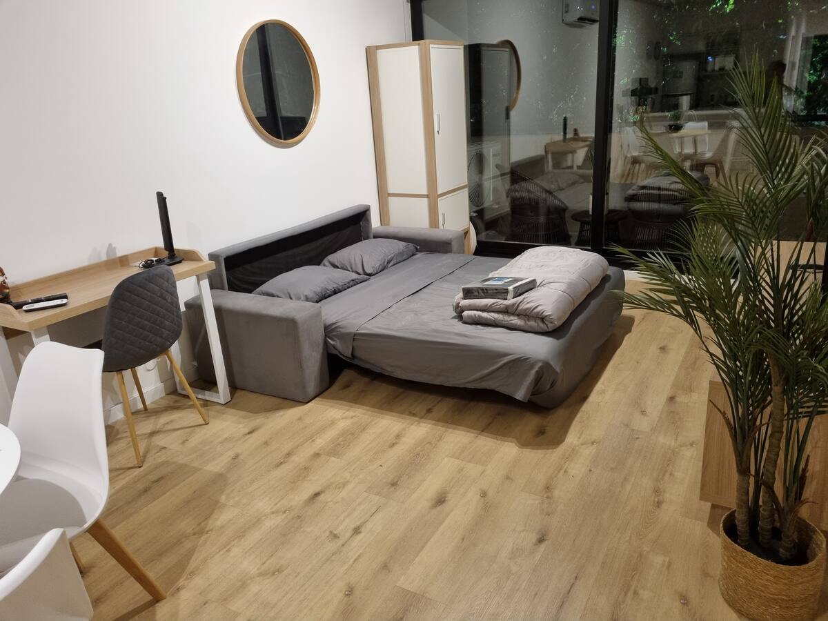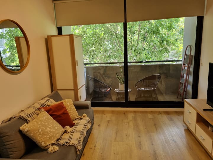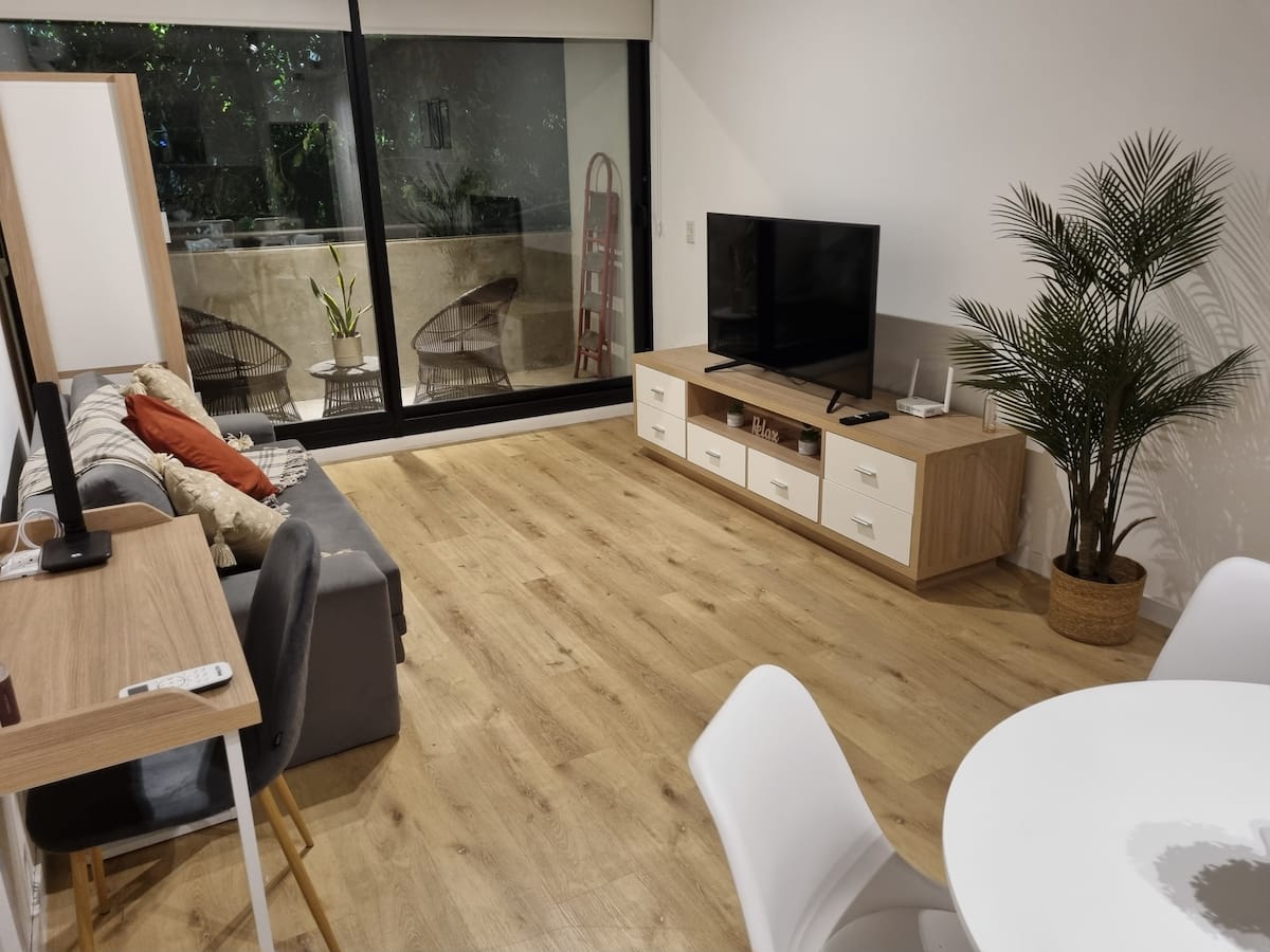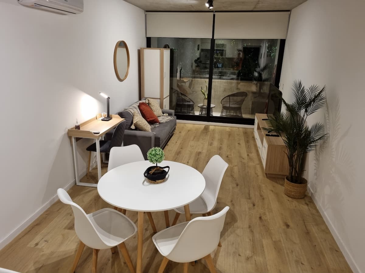 Квартира-студия площадью 43 m², новая. Большая гостиная с диваном-кроватью, балконом с деревянной отделкой и рабочим местом, быстрый WiFi. Кухня укомплектована, есть барная стойка для завтраков. В здании на крыше: бассейн, общая зона с солярием, прачечная; также есть тренажёрный зал. На первом этаже располагаются Lucciano's, Carrefour и кафе во внутреннем дворике. Территория с охраной и самостоятельное заселение.
