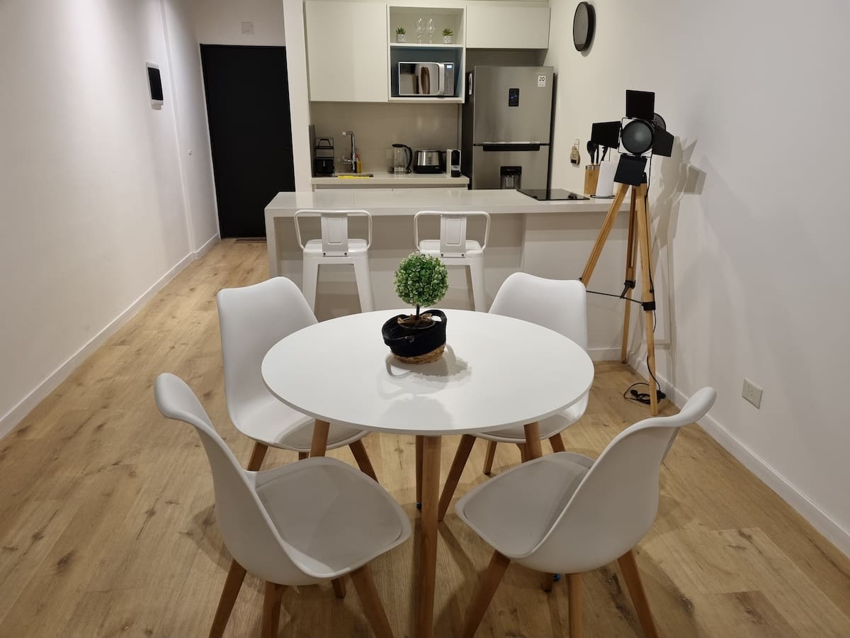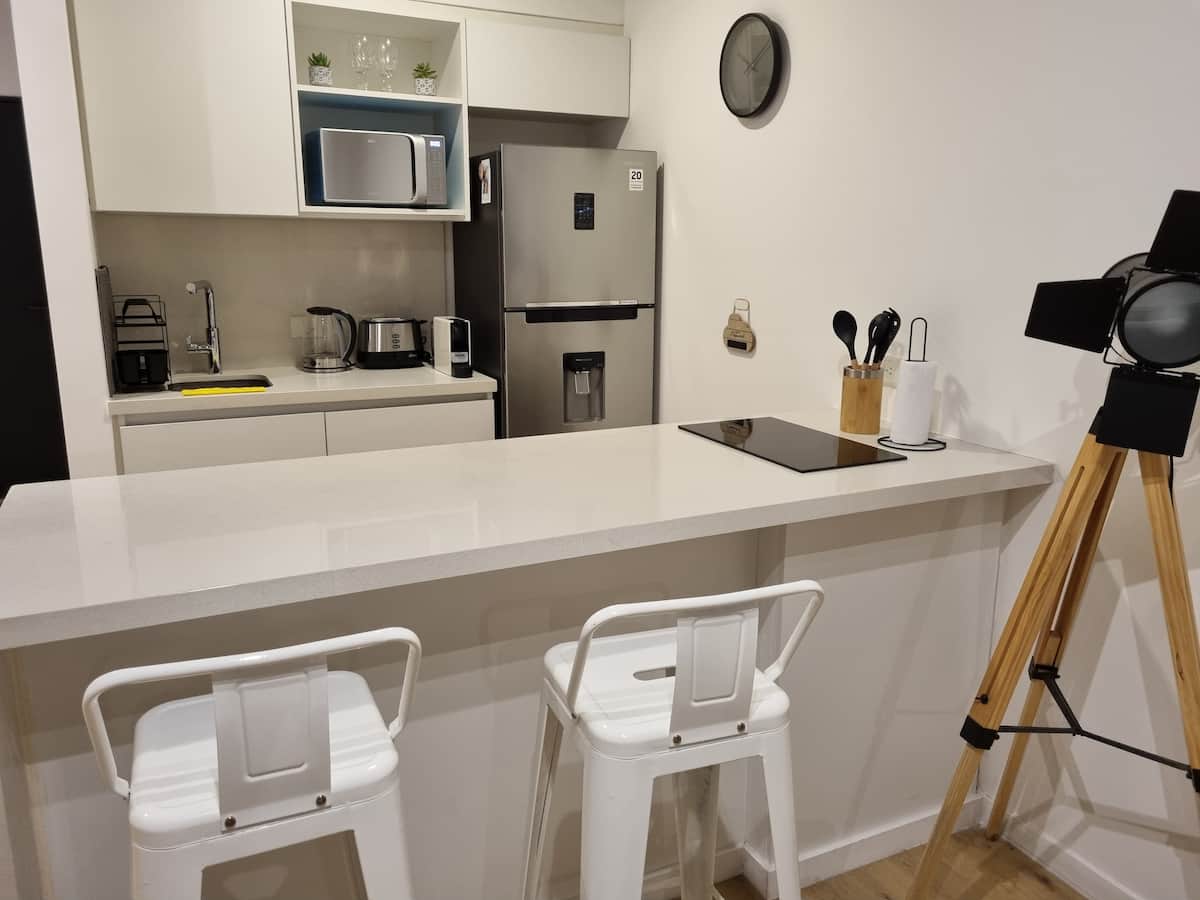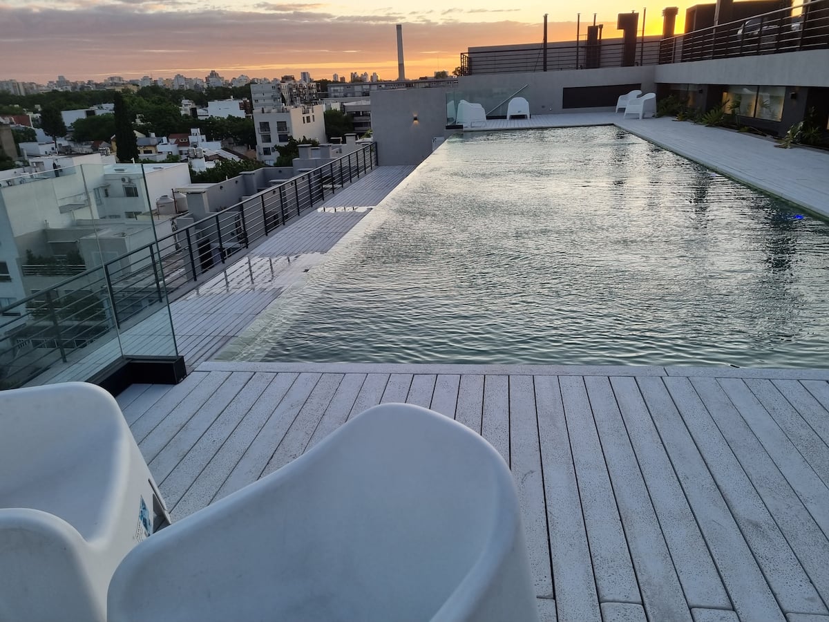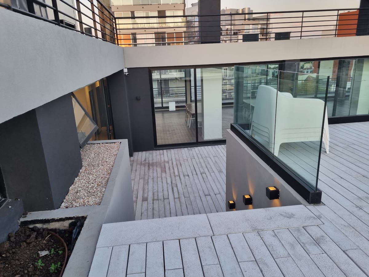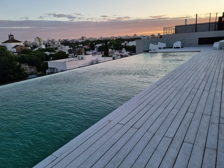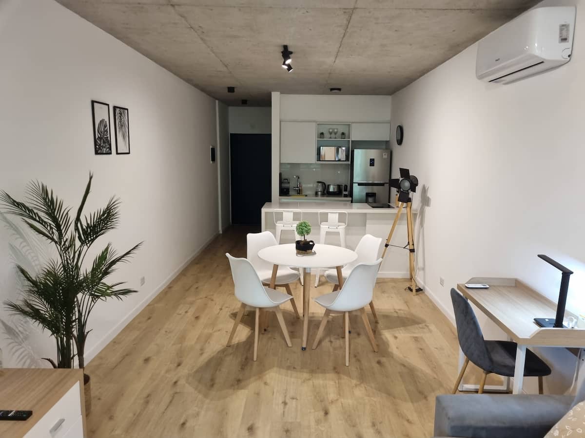Квартира-студия площадью 43 m², новая. Большая гостиная с диваном-кроватью, балконом с деревянной отделкой и рабочим местом, быстрый WiFi. Кухня укомплектована, есть барная стойка для завтраков. В здании на крыше: бассейн, общая зона с солярием, прачечная; также есть тренажёрный зал. На первом этаже располагаются Lucciano's, Carrefour и кафе во внутреннем дворике. Территория с охраной и самостоятельное заселение.