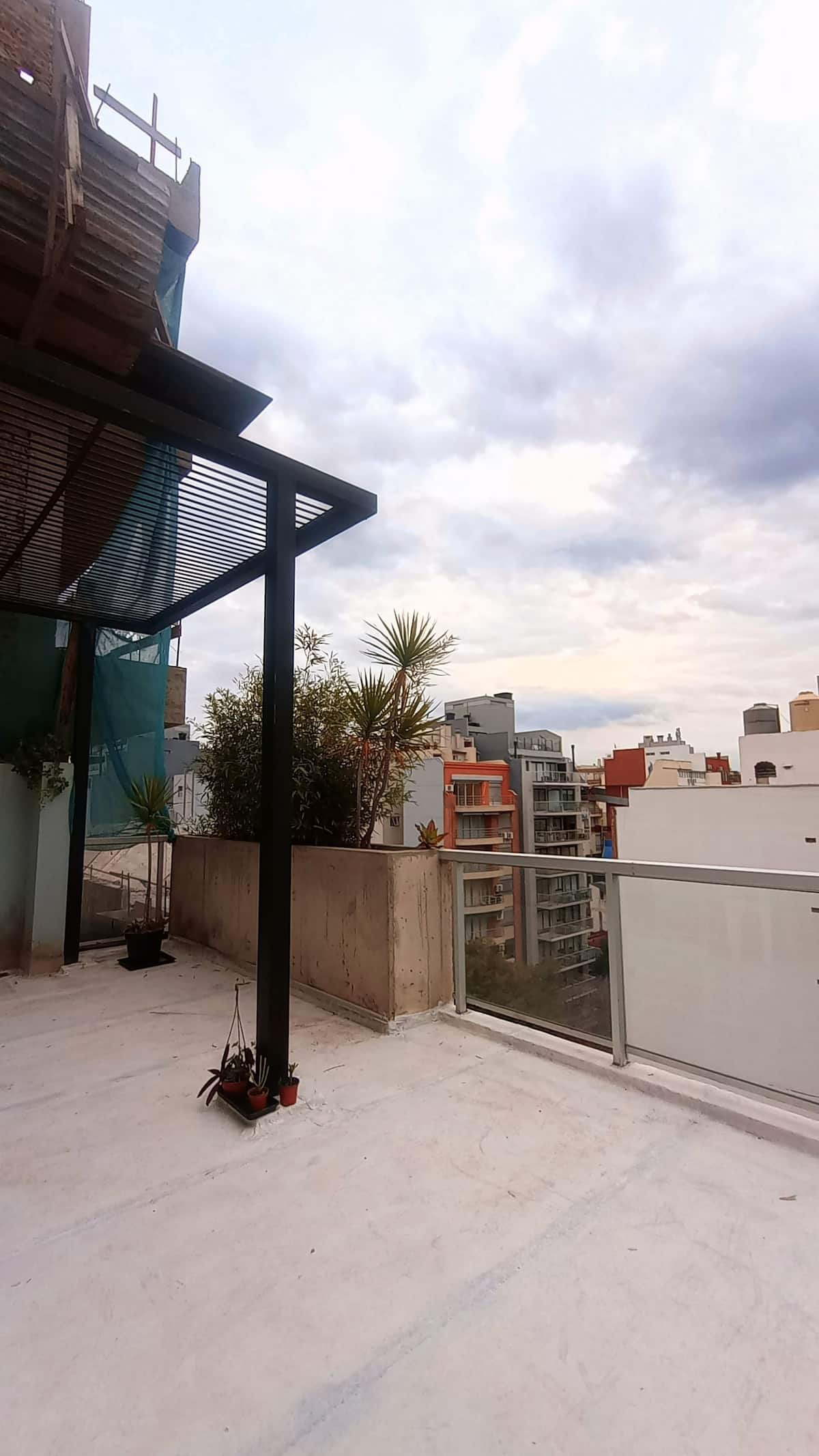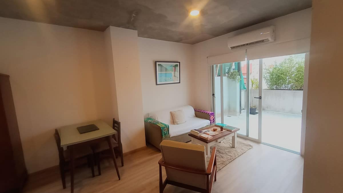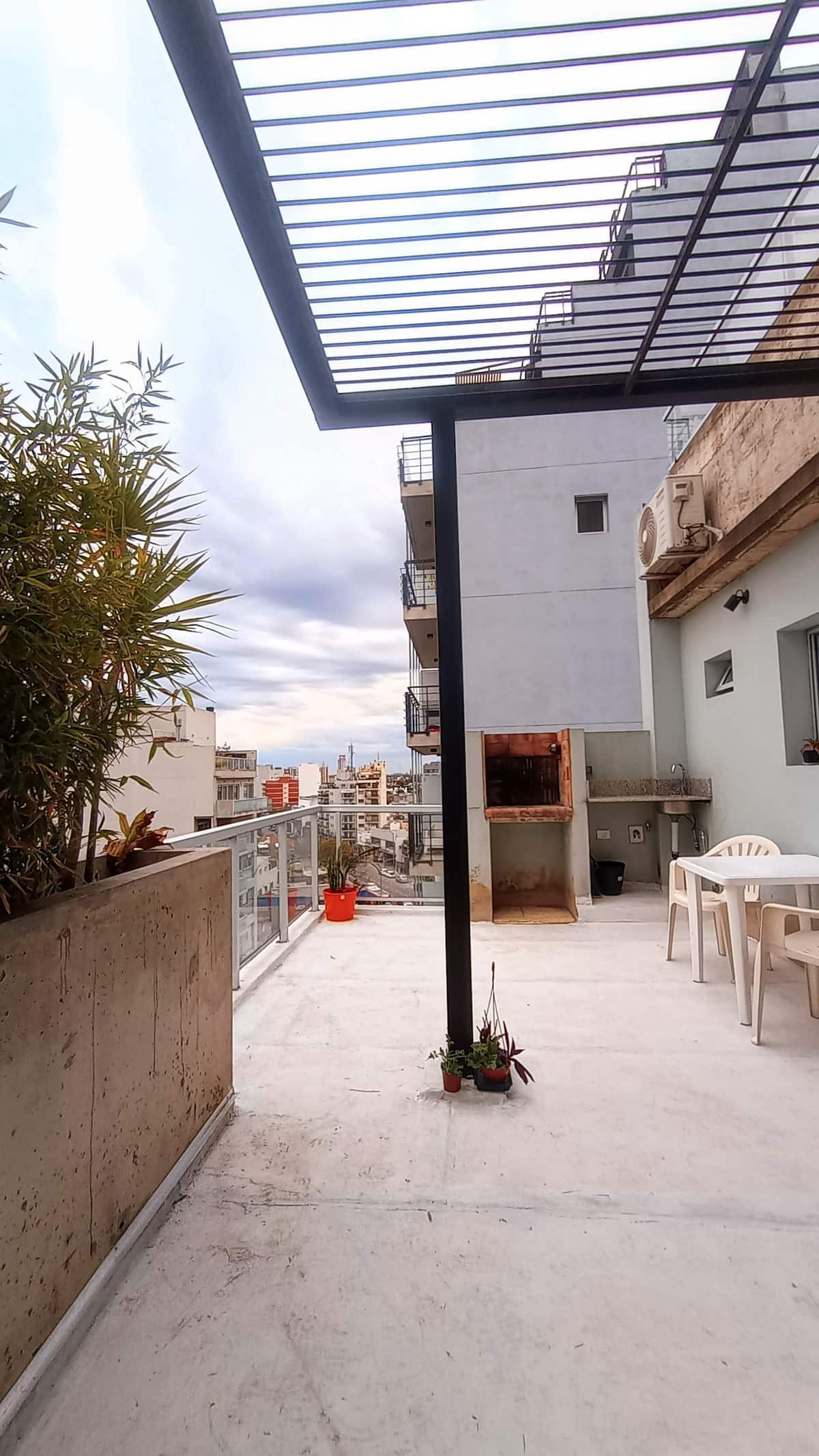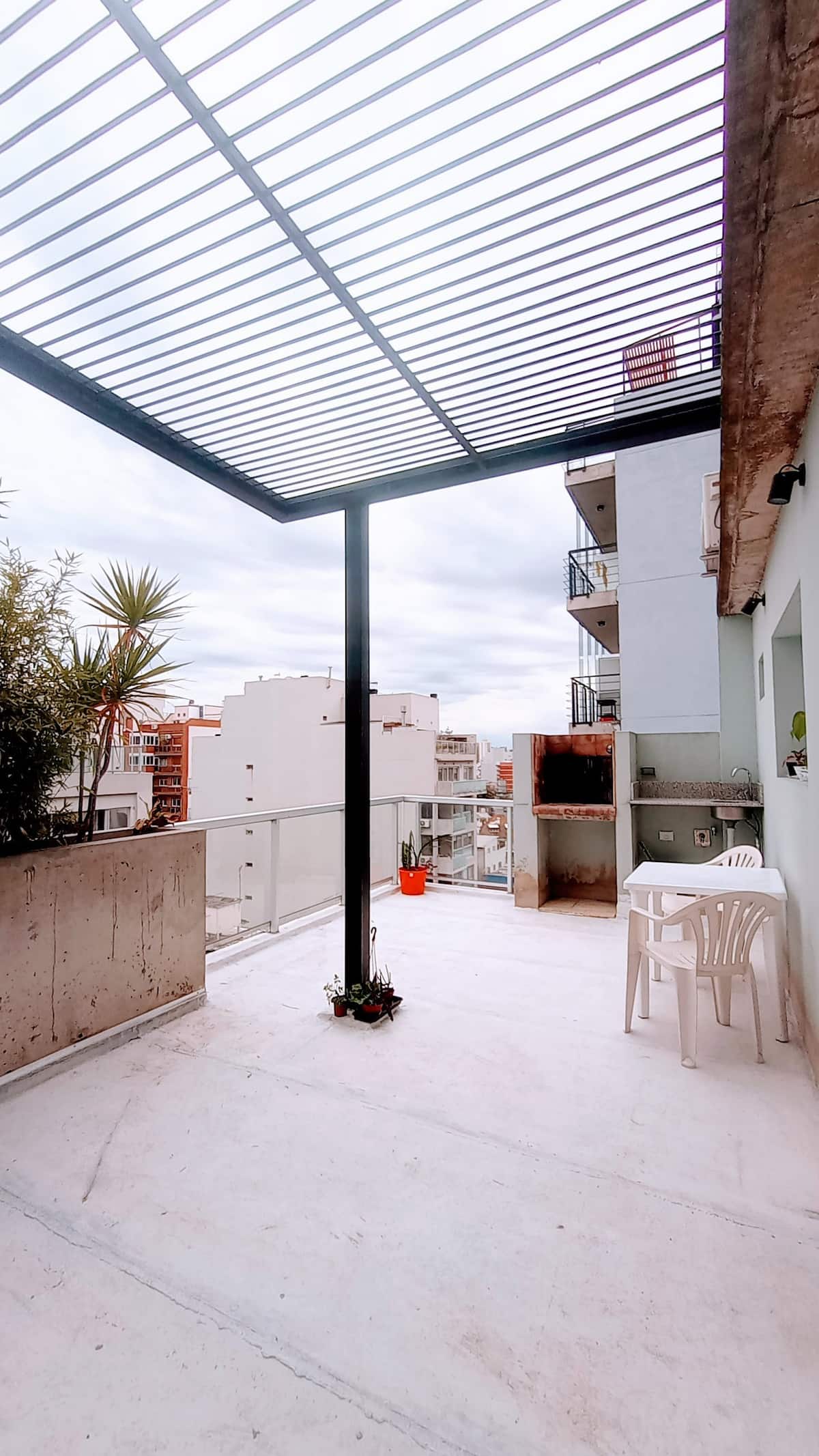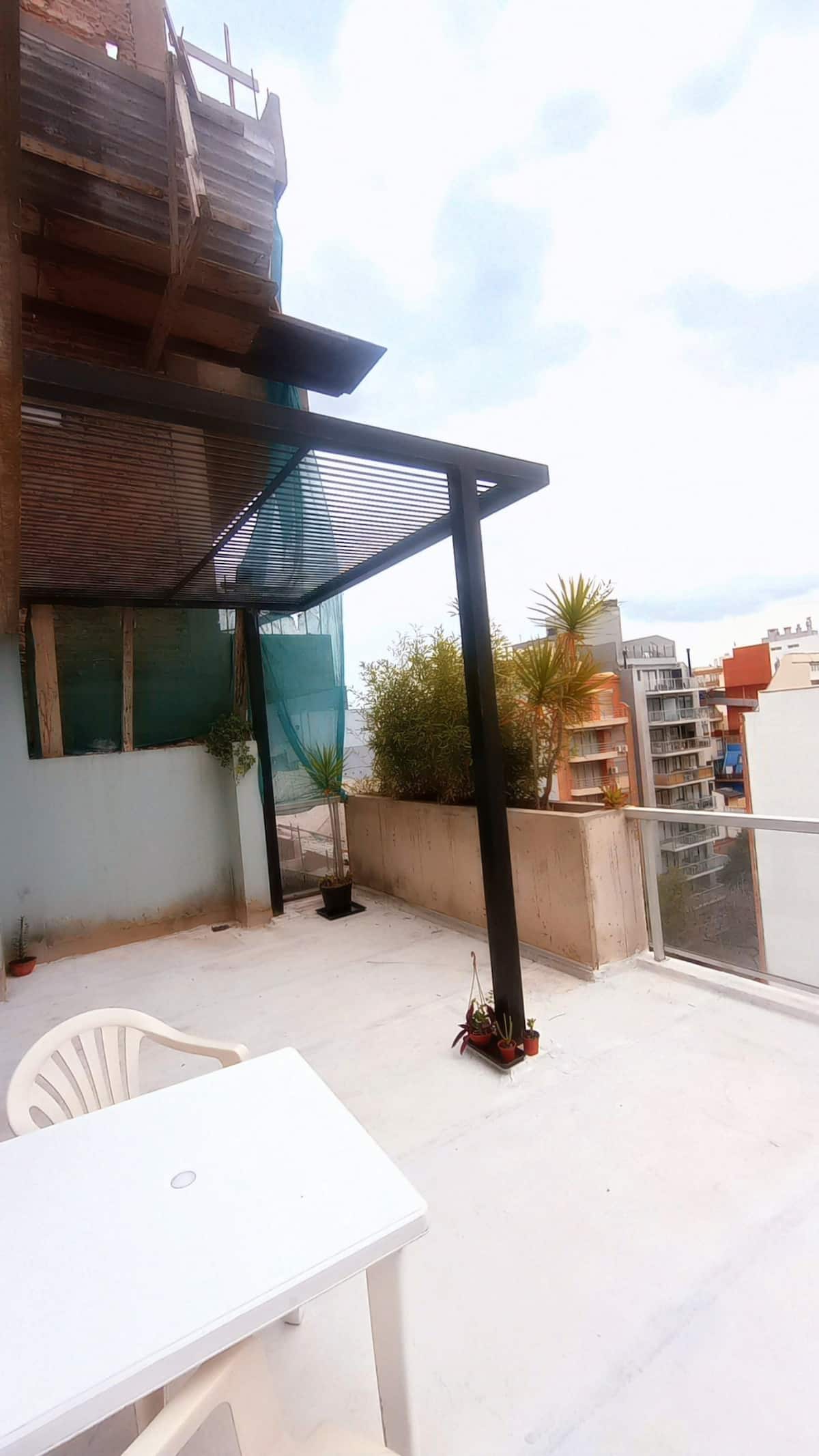 Квартира-студия с частной террасой. На террасе предусмотрена зона гриля. В описании указано, что помещение отличается высокой освещённостью и видами на город.