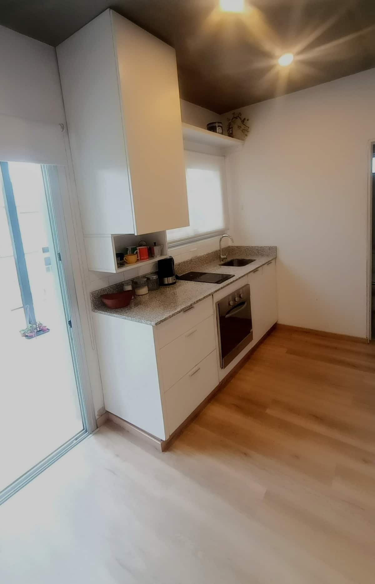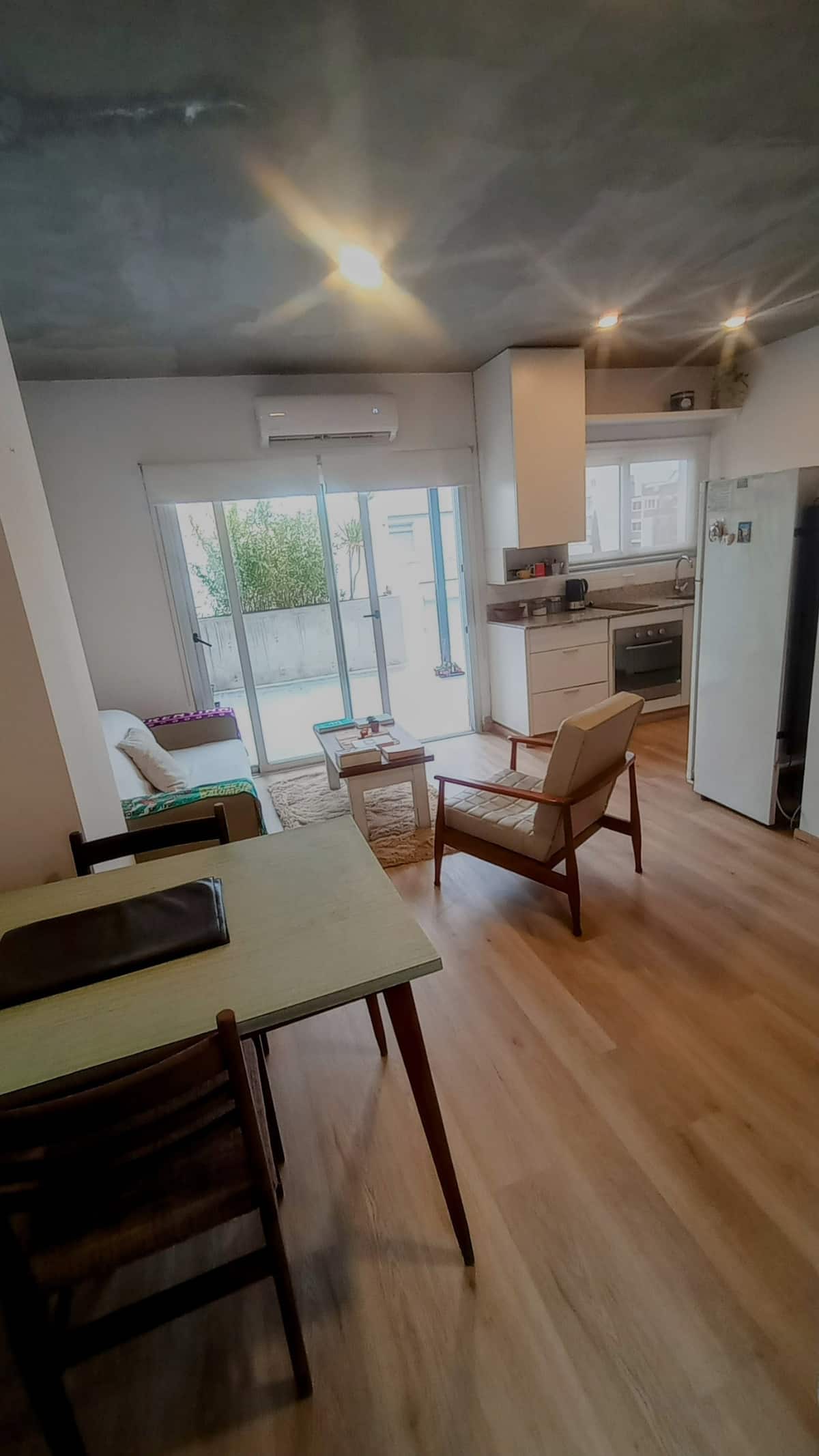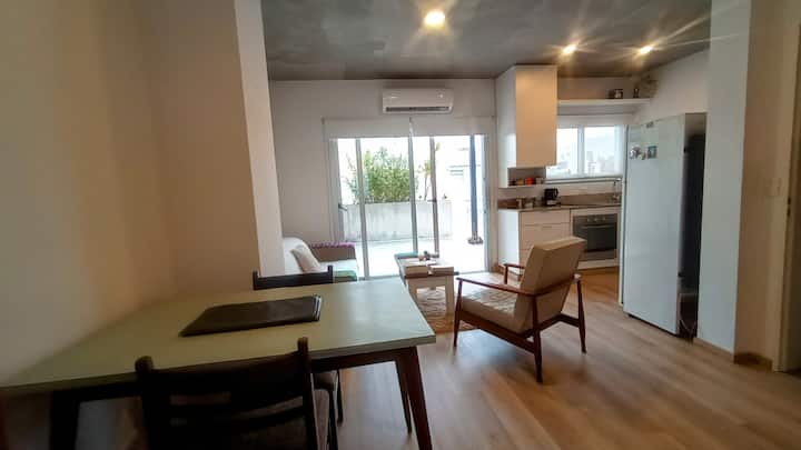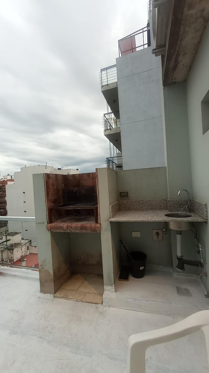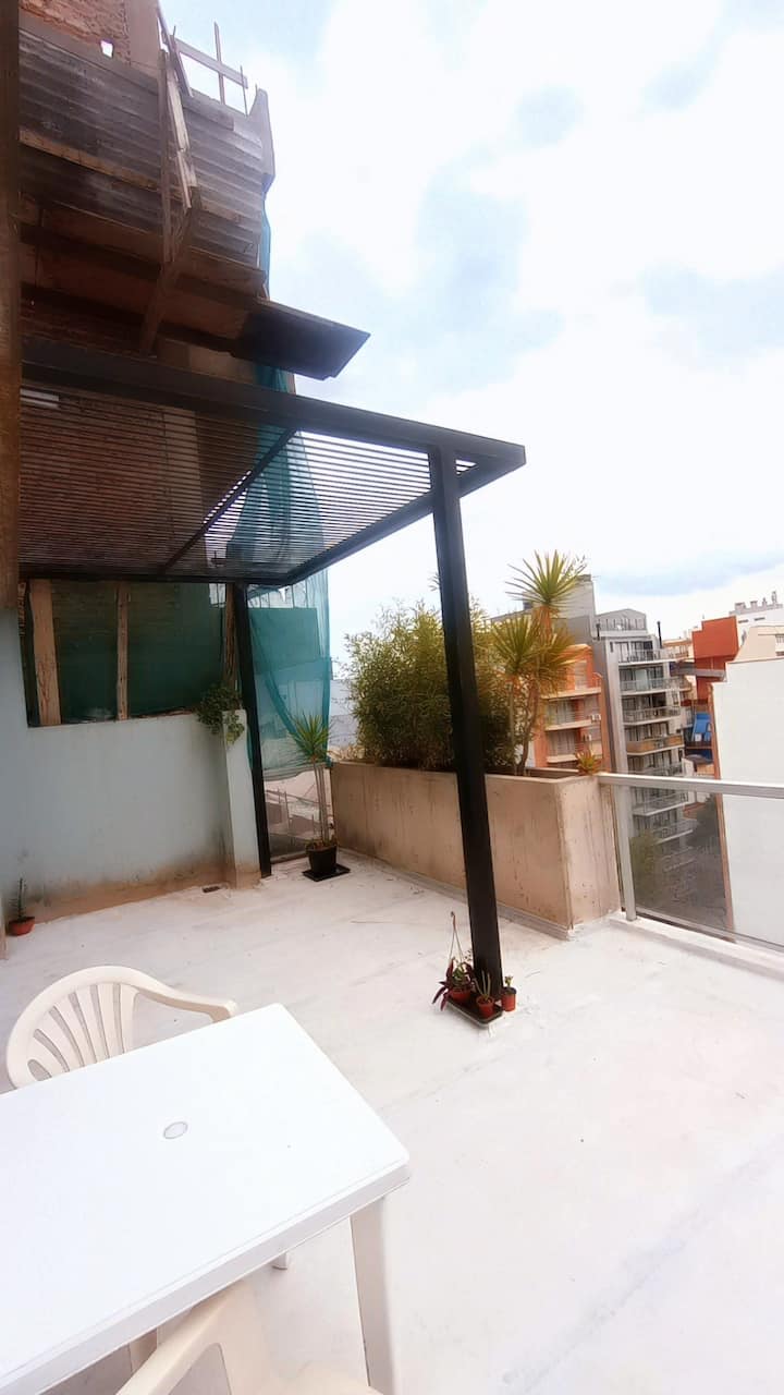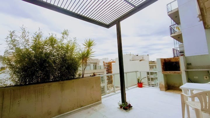 Квартира-студия с частной террасой. На террасе предусмотрена зона гриля. В описании указано, что помещение отличается высокой освещённостью и видами на город.