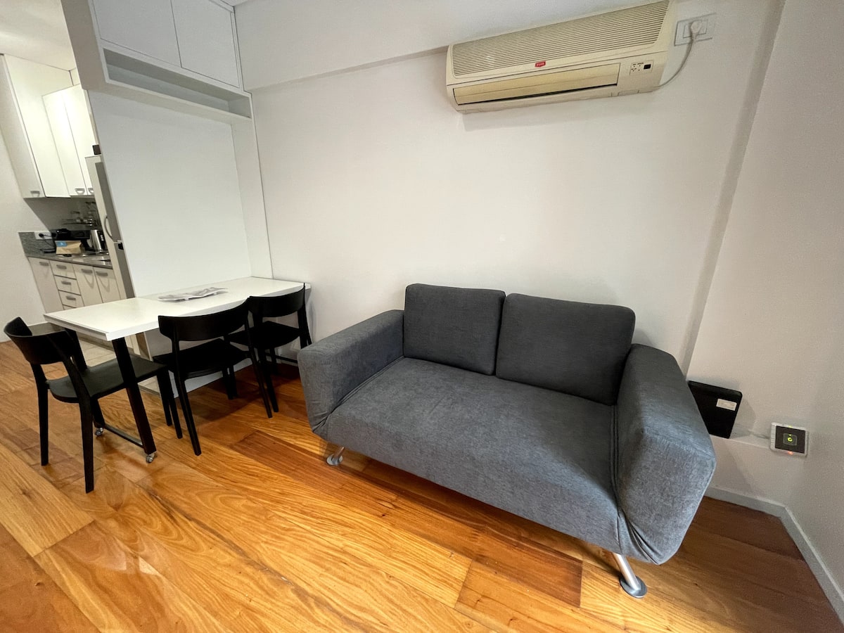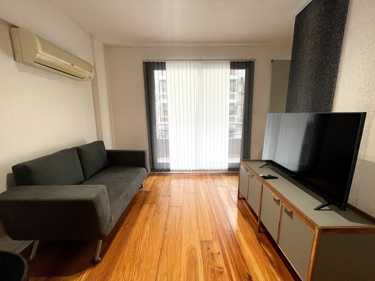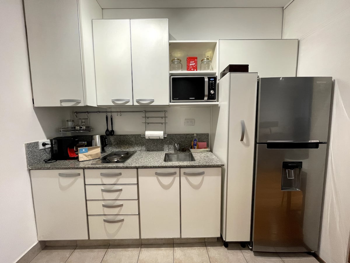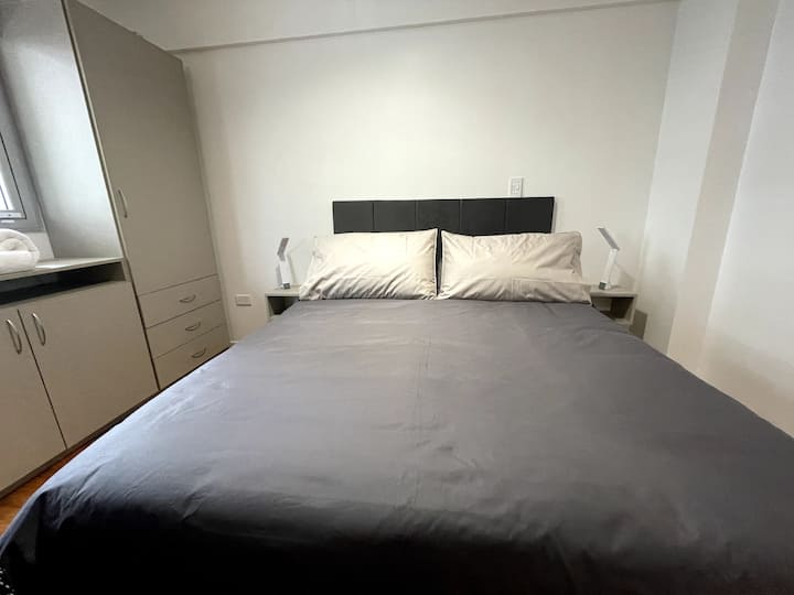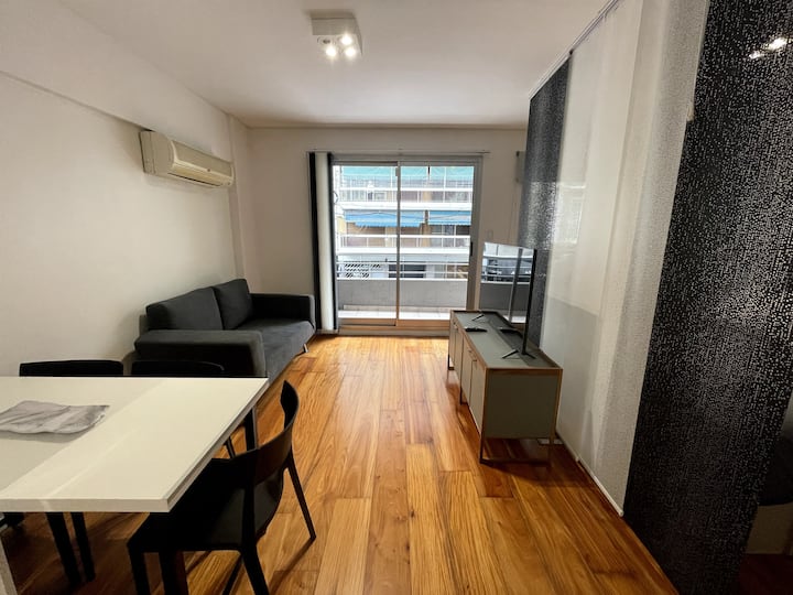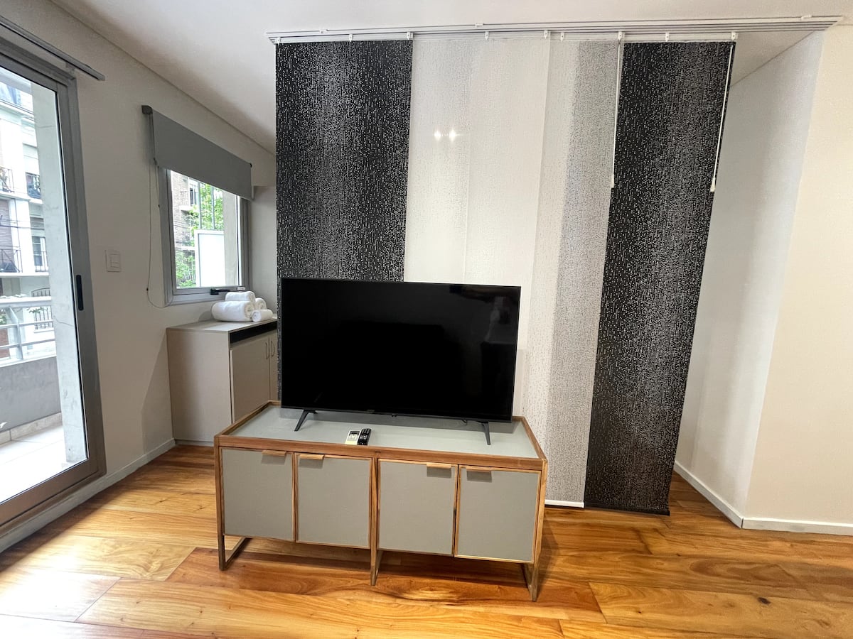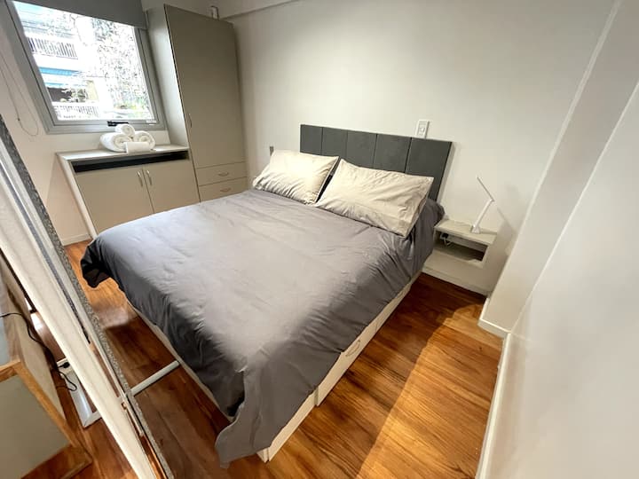 Квартира-студия площадью 40 m² в Colegiales. Помещение оборудовано и с мебелью: двуспальная кровать, тумбы, обеденный стол, посуда и Smart TV. Кондиционер с горячим и холодным воздухом, постельное бельё и полотенца входят в комплектацию. Апартаменты расположены рядом со станцией метро и основными автобусными линиями.