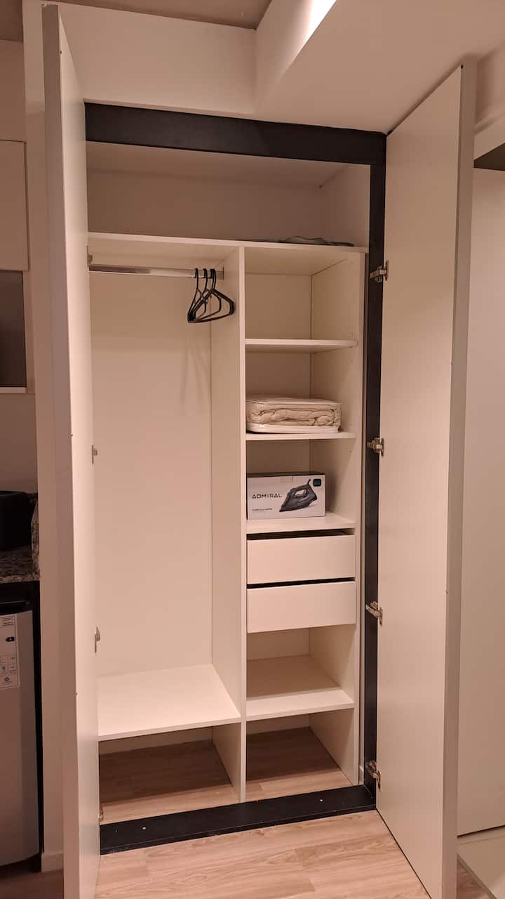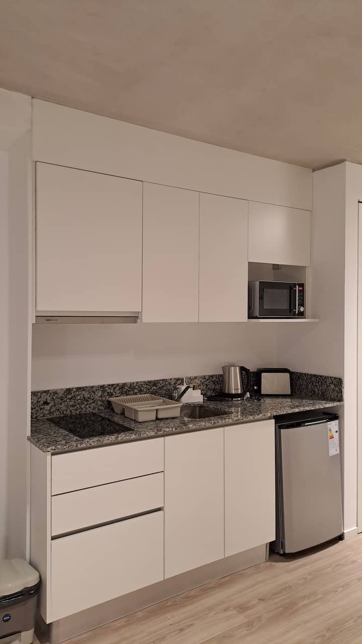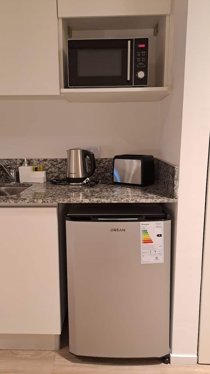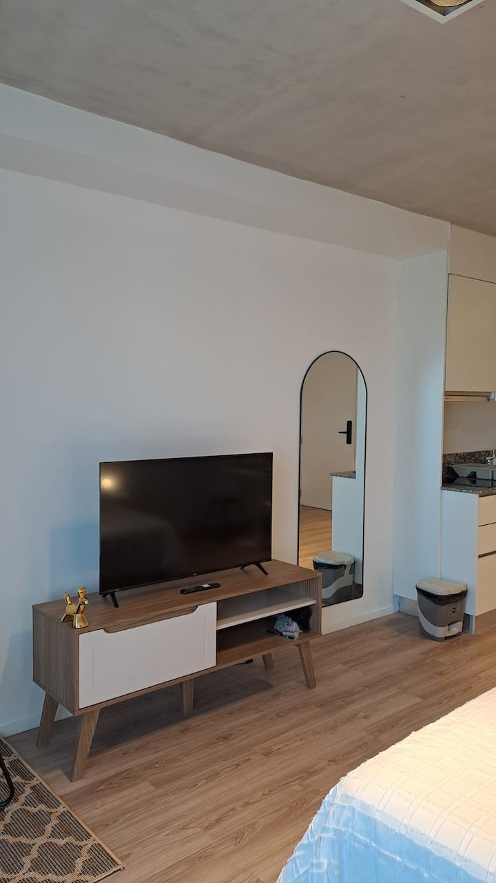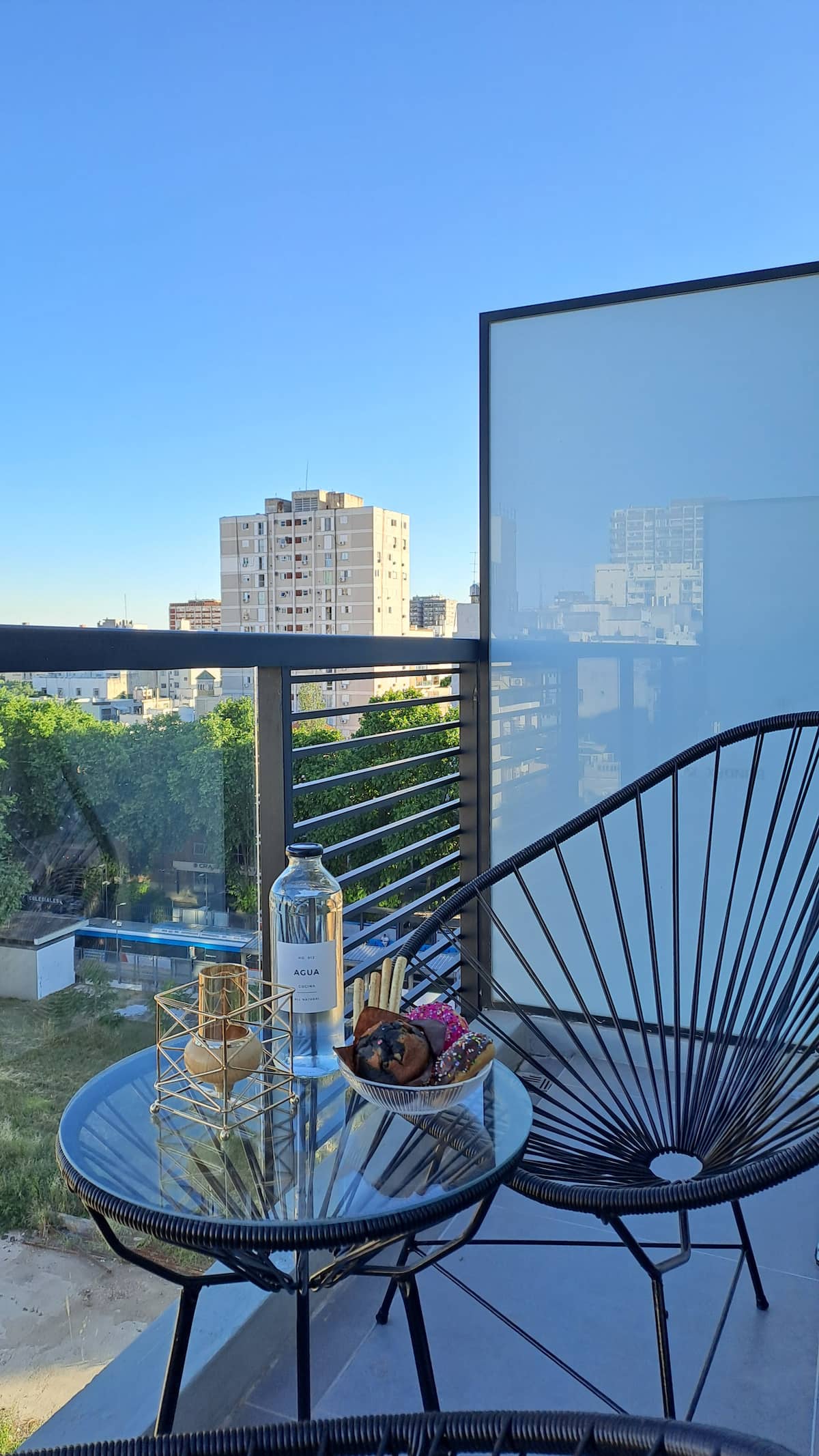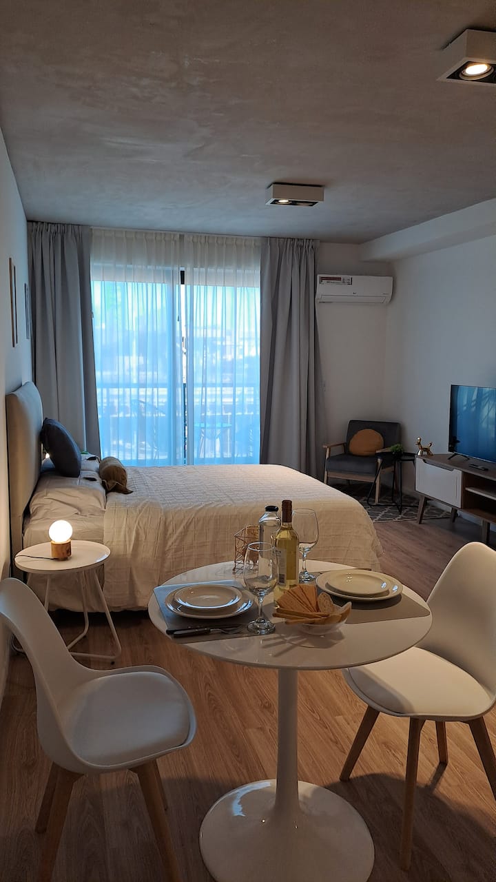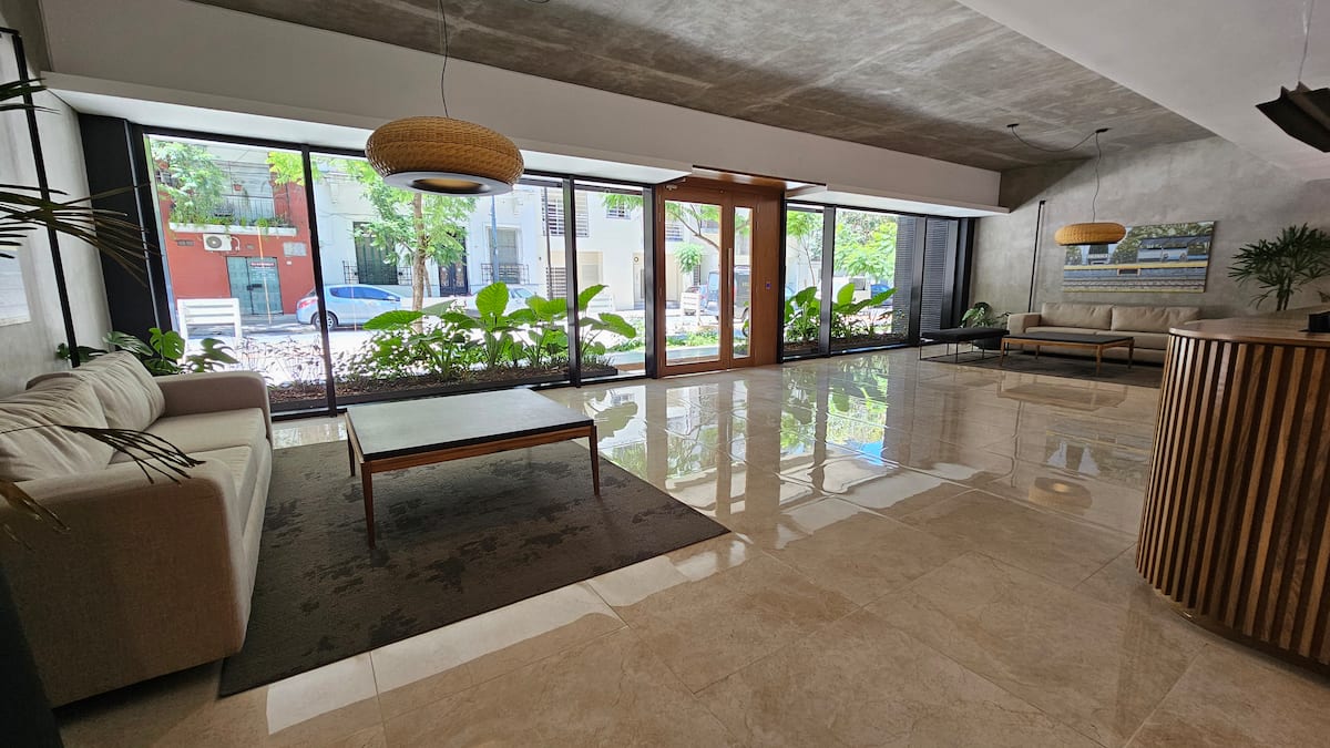 Квартира-студия площадью 30 m² в Colegiales на 5-м этаже. Окна выходят на балкон с мебелью. В квартире есть двуспальная кровать, системы хранения и шторы, полностью оборудованная кухня с электрической плитой, микроволновой печью и холодильником, а также кондиционер, Wi‑Fi и Smart TV. В ванной комнате установлена душевая кабина, фен и полотенца, предусмотрены утюг и гладильная доска, есть стол на 2 места. В здании предусмотрены бассейн, солярий, спортзал и прачечная. Прачечная — самообслуживание