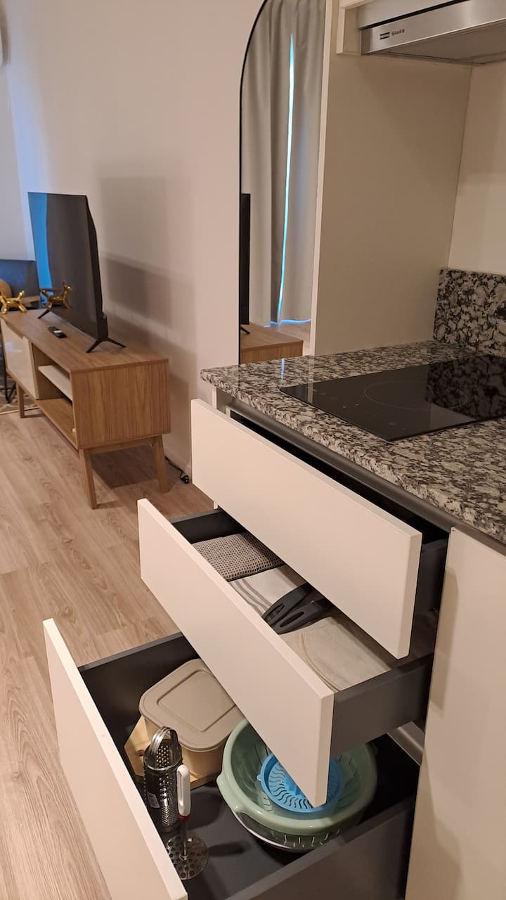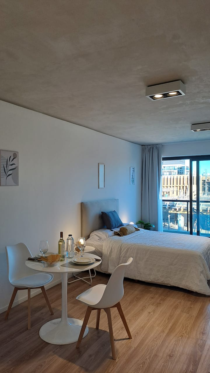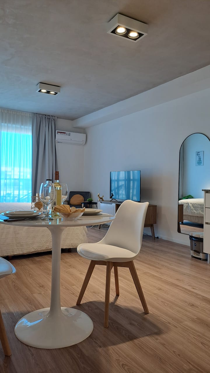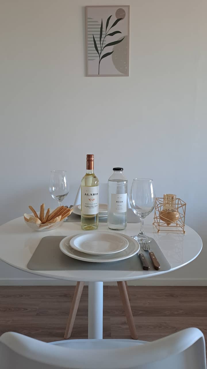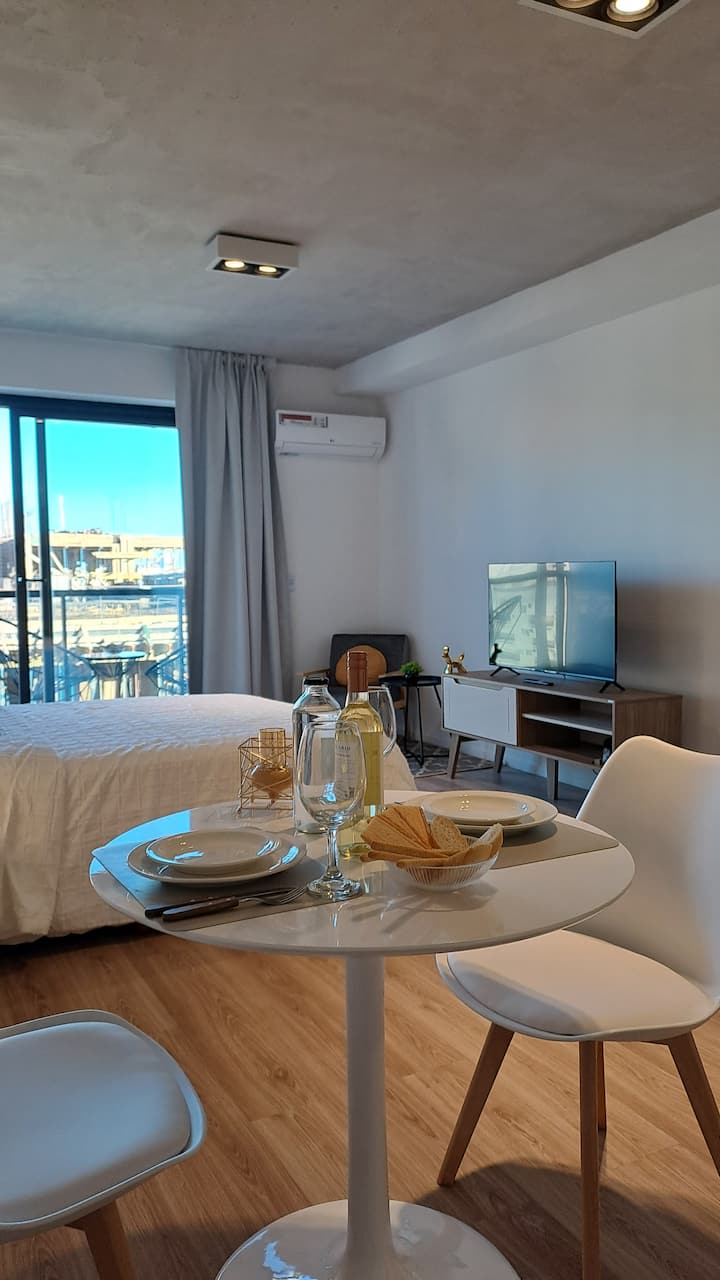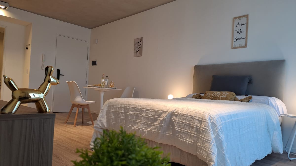 Квартира-студия площадью 30 m² в Colegiales на 5-м этаже. Окна выходят на балкон с мебелью. В квартире есть двуспальная кровать, системы хранения и шторы, полностью оборудованная кухня с электрической плитой, микроволновой печью и холодильником, а также кондиционер, Wi‑Fi и Smart TV. В ванной комнате установлена душевая кабина, фен и полотенца, предусмотрены утюг и гладильная доска, есть стол на 2 места. В здании предусмотрены бассейн, солярий, спортзал и прачечная. Прачечная — самообслуживание