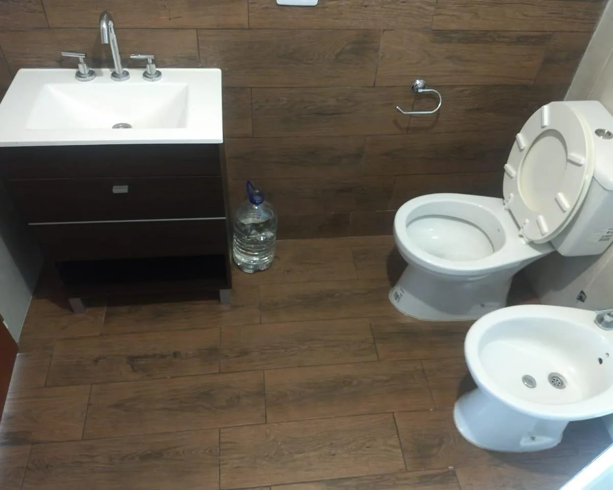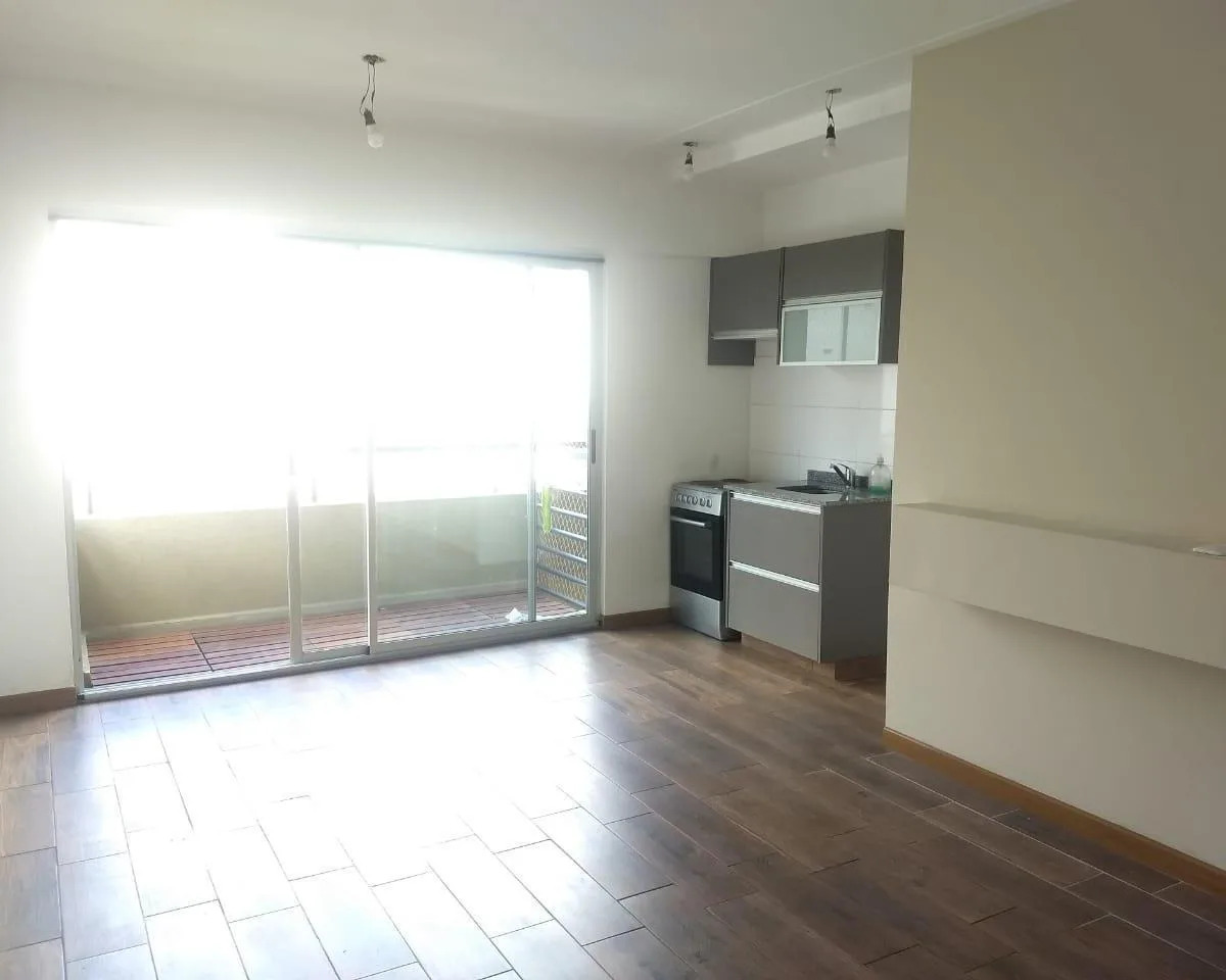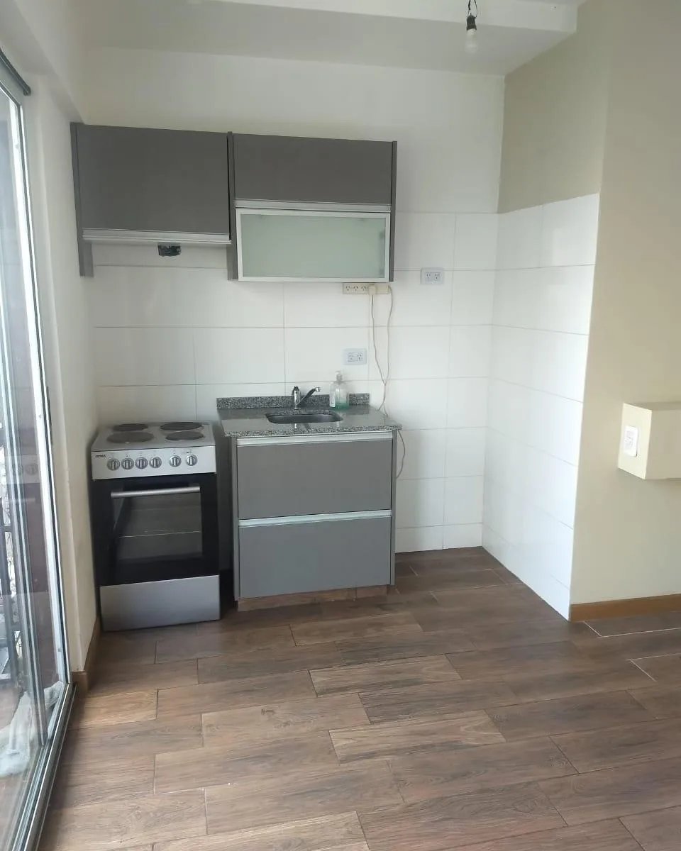 Квартира-студия в Flores, окна на улицу, с балконом. Площадь 30 m² (общие), планировка включает комнату с встроенной кухней с электрической плитой и мебелью верхних и нижних модулей. В прихожей шкаф, санузел с душевым поддоном и есть место для стиральной машины. Коммунальные платежи здания составляют около $115.000 и включают AySA, горячая вода централизованная.