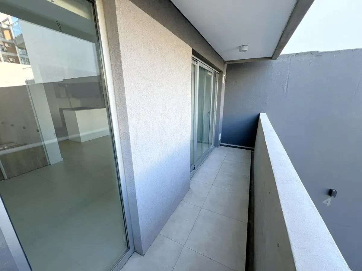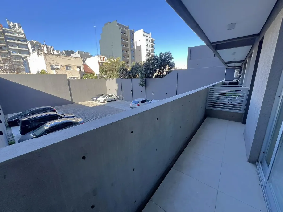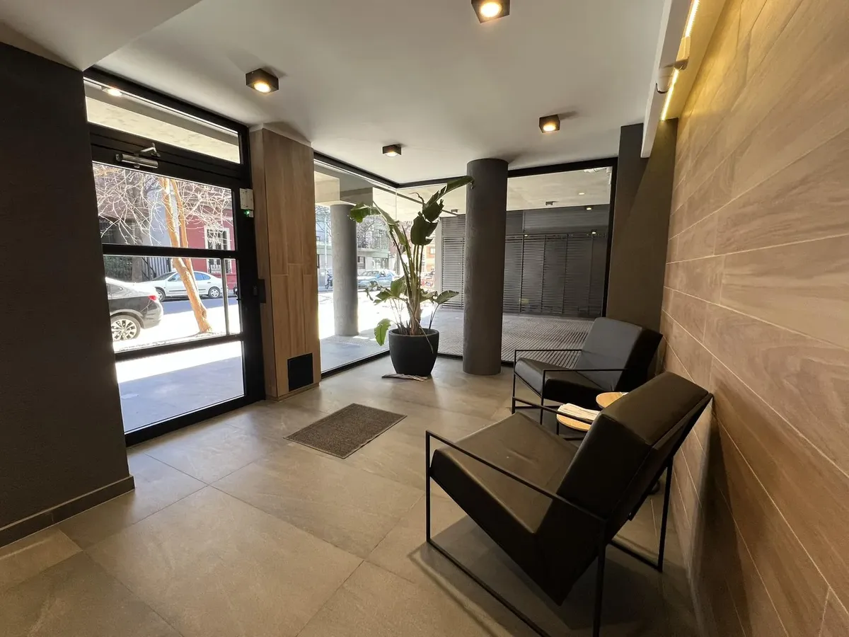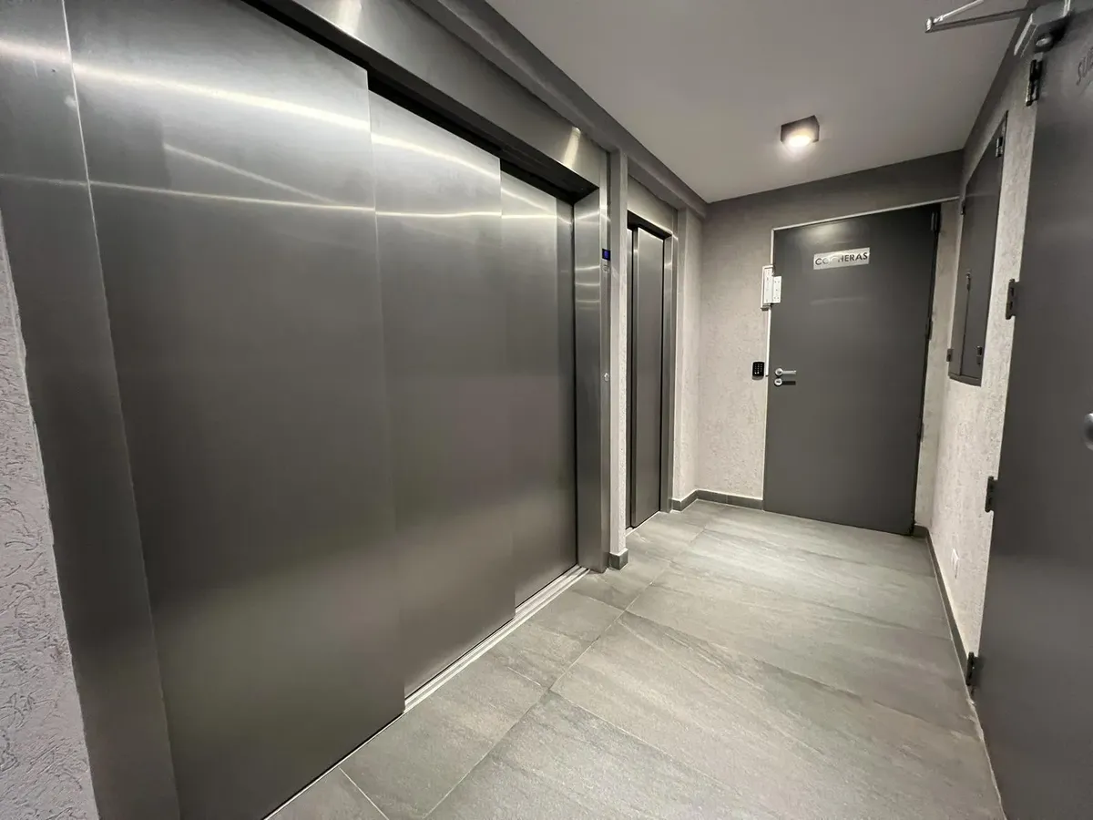 Квартира-студия в Flores, 1-й этаж, окна во двор/контра-фронт (балкон по всей длине). Ориентация на восток. В помещении плиточный пол, кухня в формате open space с газовой плитой и встроенной зоной для стирки, тёплая вода от электрического термонакопителя. Есть встроенный шкаф и ванная комната с ванной, сплит-кондиционер (холод/тепло). Окна из анодированного алюминия со стеклопакетами (DVH). В здании 2 лифта, один из них грузовой, рассчитан на 10 человек. На крыше: общая гостиная для жильцов (SU