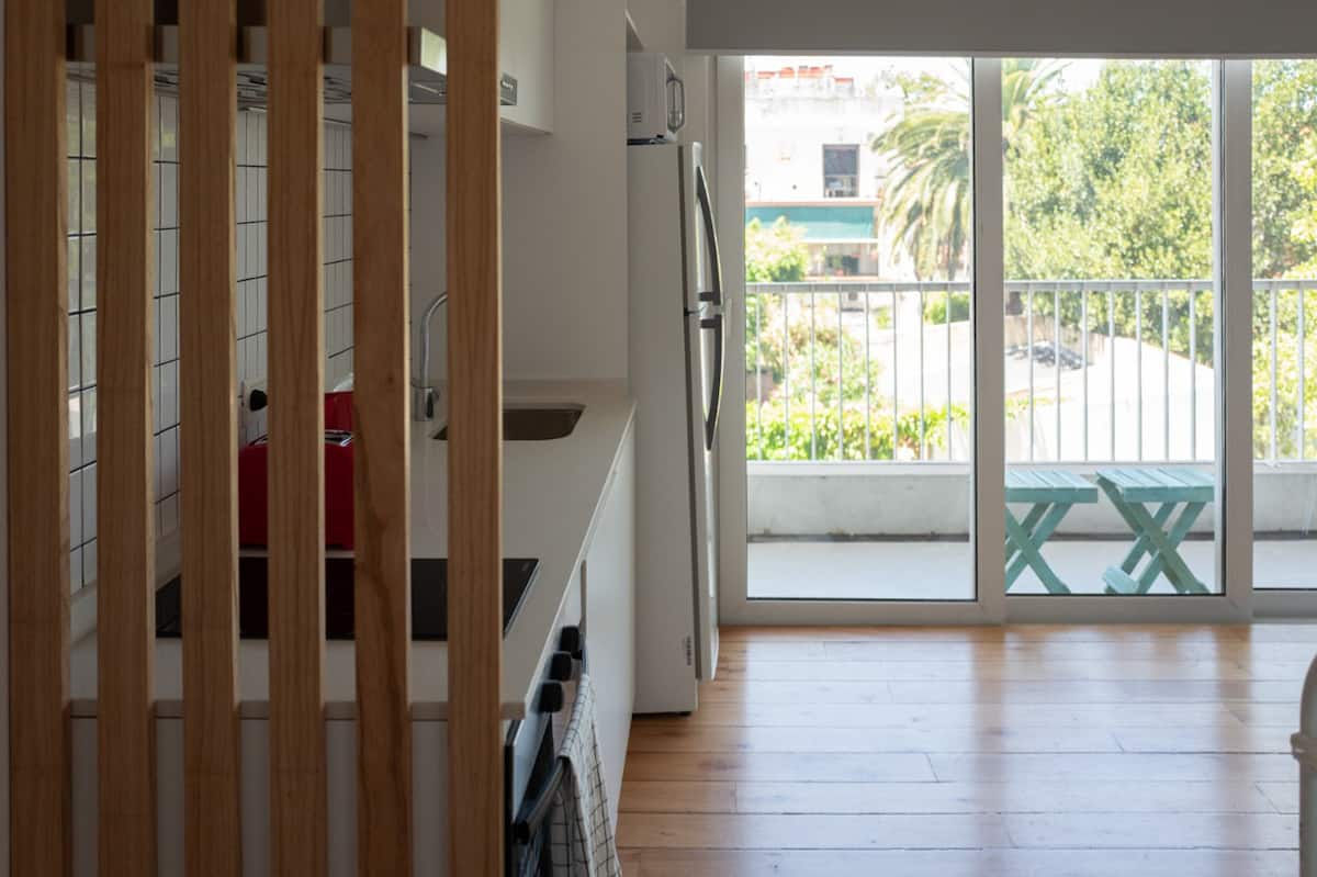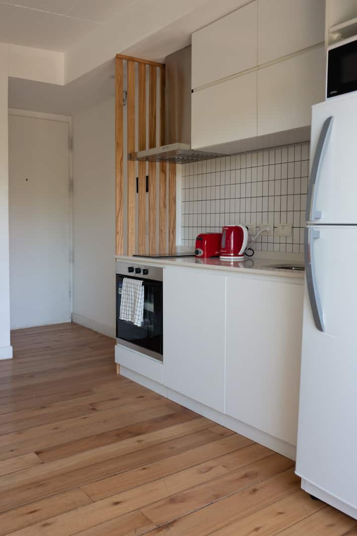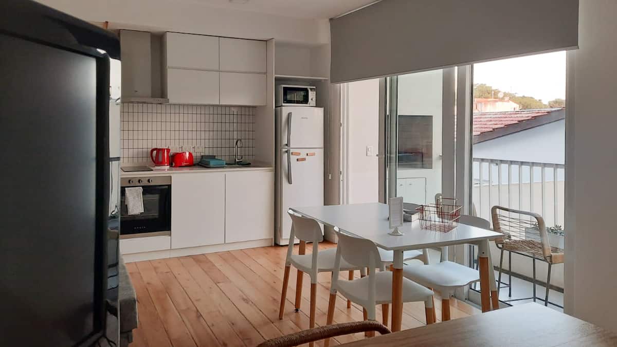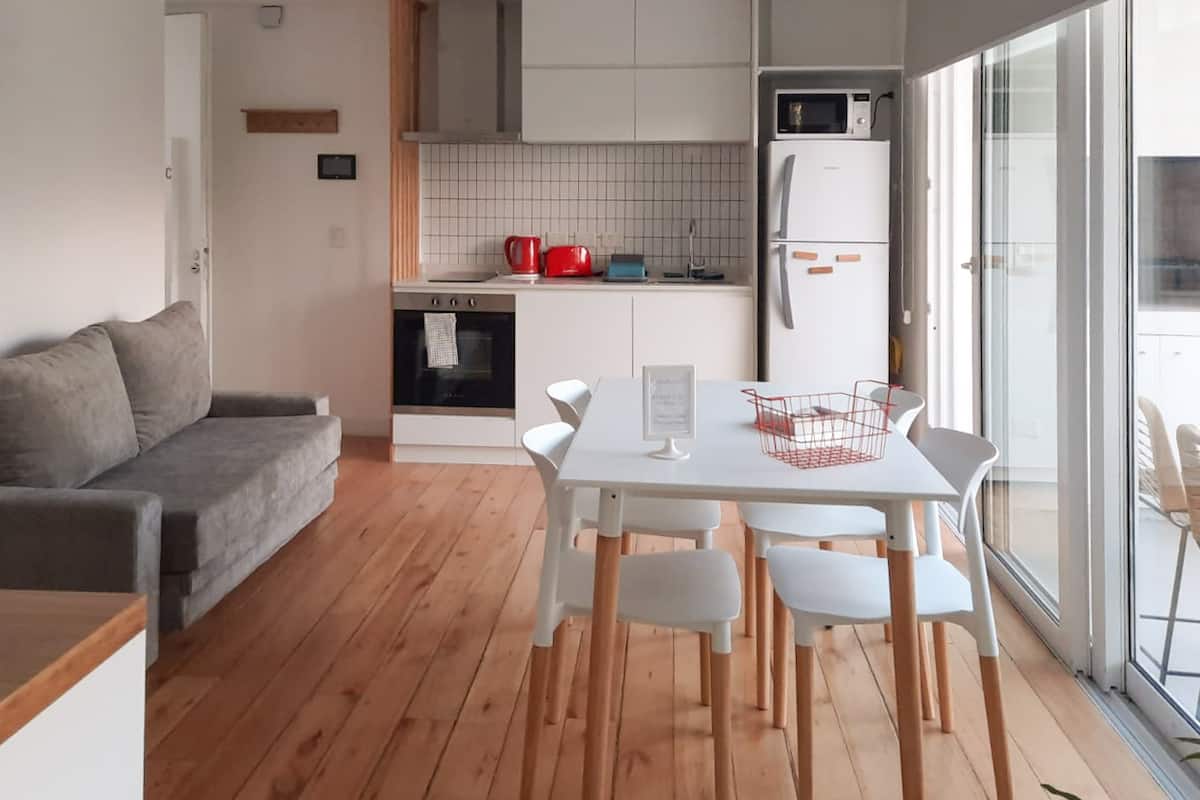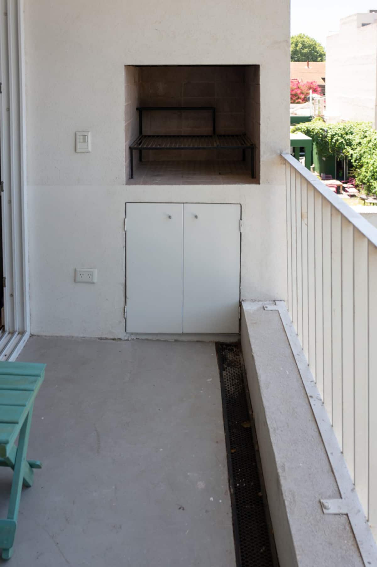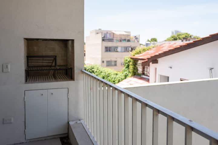 Квартира-студия площадью не указана, с мебелью: двуспальная кровать и диван-кровать. Полы из дерева, большие окна. Встроенная кухня, балкон с зоной гриля. В здании есть прачечная с стиральной машиной и сушилкой. Предусмотрено 1 закреплённое парковочное место для автомобиля или мотоцикла. Здание расположено в 5 кварталах от Av. Maipú, доступен общественный транспорт. Указано, что на автомобиле до въезда в CABA около 10 минут.