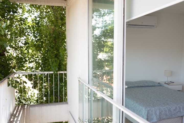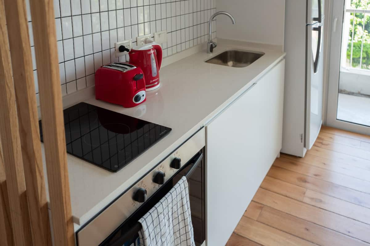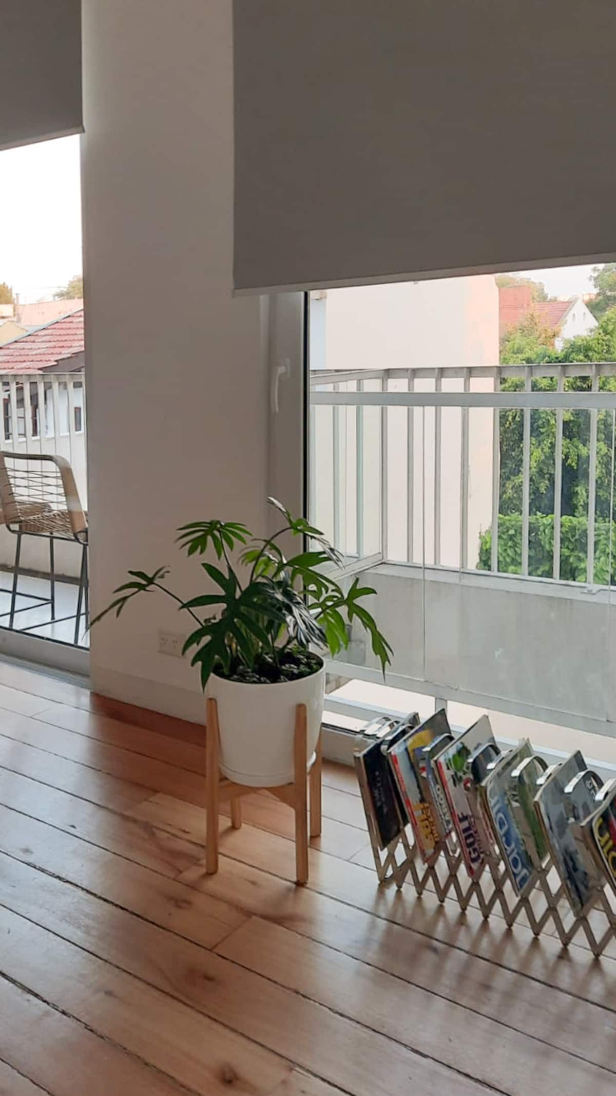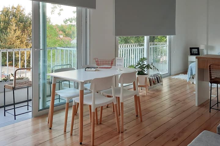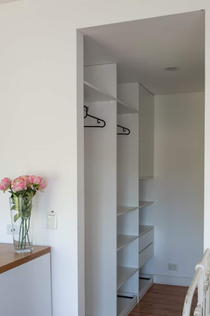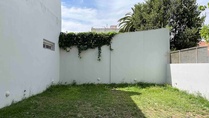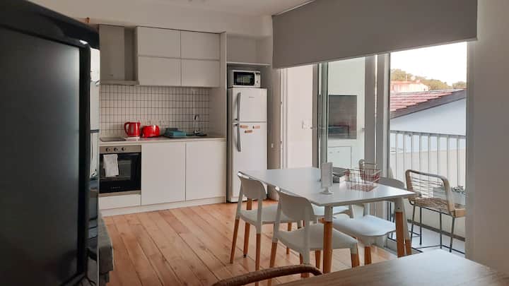 Квартира-студия площадью не указана, с мебелью: двуспальная кровать и диван-кровать. Полы из дерева, большие окна. Встроенная кухня, балкон с зоной гриля. В здании есть прачечная с стиральной машиной и сушилкой. Предусмотрено 1 закреплённое парковочное место для автомобиля или мотоцикла. Здание расположено в 5 кварталах от Av. Maipú, доступен общественный транспорт. Указано, что на автомобиле до въезда в CABA около 10 минут.