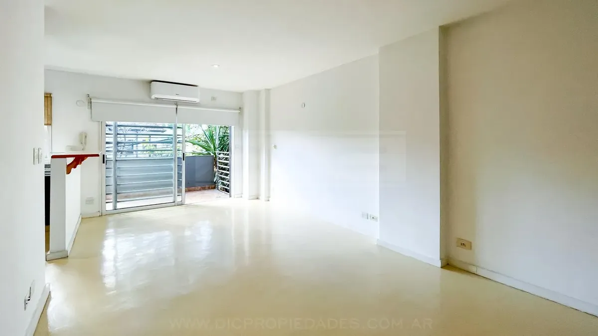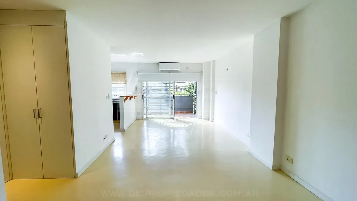 Квартира-студия площадью 40 m² в Florida, окна во двор не указаны, выход на балкон с видом на улицу Melo. Планировка включает общую гостиную-кухню с барной стойкой, полноценную ванную комнату и встроенный шкаф от пола до потолка. Установлены кондиционер (холод/тепло) и шторы black out. В здании предусмотрены круглосуточная охрана, бассейн с солярием, зона гриля, общая гостиная для жильцов (SUM) и laundry.