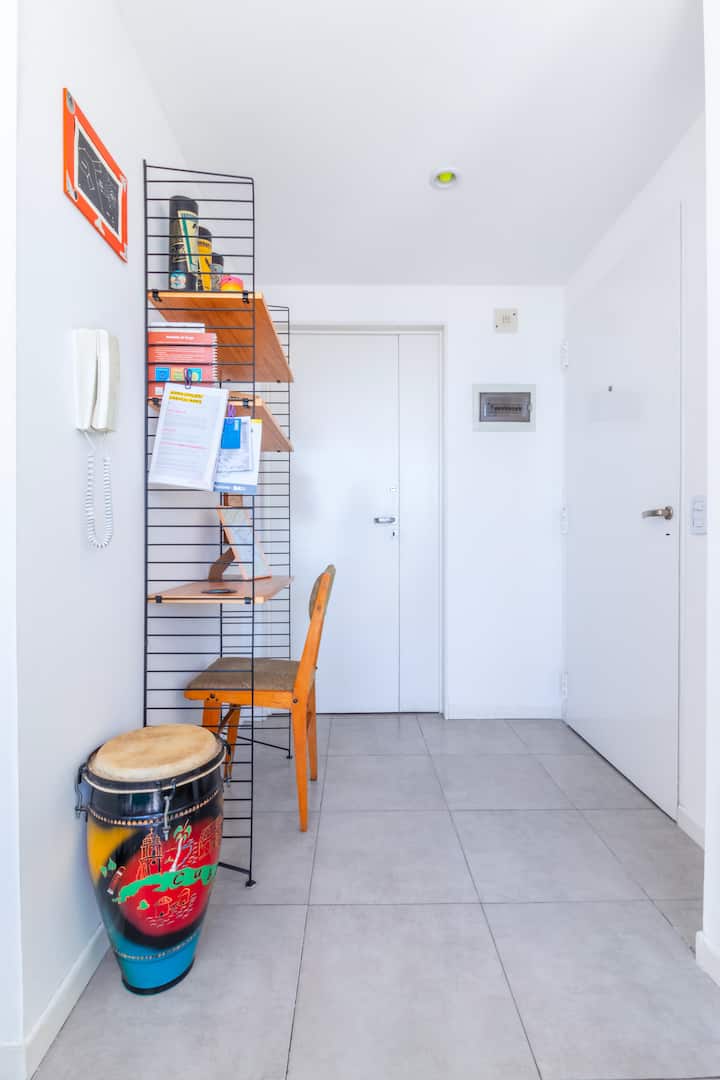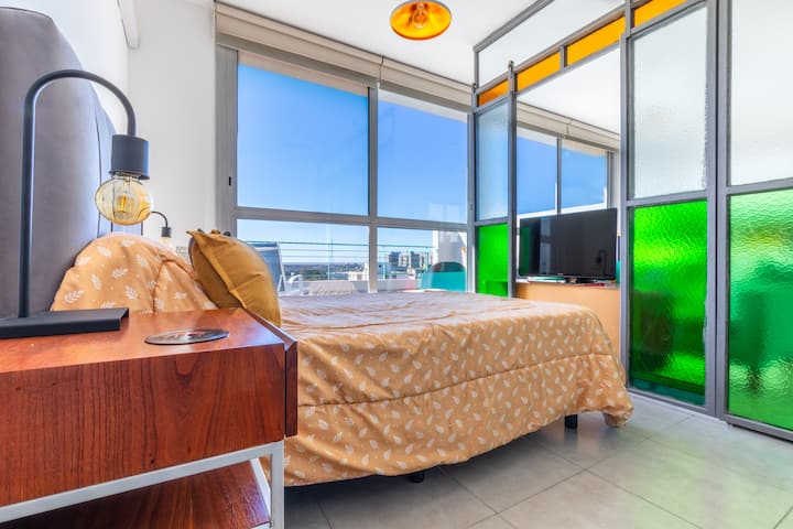 Квартира-студия на 13-м этаже в La Boca с собственной просторной террасой. Окна выходят с видом на Río de la Plata и Puerto Madero. Терраса открыта, выделено пространство со сплит-планировкой. Размещение между La Boca и San Telmo: в нескольких минутах от Parque Lezama, с остановкой Metrobus перед зданием.
