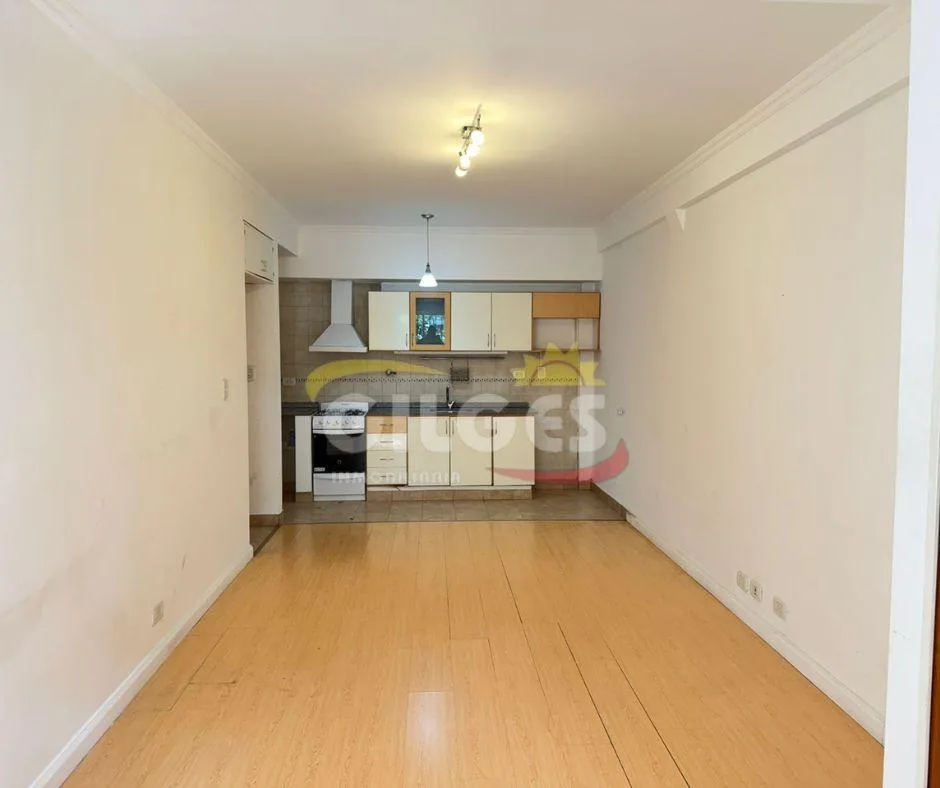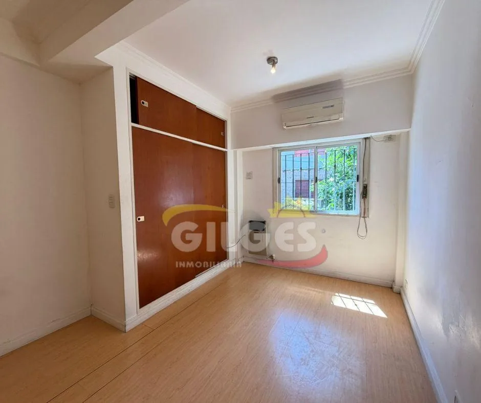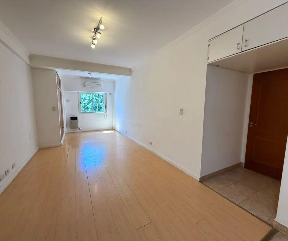 Квартира-студия площадью 1 комната в Ramos Mejia, окна на улицу. Расположена на первом этаже. В помещении паркет/покрытие пола «flotante», установлен кондиционер сплит и обогреватель (estufa). Есть шкаф (placard), кухня интегрирована, в ванной комнате установлена душевая перегородка (mampara). В здании предусмотрена общая терраса с зоной гриля (parrilla). Коммунальные платежи не указаны; указаны требования к аренде: требуется семейная собственническая гарантия или Sistema de Garantía Monclair S.