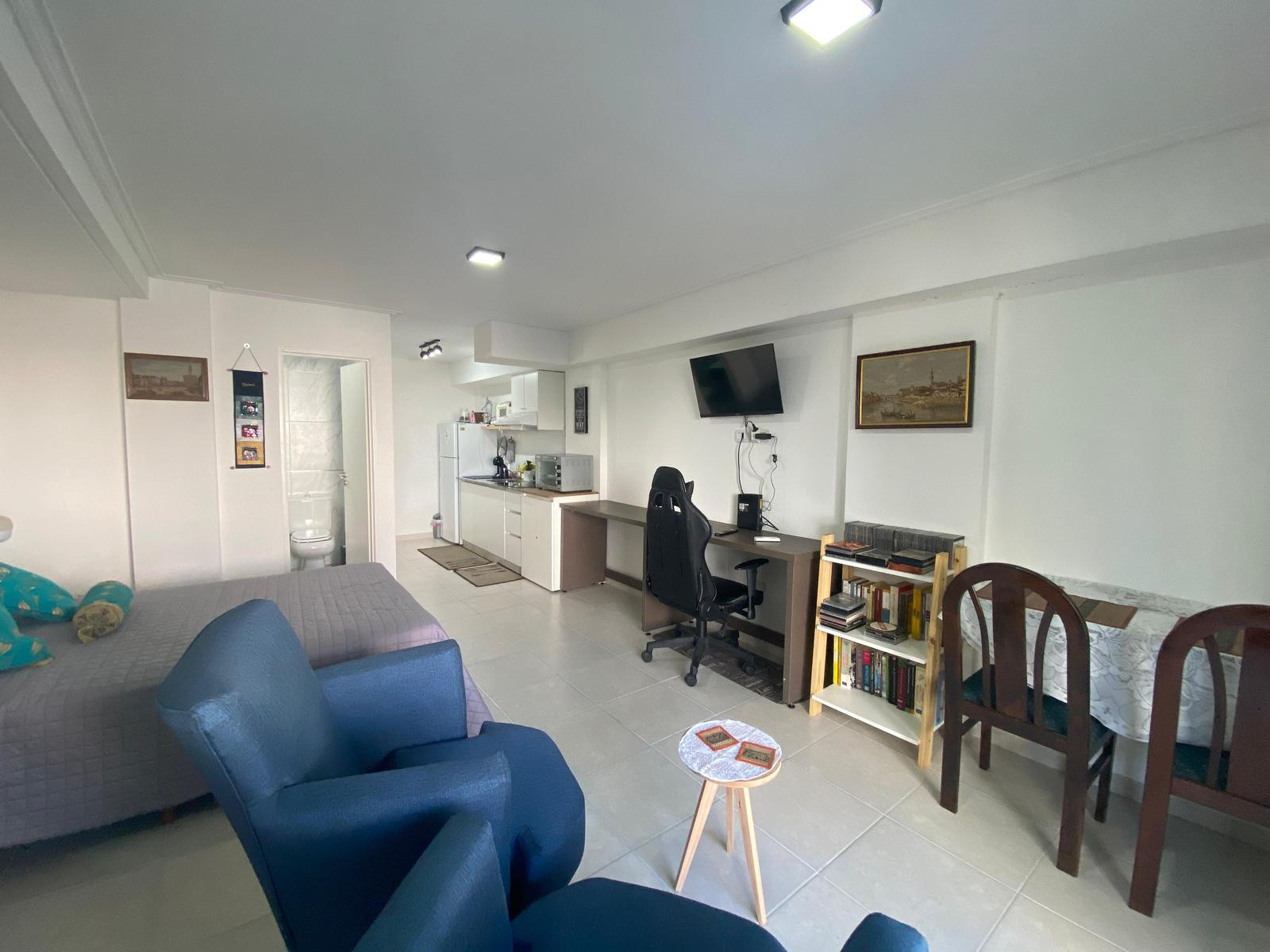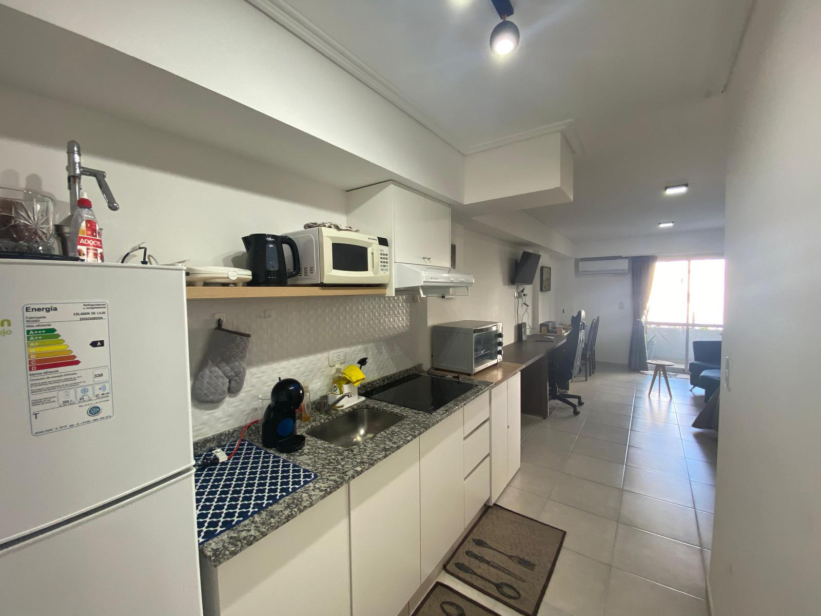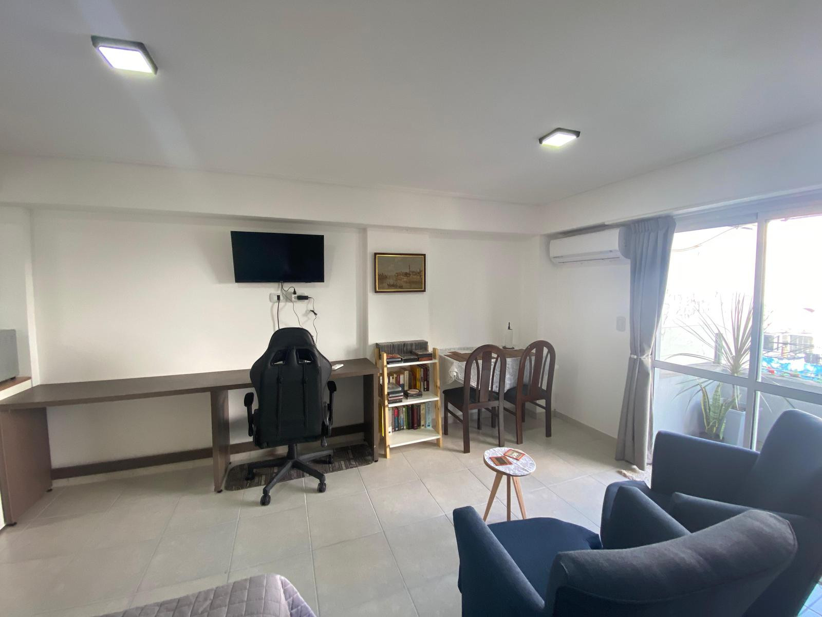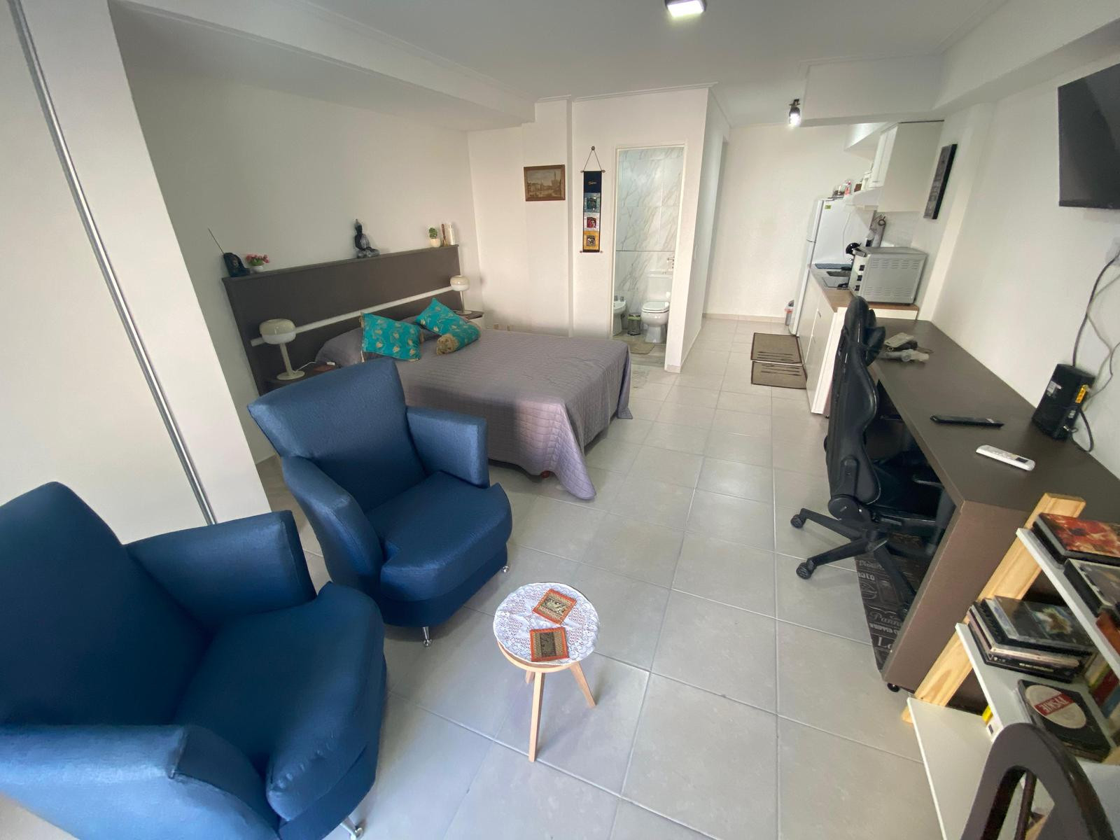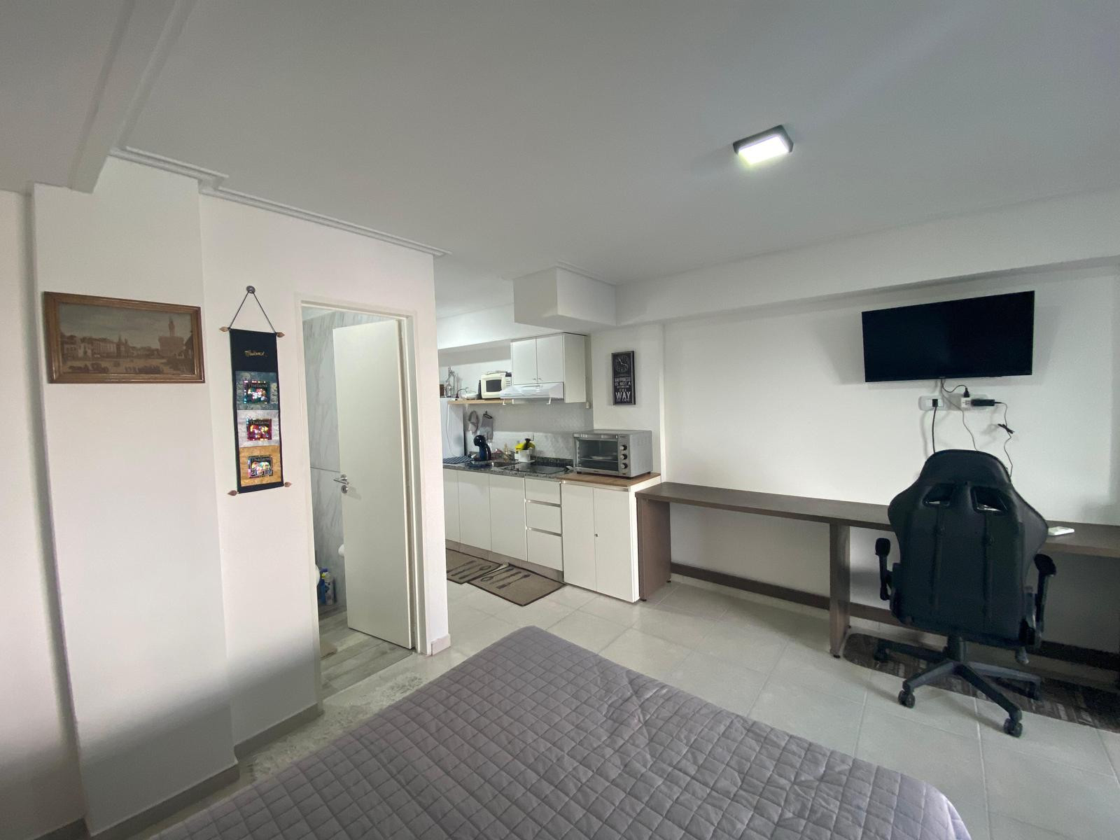 Квартира в аренду на временный срок в Lanús Oeste: студия с мебелью на 2-м этаже, окна на улицу и балкон с панорамным остеклением. Кухня с нижними и верхними шкафами, холодильником, электрической варочной панелью на 4 конфорки, электрической духовкой и микроволновой печью. В квартире предусмотрено место для электрического бойлера и стиральной машины (включены), в жилой зоне кровать 2-спального размера, прикроватные тумбы, шкаф с хранением, обеденный стол на 2 стула, два одноместных кресла и рабо