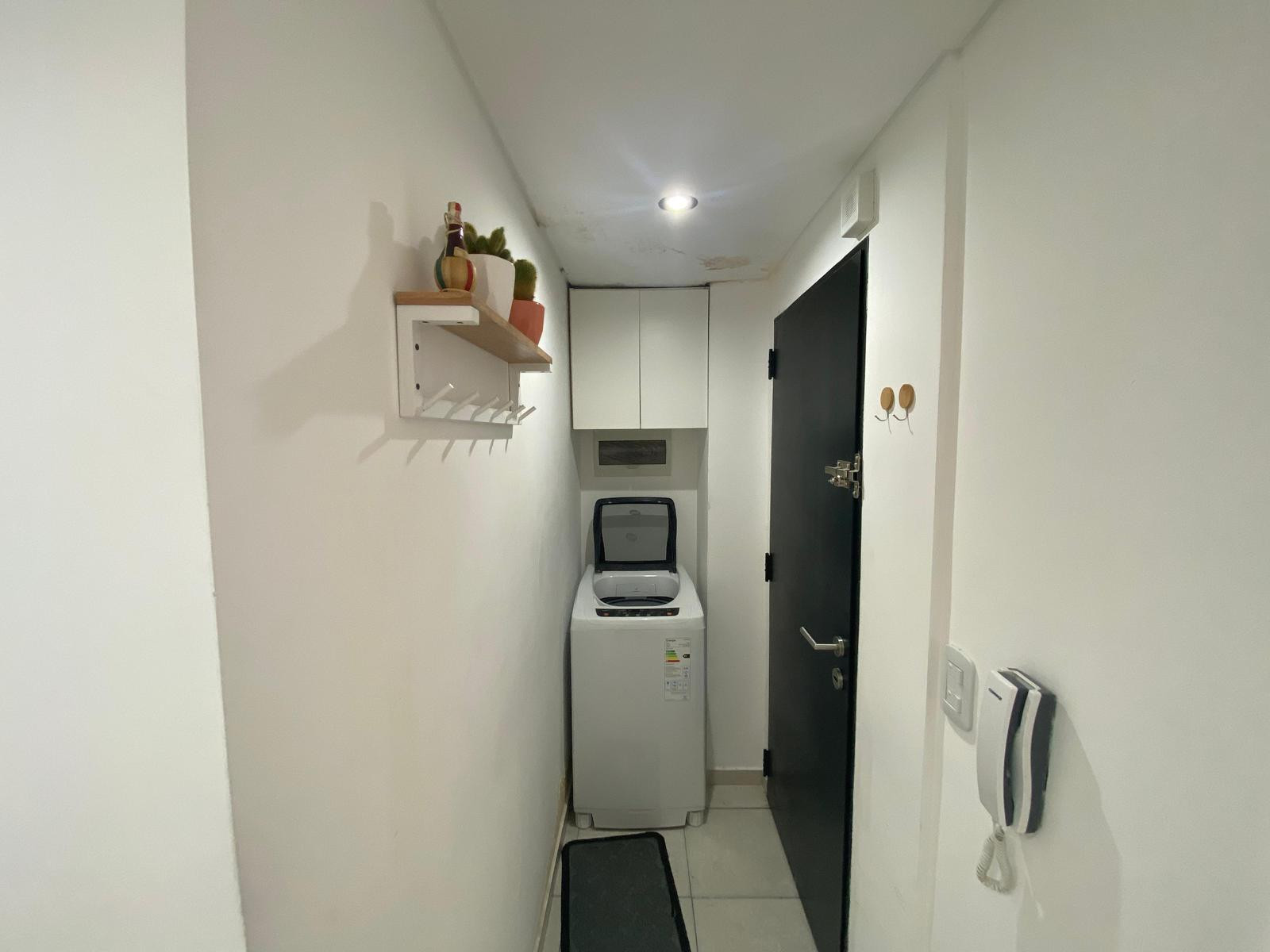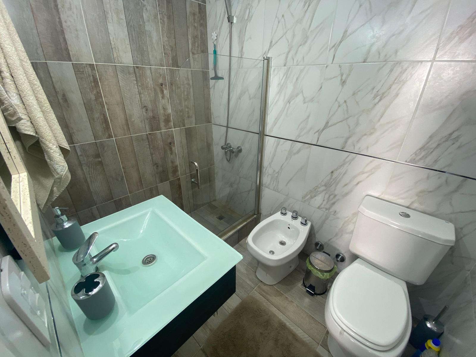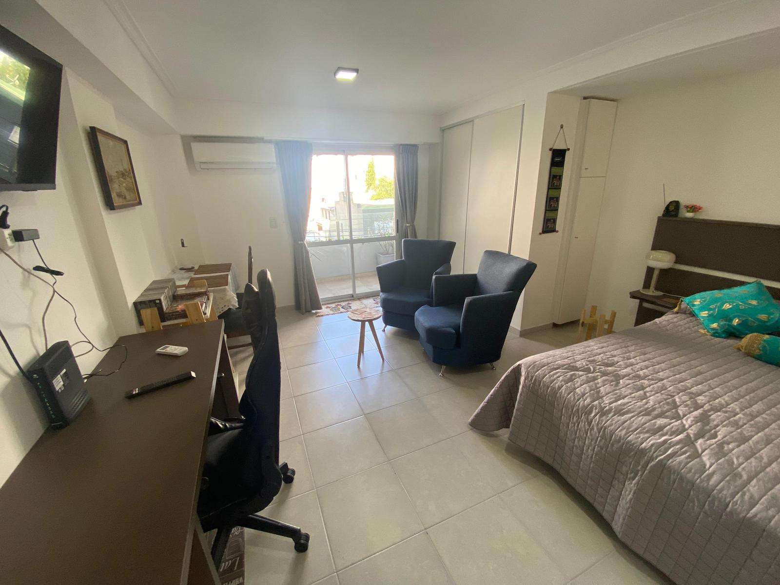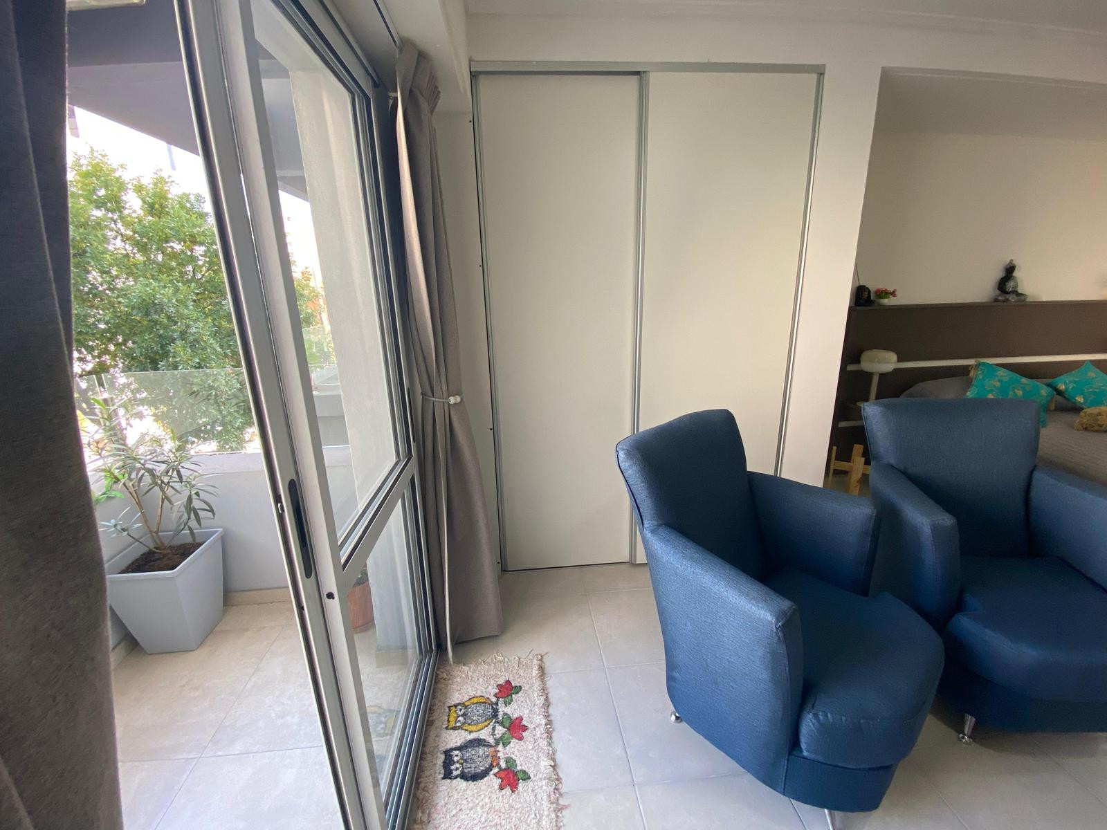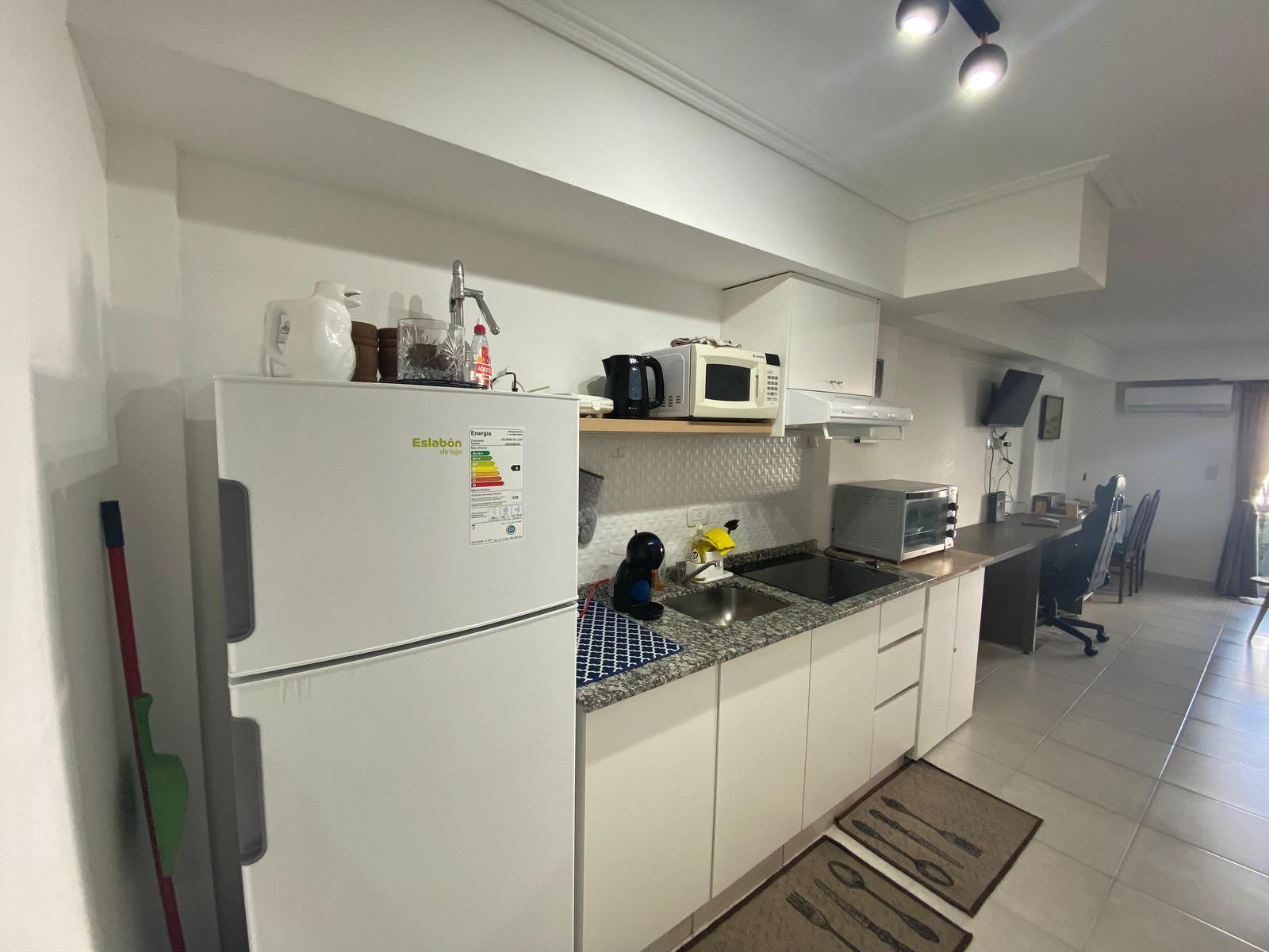 Квартира в аренду на временный срок в Lanús Oeste: студия с мебелью на 2-м этаже, окна на улицу и балкон с панорамным остеклением. Кухня с нижними и верхними шкафами, холодильником, электрической варочной панелью на 4 конфорки, электрической духовкой и микроволновой печью. В квартире предусмотрено место для электрического бойлера и стиральной машины (включены), в жилой зоне кровать 2-спального размера, прикроватные тумбы, шкаф с хранением, обеденный стол на 2 стула, два одноместных кресла и рабо