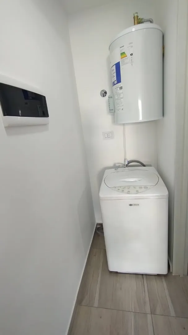 Квартира-студия на новом объекте в Lomas de Zamora. Площадь, этаж и ориентация не указаны. В квартире керамические полы и отделка, кухонный гарнитур с нижними и верхними секциями, зона для стирки с бойлером, санузел с сантехникой Ferrum, зеркалом и смесителями FV. Установлены светильники, стиральная машина, очиститель воздуха (SPAR), кондиционер холод/тепло и решётки. Арендная стоимость и коммунальные платежи указаны с учётом света: аренда + налоги + коммунальные платежи, свет включён примерно н