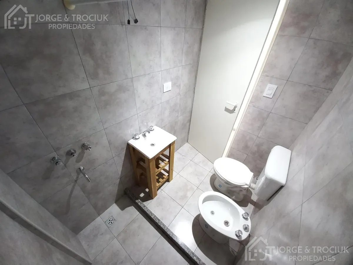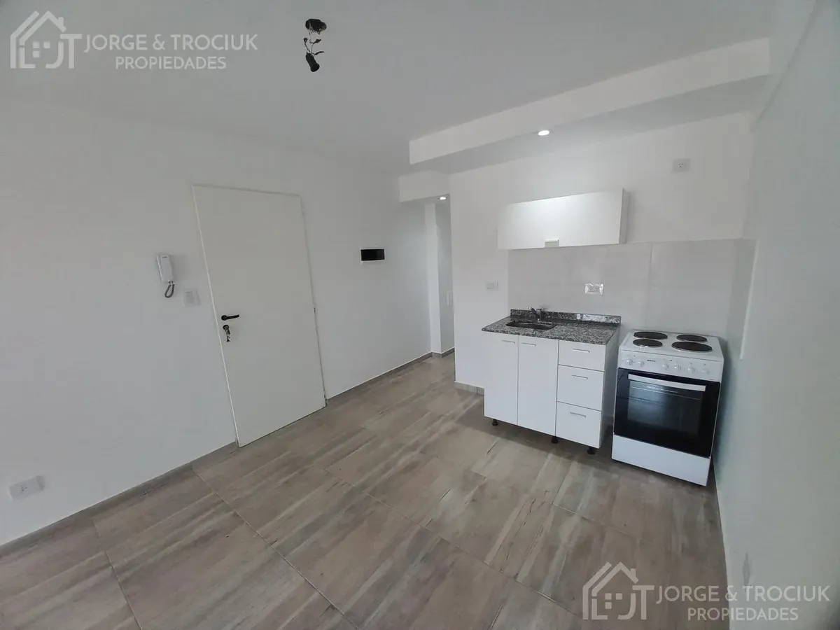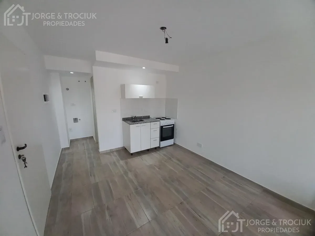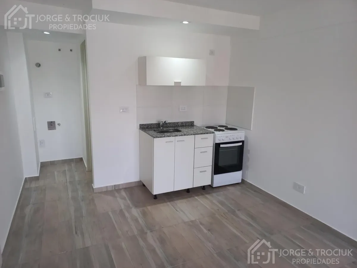 Квартира-студия в аренду в Lomas de Zamora, окна на улицу, первая лестничная площадка. Кухня-гостиная с полной мебелью и мраморной столешницей, электрическая плита, бойлер-водонагреватель и предварительная подготовка под установку кондиционера. Есть балкон с видом на улицу и отдельная установленная ванная комната с аксессуарами и зеркалом. В описании указаны электрическое здание и условия аренды: пожарное страхование и залог-страховка аренды или гарантия собственника, арендная плата плюс коммун