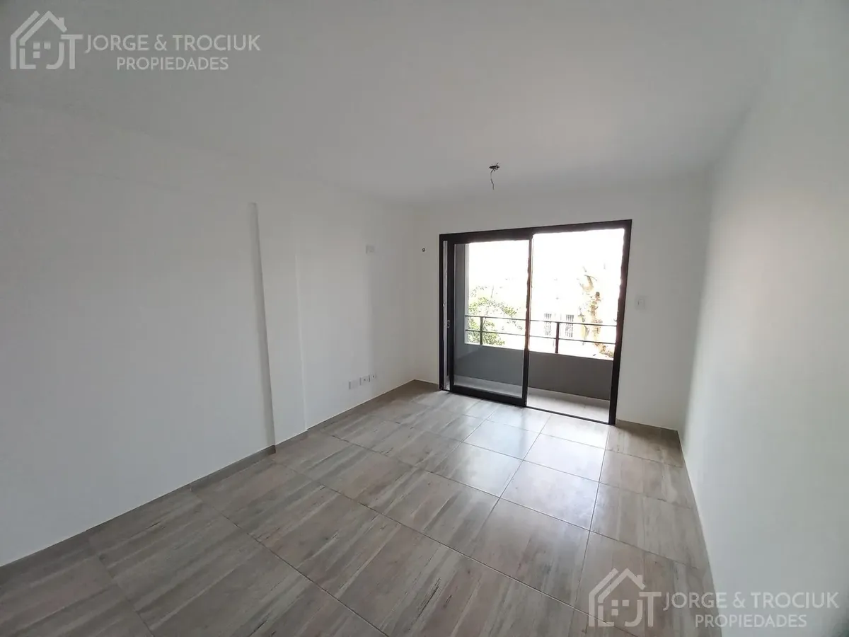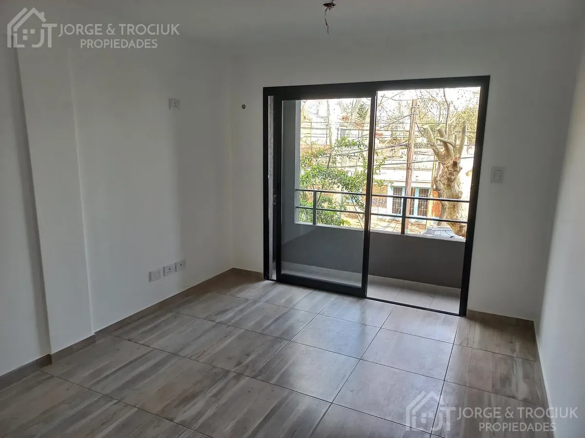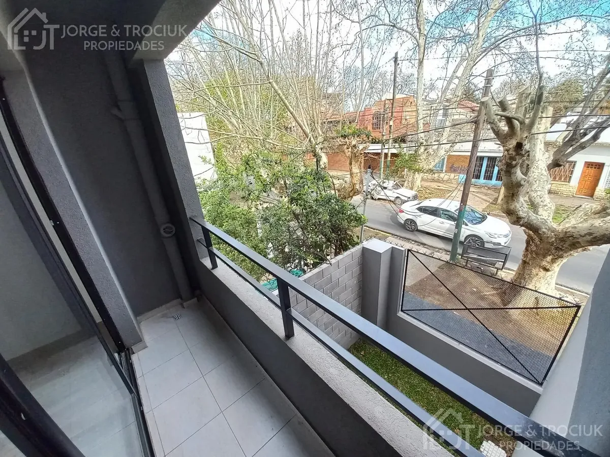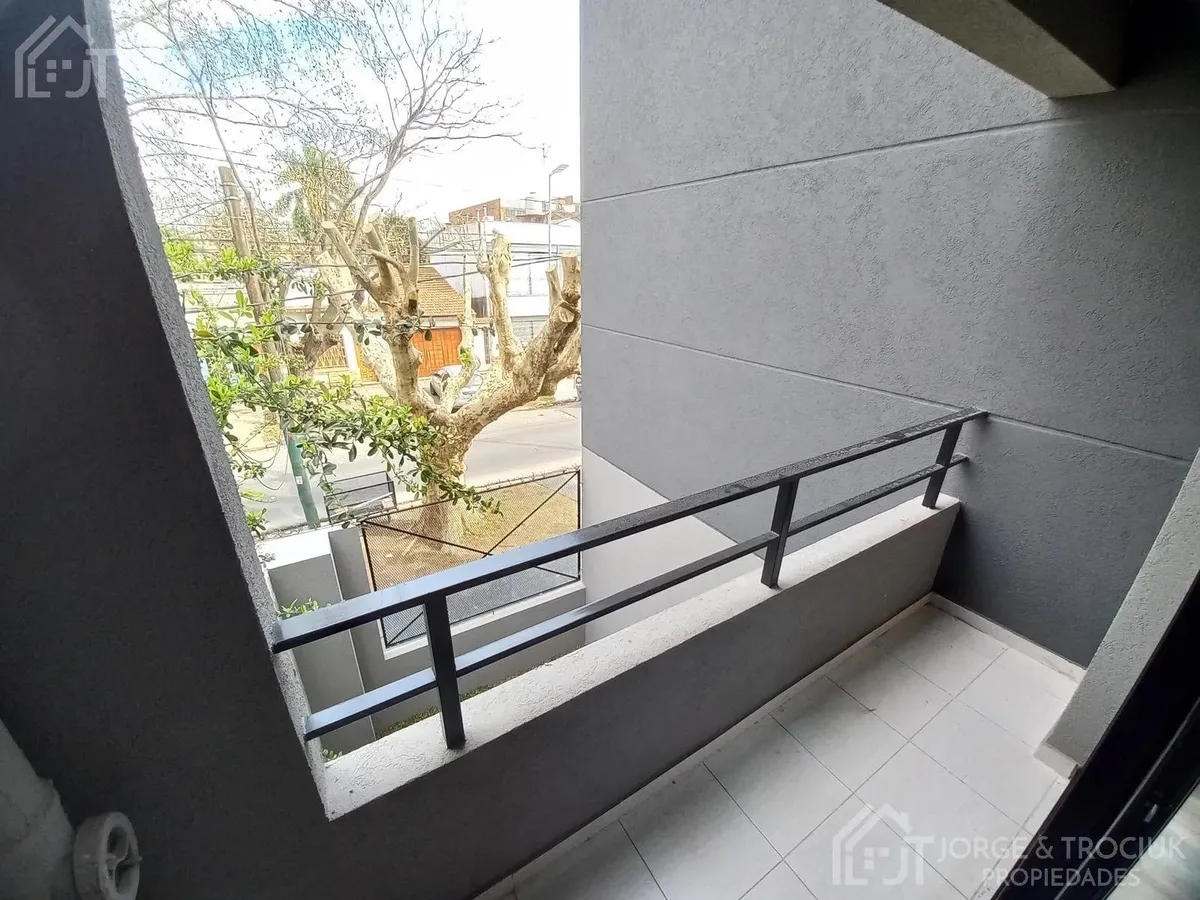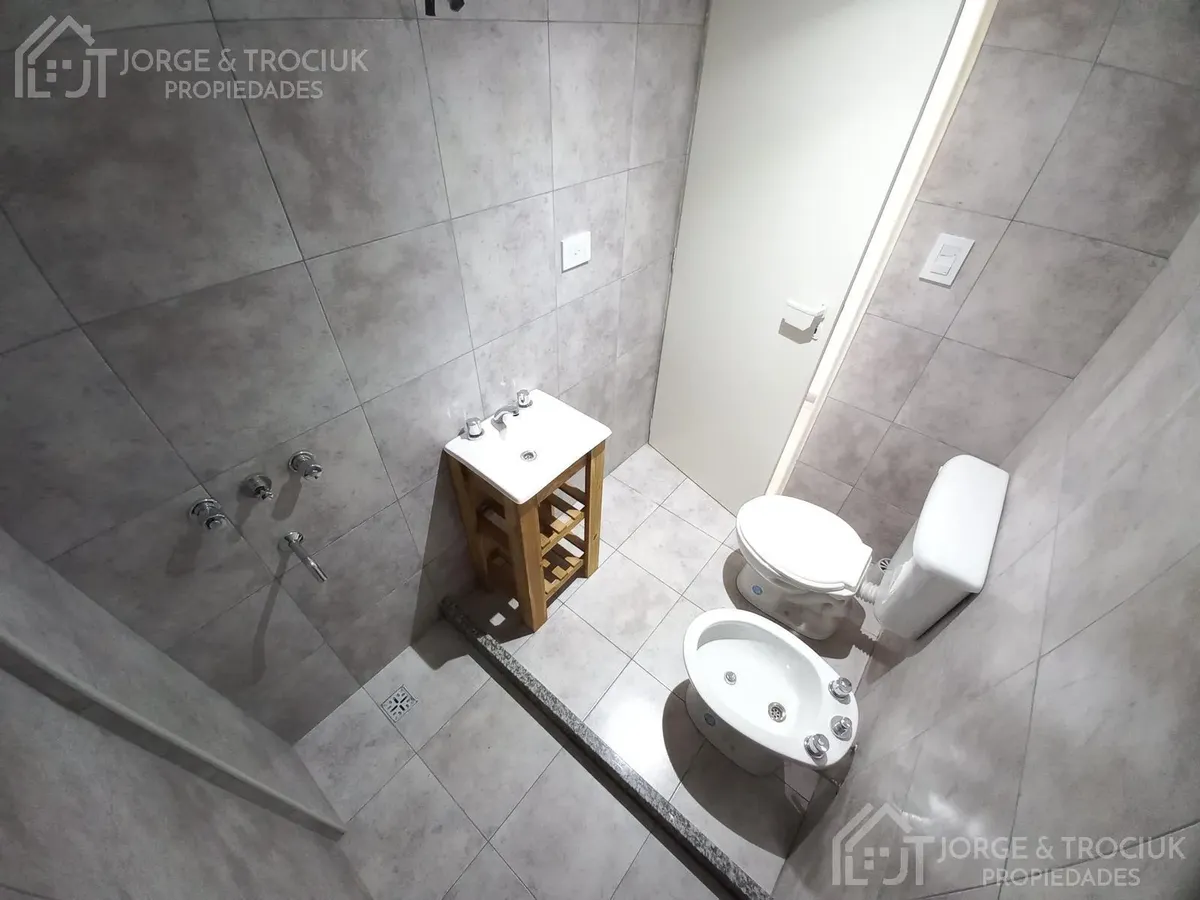 Квартира-студия в аренду в Lomas de Zamora, окна на улицу, первая лестничная площадка. Кухня-гостиная с полной мебелью и мраморной столешницей, электрическая плита, бойлер-водонагреватель и предварительная подготовка под установку кондиционера. Есть балкон с видом на улицу и отдельная установленная ванная комната с аксессуарами и зеркалом. В описании указаны электрическое здание и условия аренды: пожарное страхование и залог-страховка аренды или гарантия собственника, арендная плата плюс коммун