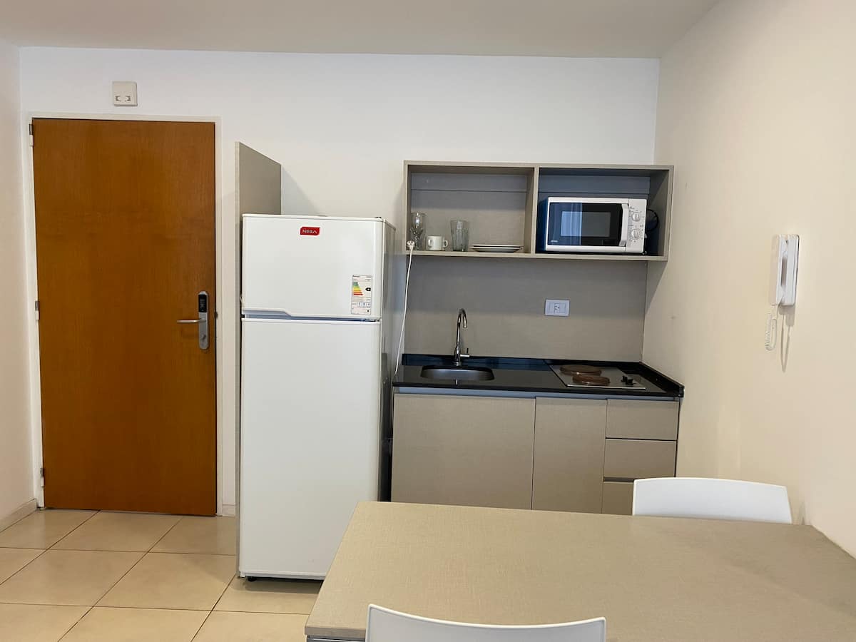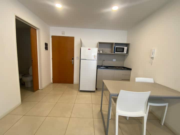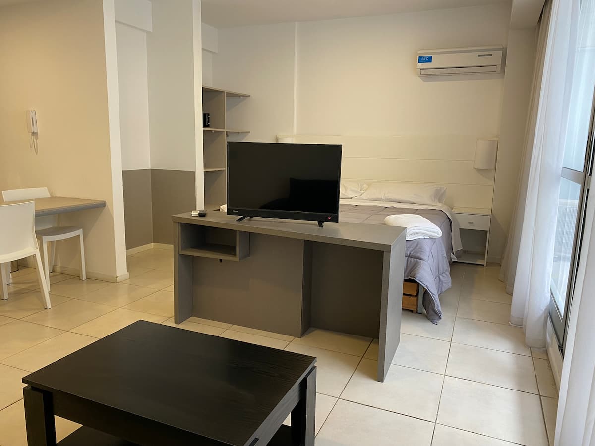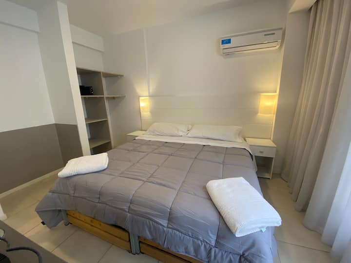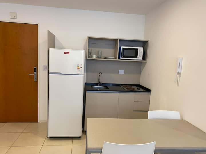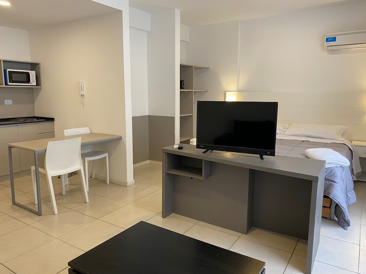 Квартира-студия с балконом в здании, открытом в марте 2018 года. Площадь и этаж не указаны. Вмещает до 2 человек: двуспальная кровать, стол/рабочая зона и стулья. Есть кухонная утварь, посуда и собственная ванная комната.