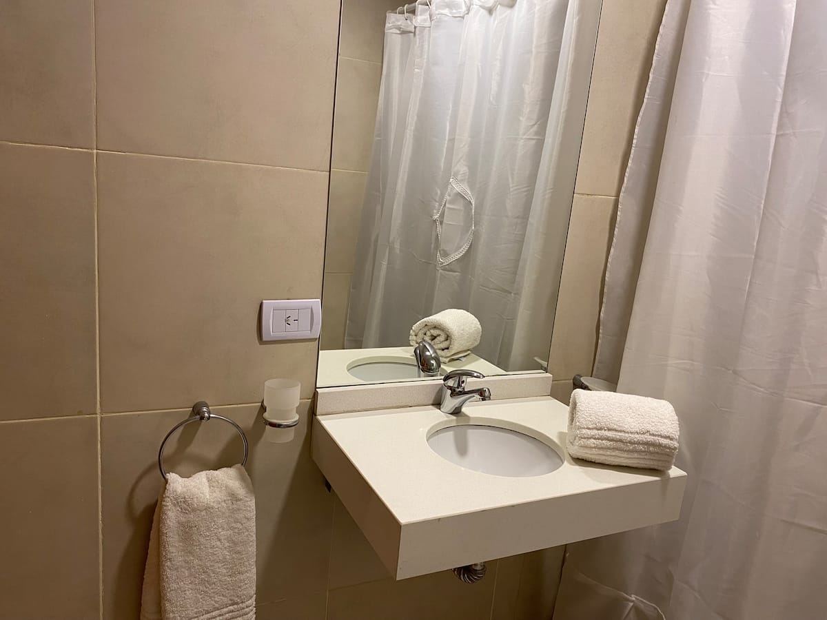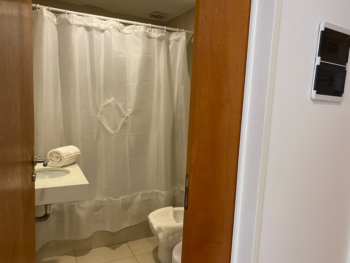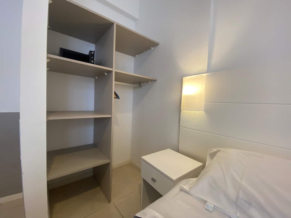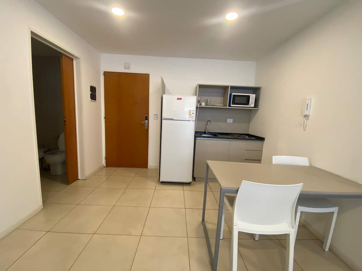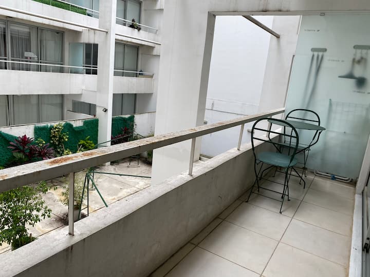 Квартира-студия с балконом в здании, открытом в марте 2018 года. Площадь и этаж не указаны. Вмещает до 2 человек: двуспальная кровать, стол/рабочая зона и стулья. Есть кухонная утварь, посуда и собственная ванная комната.