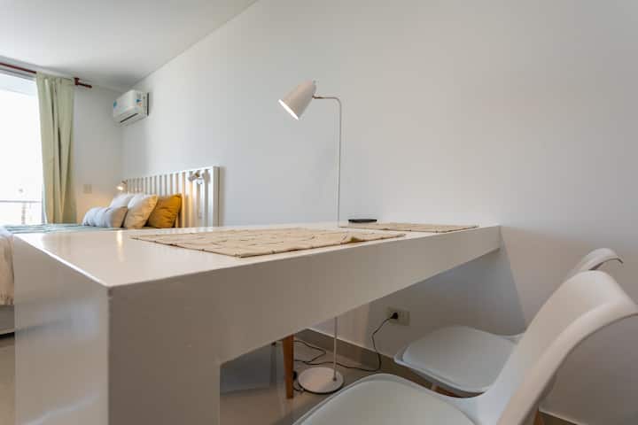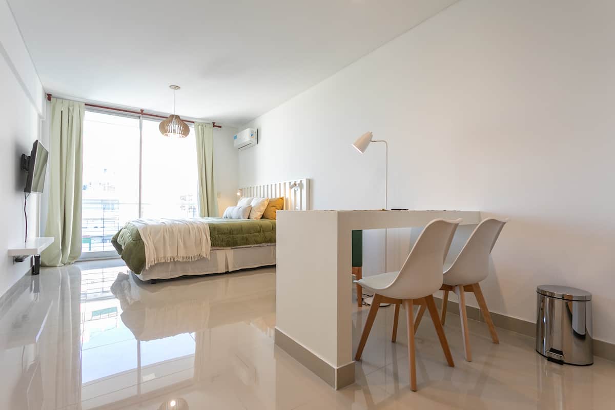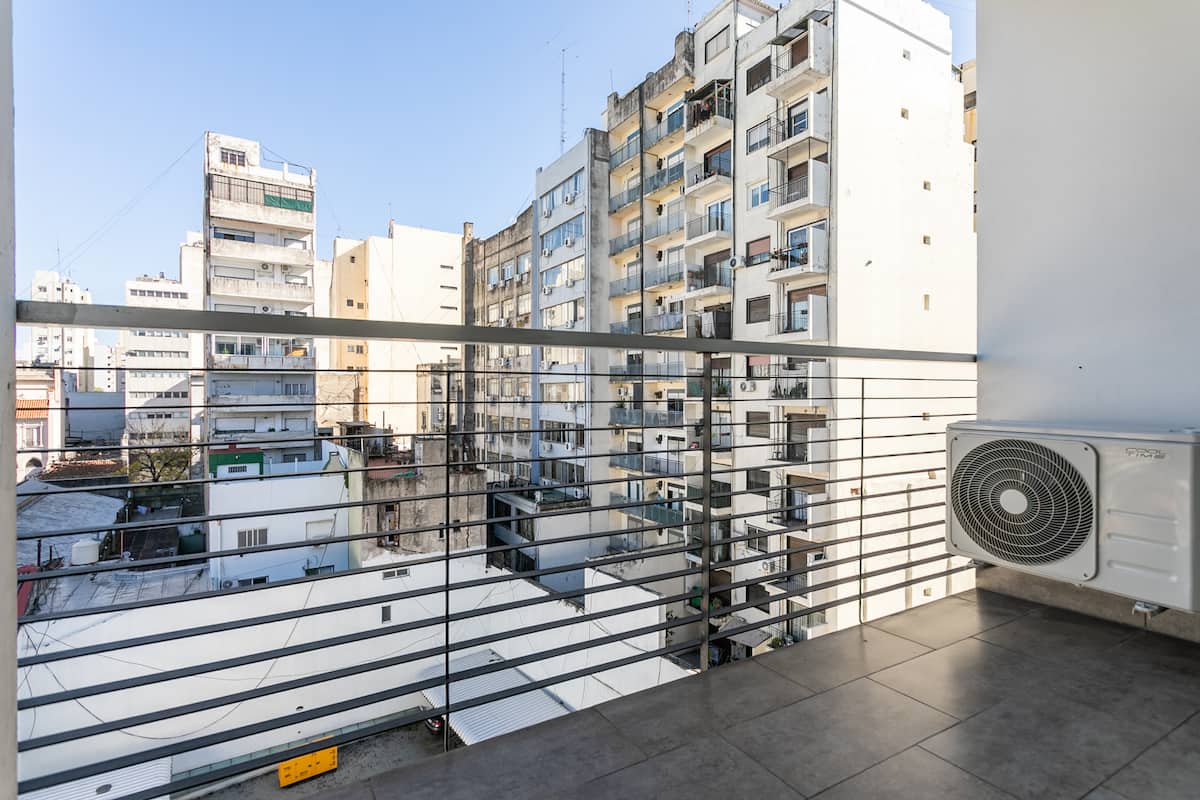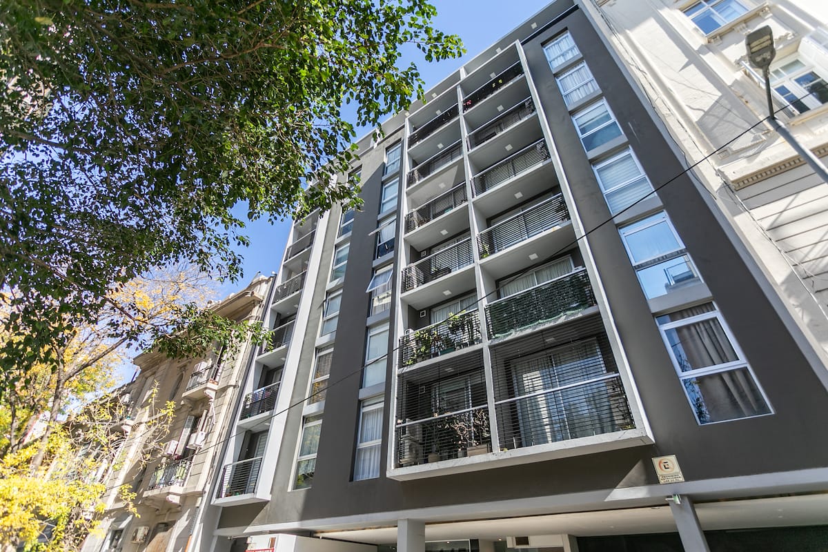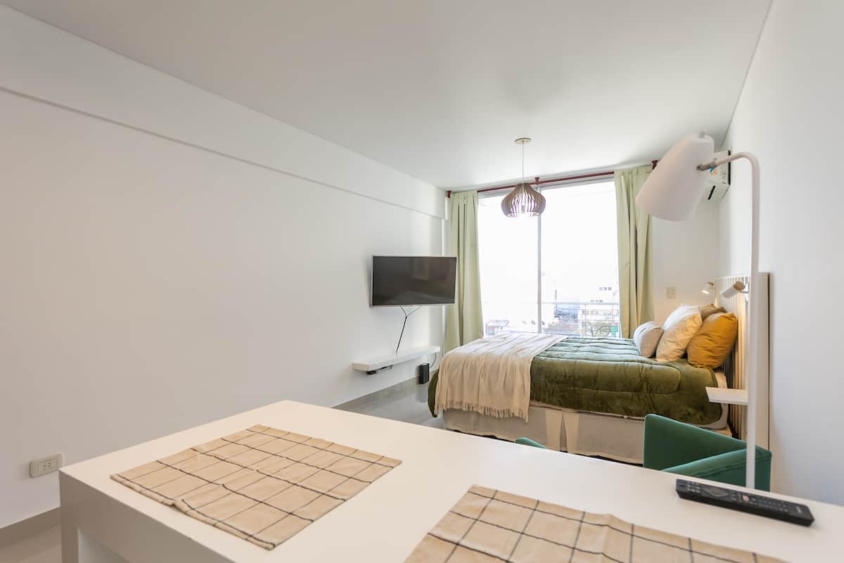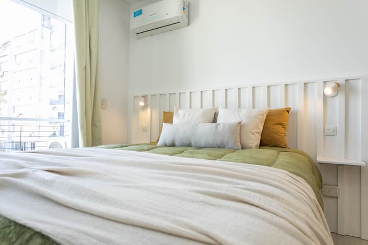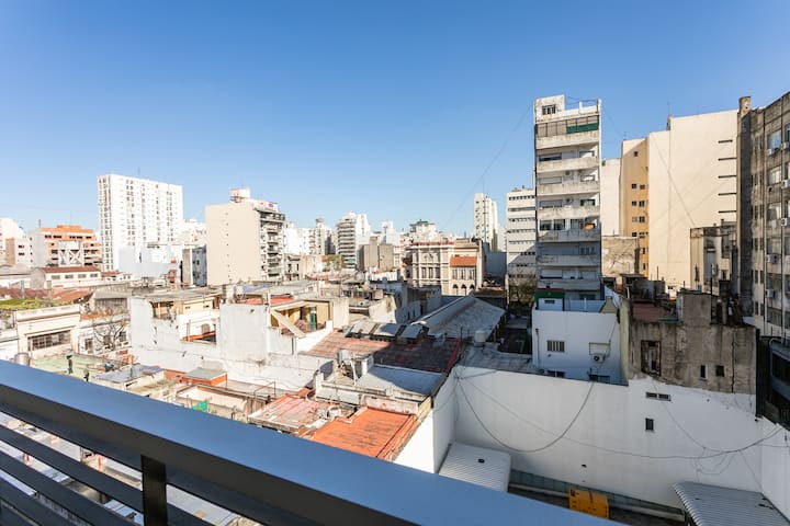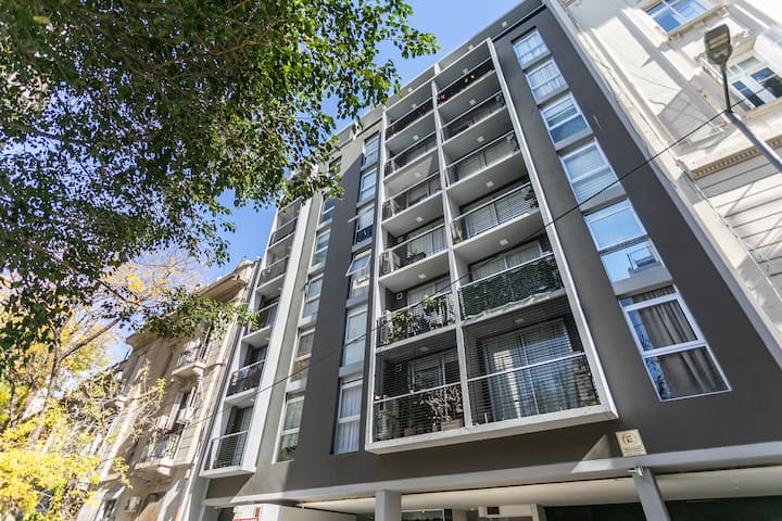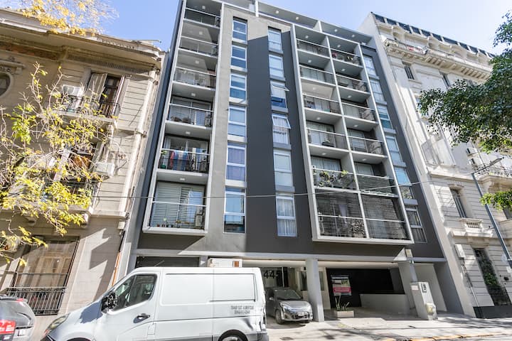 Квартира-студия в Monserrat. По описанию: новая, окна выходят внутрь квартала и поэтому тише, чем улица. В числе удобств (по тексту) парковочное место и кровать размера Queen (200×160). Расстояние указано как 100 метров до Fundación Favaloro, 5 кварталов до Congreso и 1 km до San Telmo, с удобным доступом к общественному транспорту через Av. 9 de Julio.