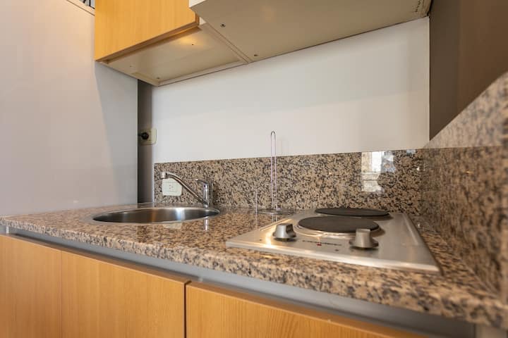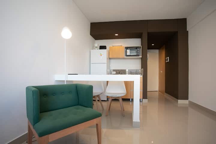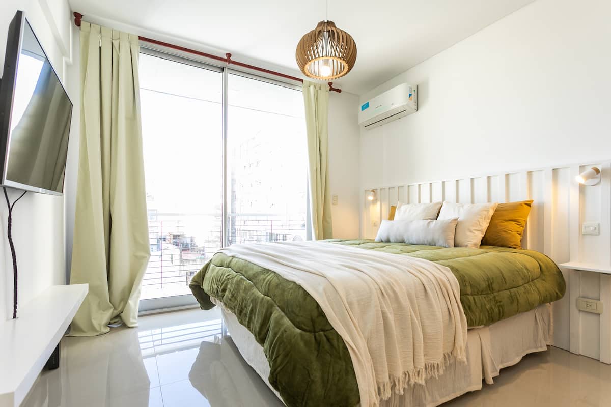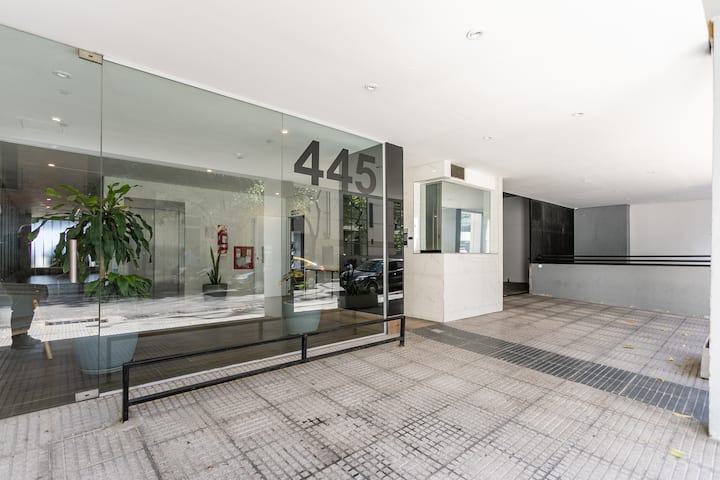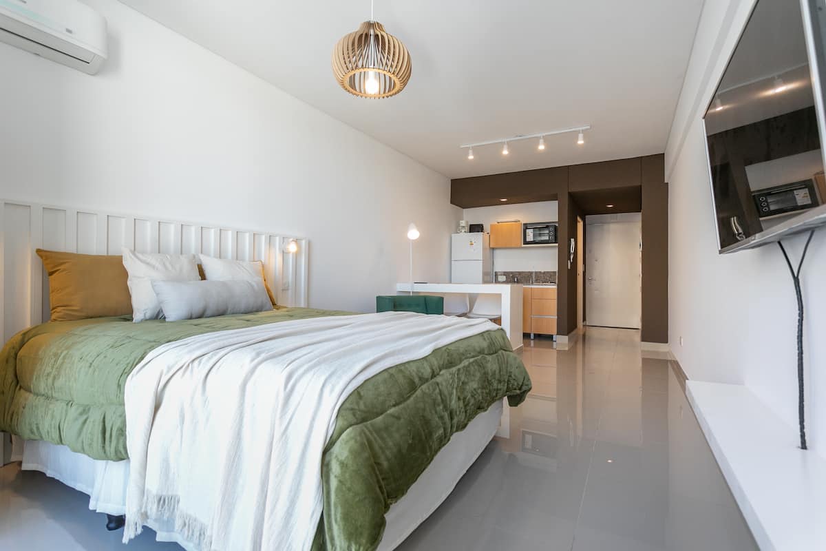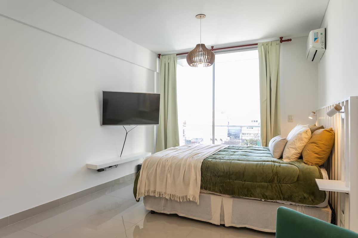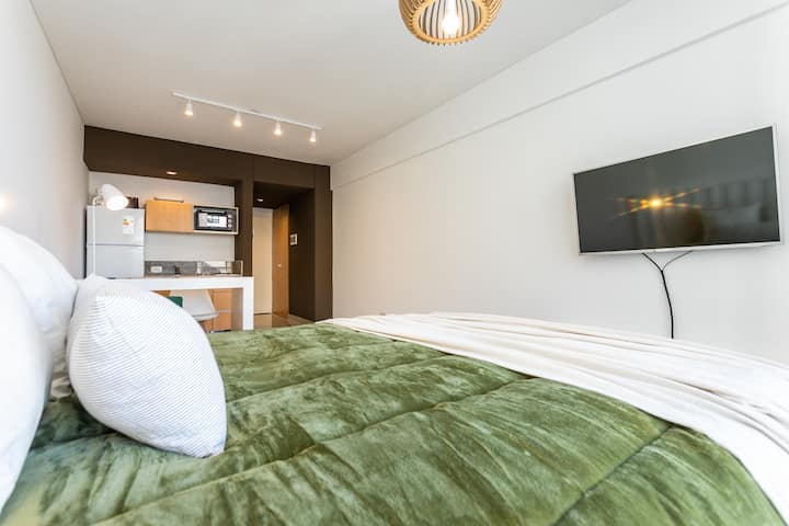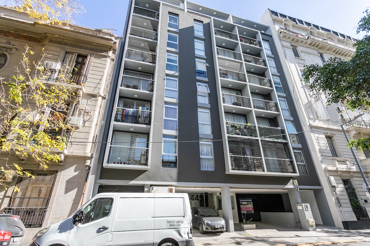 Квартира-студия в Monserrat. По описанию: новая, окна выходят внутрь квартала и поэтому тише, чем улица. В числе удобств (по тексту) парковочное место и кровать размера Queen (200×160). Расстояние указано как 100 метров до Fundación Favaloro, 5 кварталов до Congreso и 1 km до San Telmo, с удобным доступом к общественному транспорту через Av. 9 de Julio.