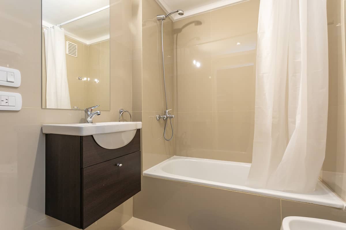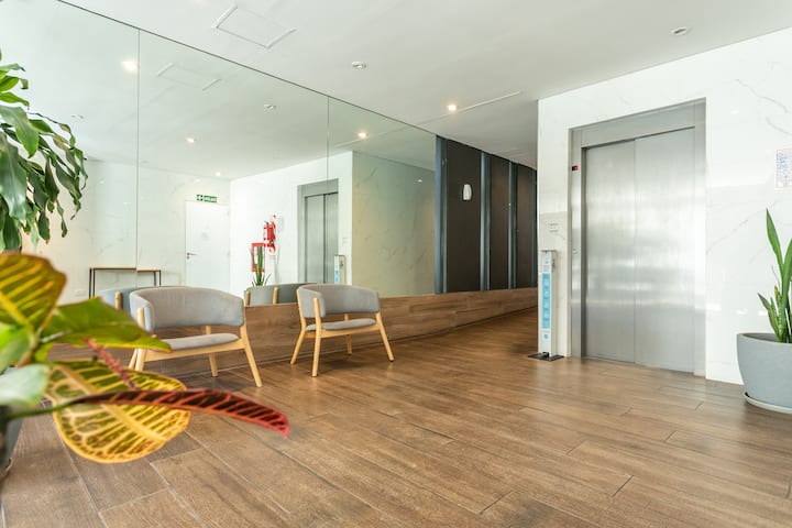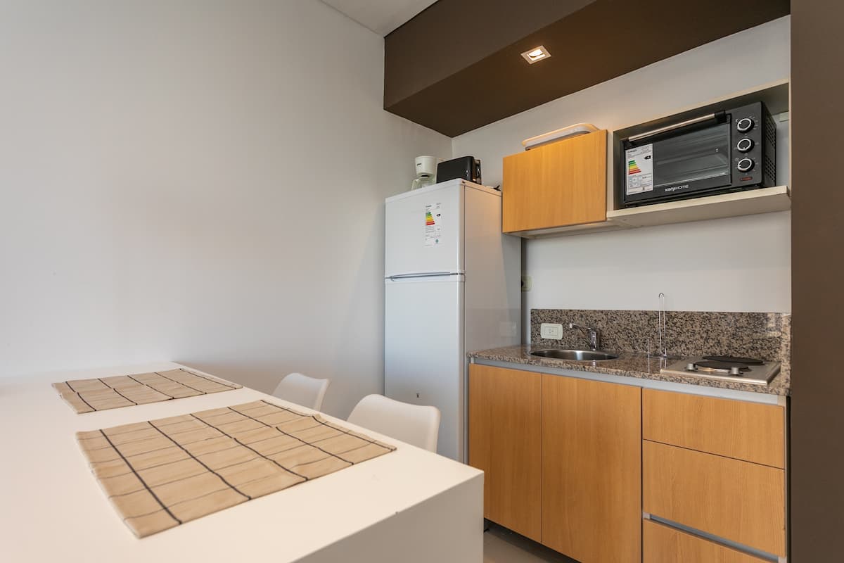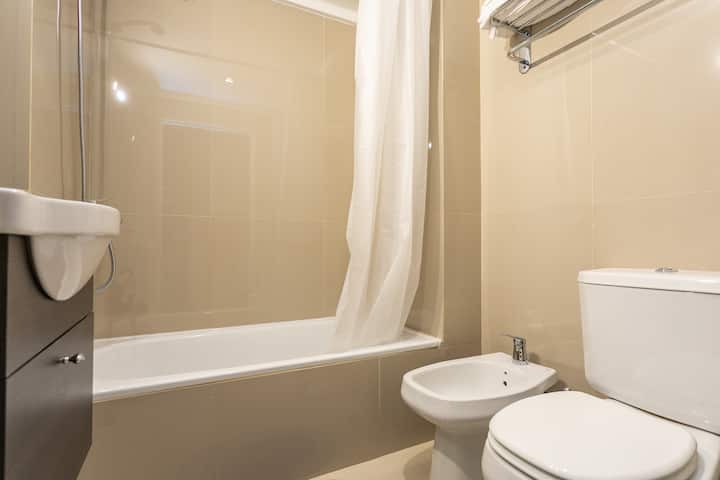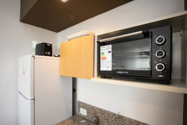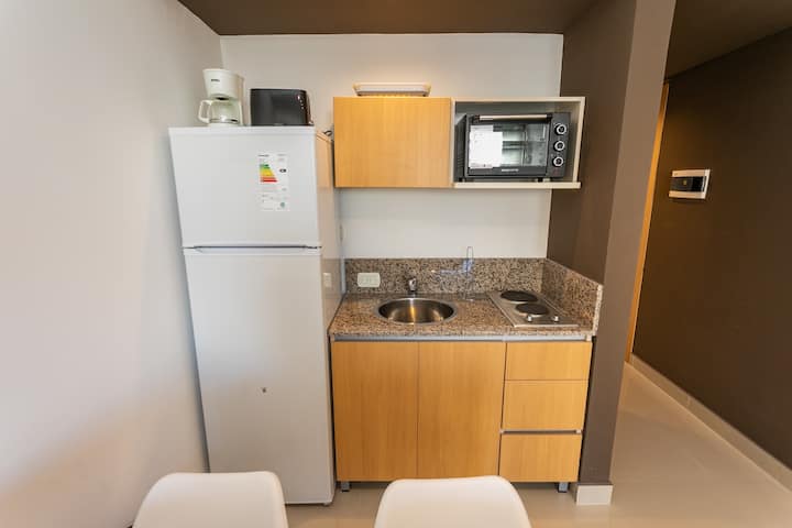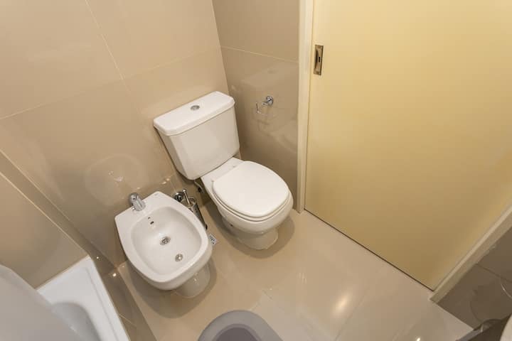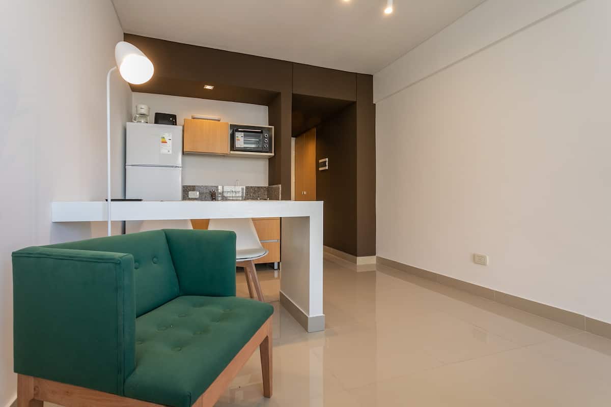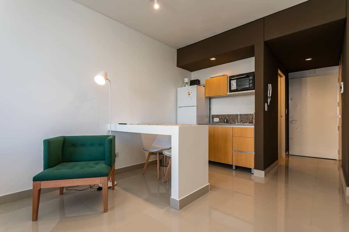 Квартира-студия в Monserrat. По описанию: новая, окна выходят внутрь квартала и поэтому тише, чем улица. В числе удобств (по тексту) парковочное место и кровать размера Queen (200×160). Расстояние указано как 100 метров до Fundación Favaloro, 5 кварталов до Congreso и 1 km до San Telmo, с удобным доступом к общественному транспорту через Av. 9 de Julio.
