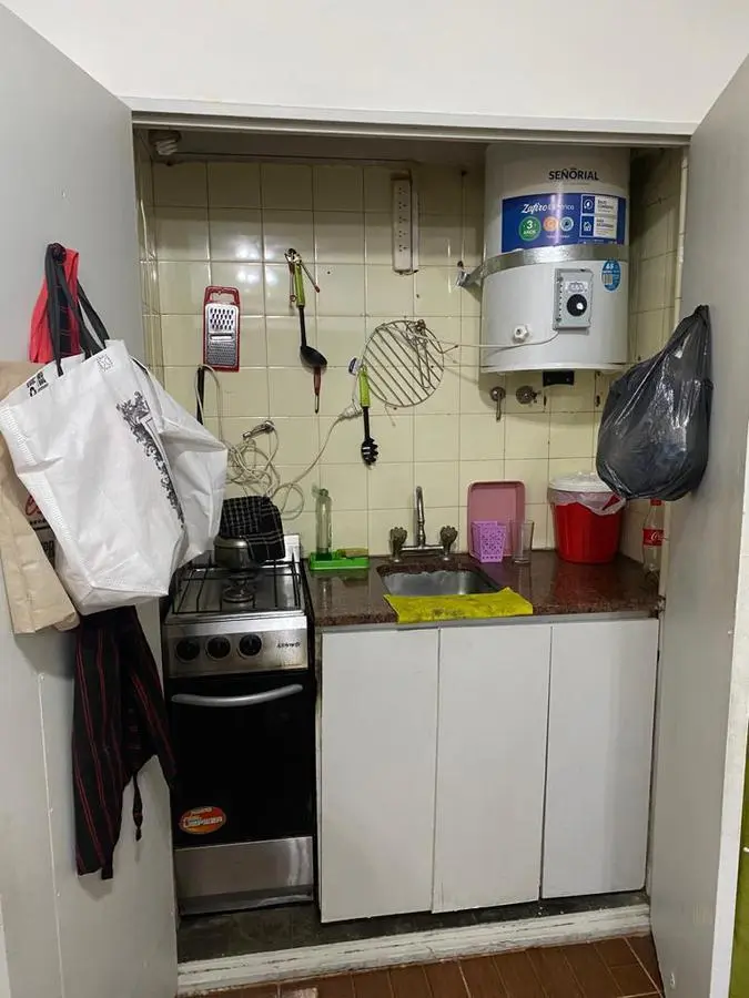 Квартира-студия площадью 1 комната в San Nicolás, окна во двор (contrafrente). Планировка включает входной холл со шкафом, мини-кухню (kichinette) и полноценную ванную комнату. После свежей покраски, полы из керамической плитки. Коммунальные платежи здания составляют $220.000.