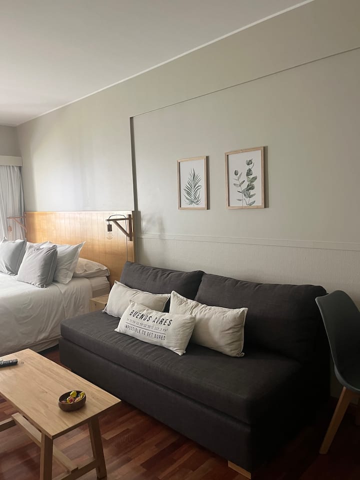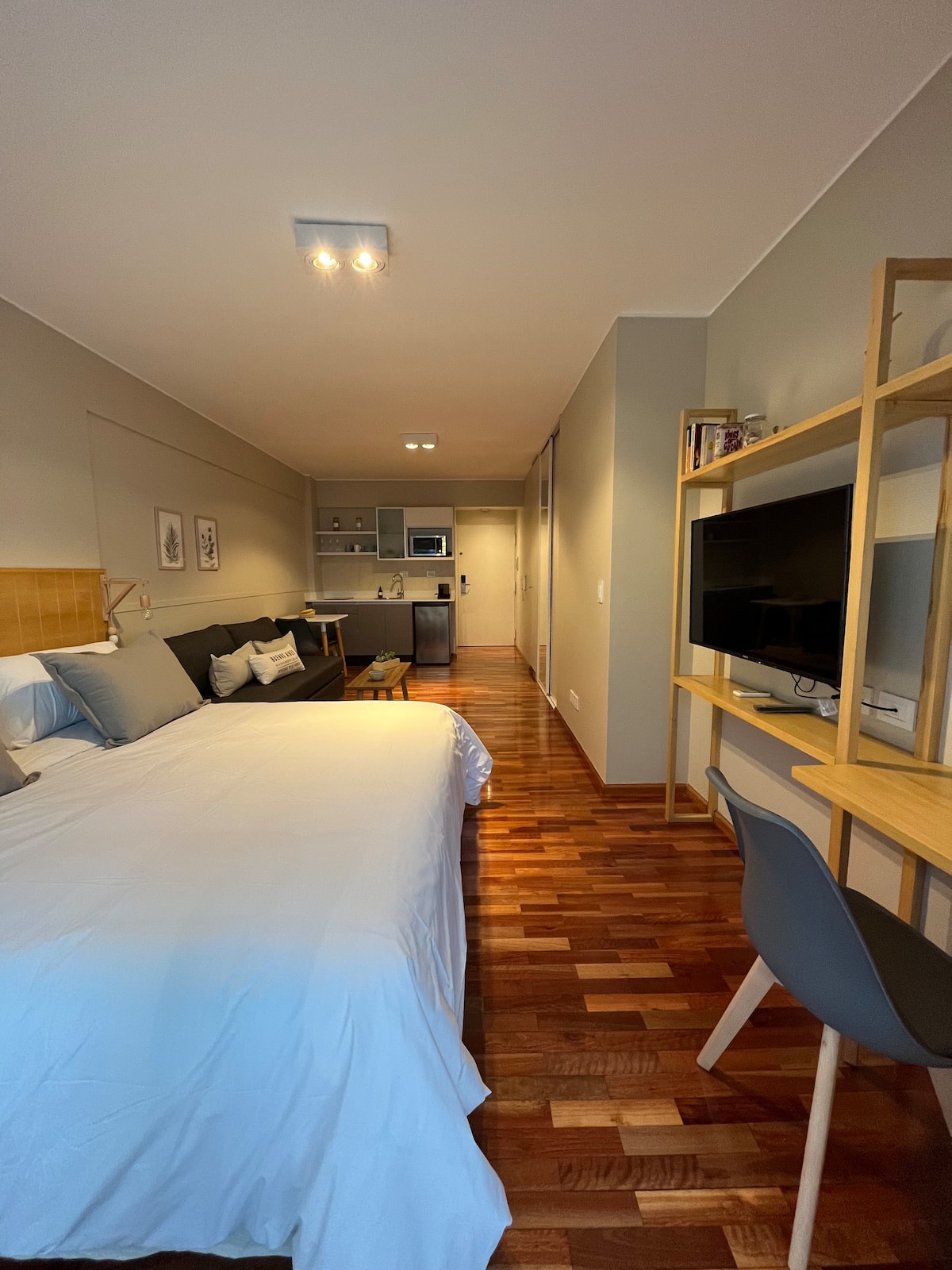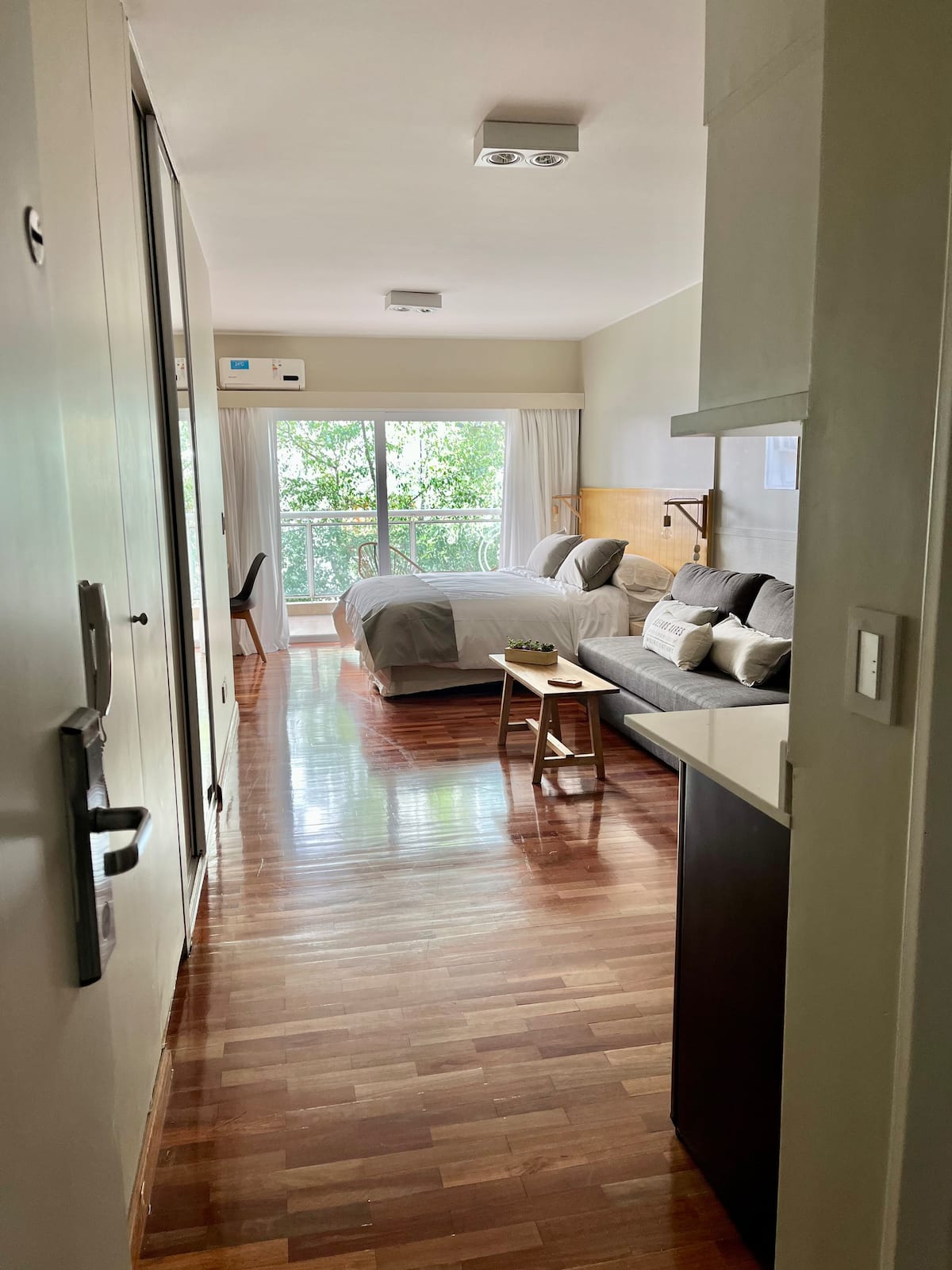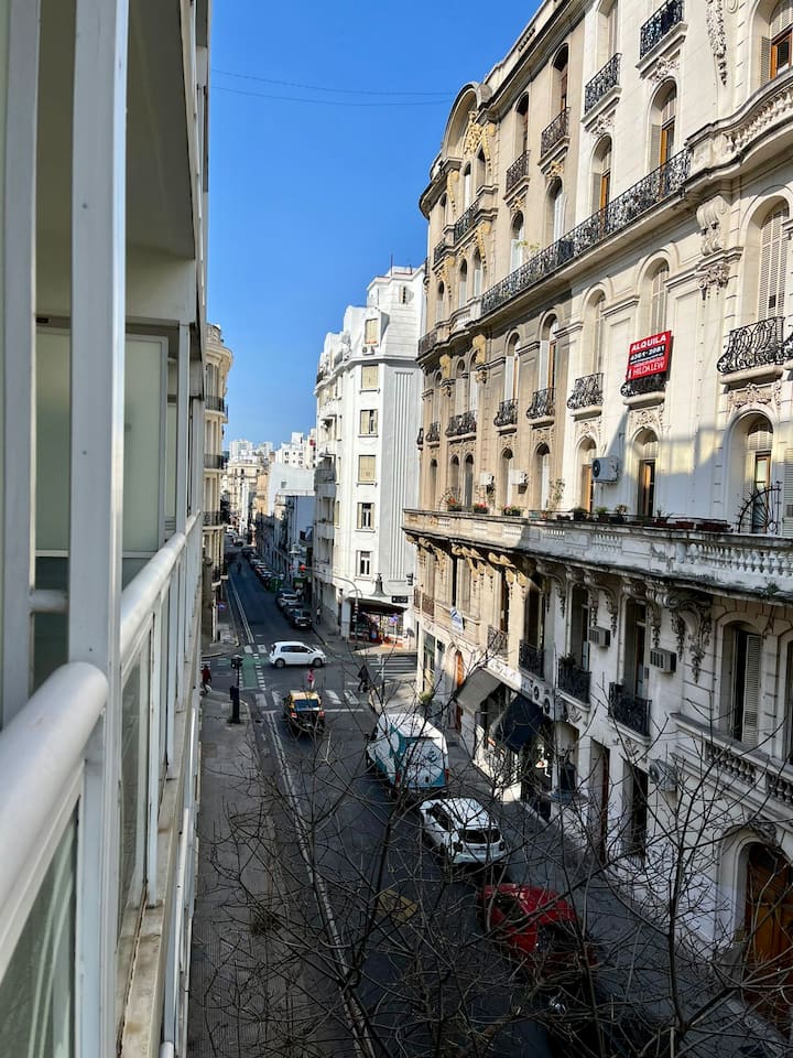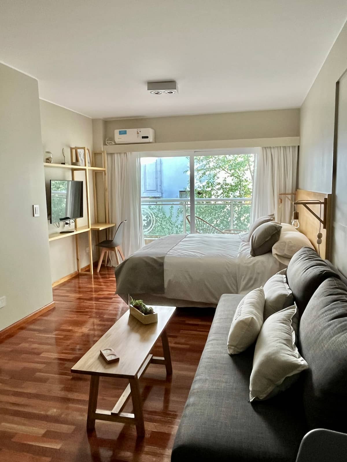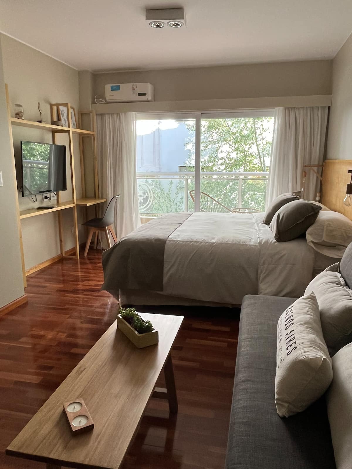 Квартира-студия площадью 50 m² в Monserrat, в здании с кухонной зоной для приготовления и приёма пищи. Окна выходят на Av 9 de Julio: расстояние указано как 50 метров. В студии есть рабочий стол, Wi-Fi, кровать king size; по запросу заранее возможна компоновка в 2 раздельные кровати. Указана мебель: кресло, которое может трансформироваться в спальное место. В описании также упоминается близость UADE University, UCA, Subte и Metrobus, а также Plaza Dorrego, Calle Defensa и Obelisco.